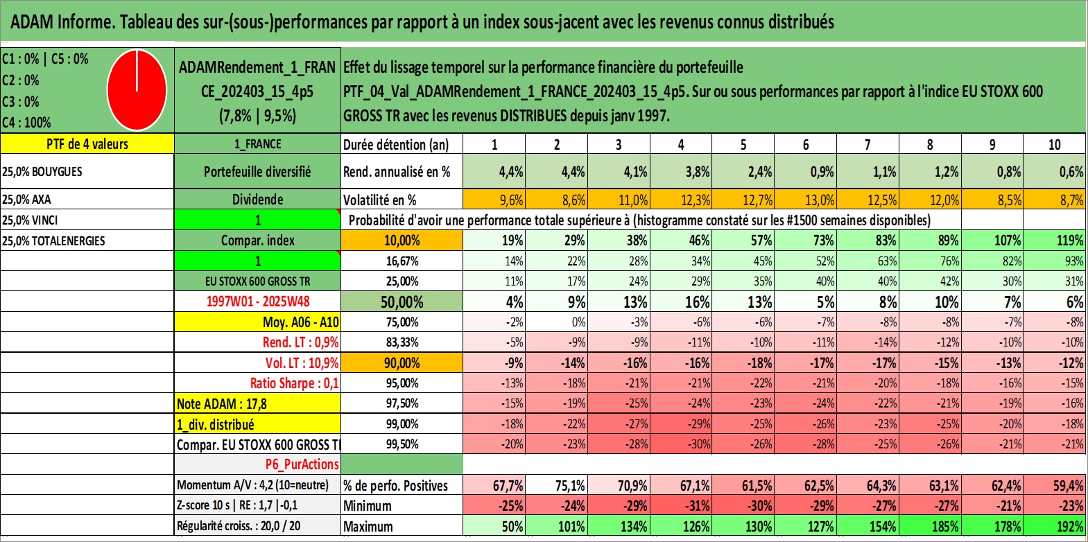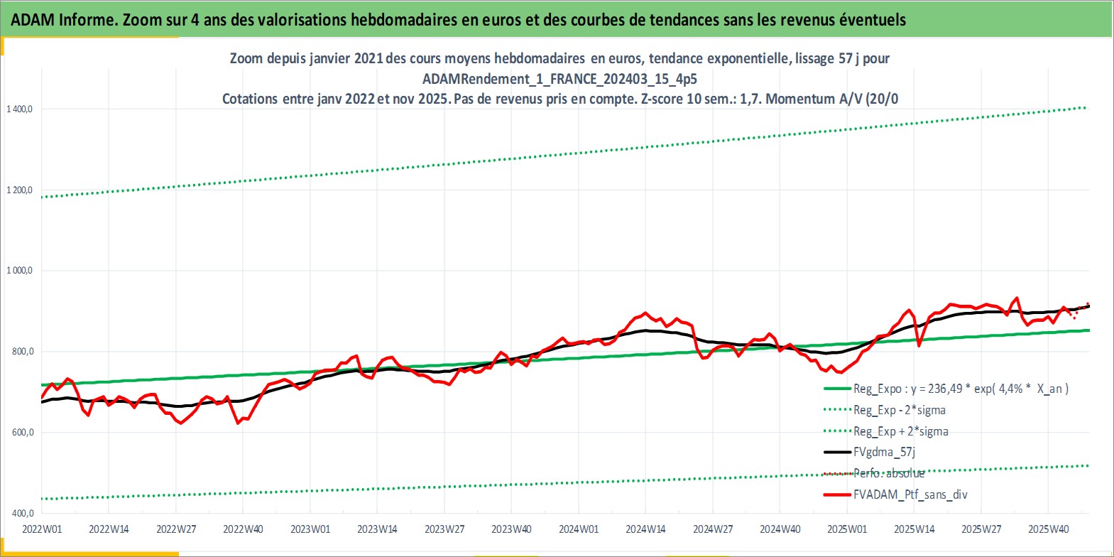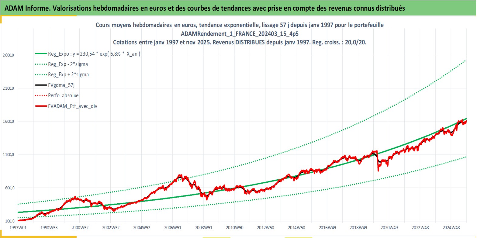 Site dédié aux investisseursPage dédiée sur site financeAnalyse des valorisations hebdomadaires du portefeuille ADAMRendement_1_FRANCE_202403_15_4p5_4actifs avec un profil P6_PurActions. Ce portefeuille est cote en EUR. Les valorisations couvrent les semaines 1997W01 a 2025W48. Les revenus de cet actif financier sont pris en compte depuis la semaine 1997W01. La note globale ESG de cet actif est estimee a 6.8 (apres rebasage entre 0 et 20).