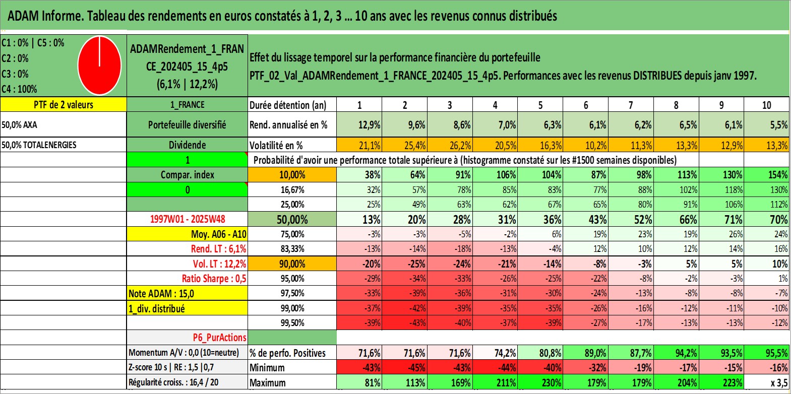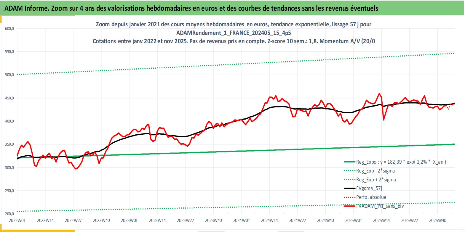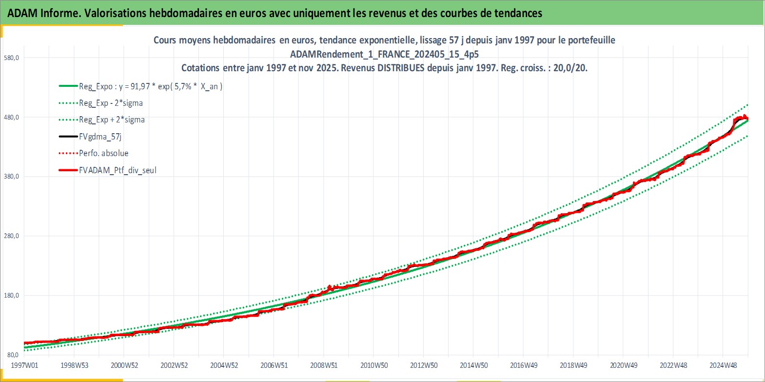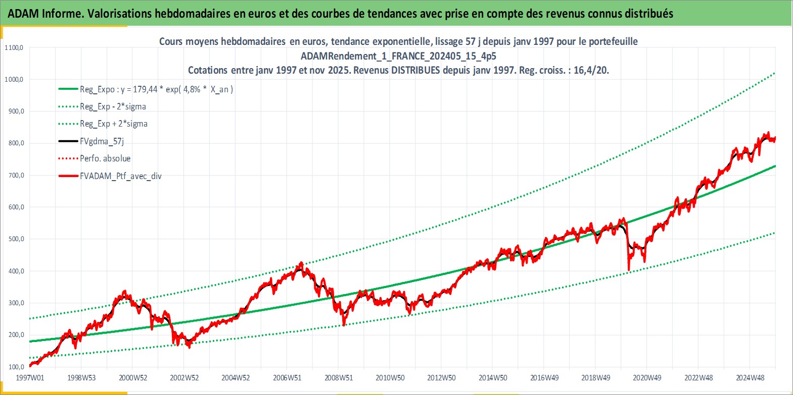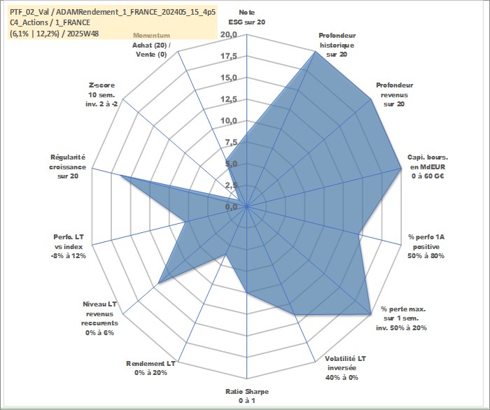 Site dédié aux investisseursPage dédiée sur site financeAnalyse des valorisations hebdomadaires du portefeuille ADAMRendement_1_FRANCE_202405_15_4p5_2actifs avec un profil P6_PurActions. Ce portefeuille est cote en EUR. Les valorisations couvrent les semaines 1997W01 a 2025W48. Les revenus de cet actif financier sont pris en compte depuis la semaine 1997W01. La note globale ESG de cet actif est estimee a 8.5 (apres rebasage entre 0 et 20).