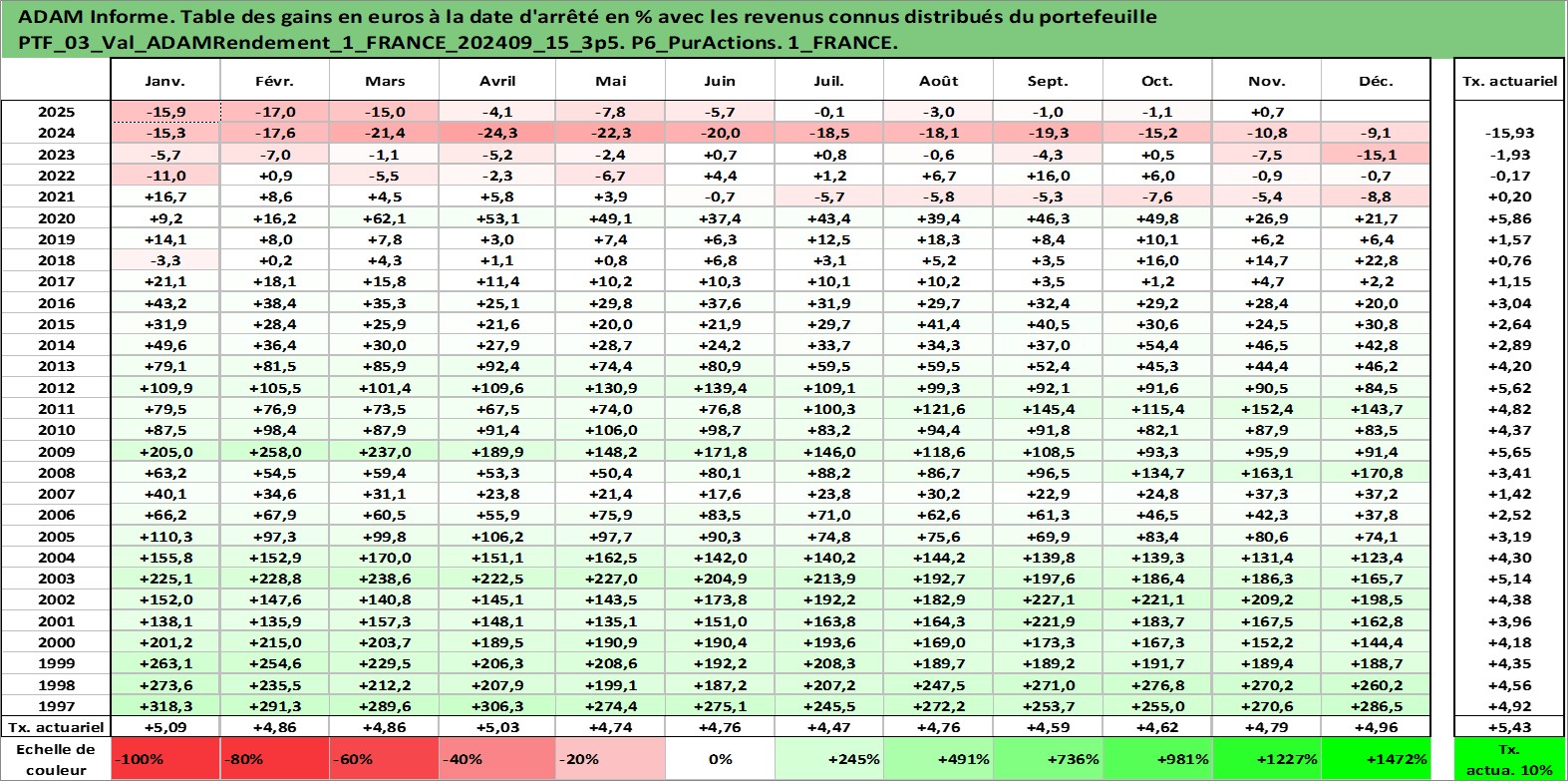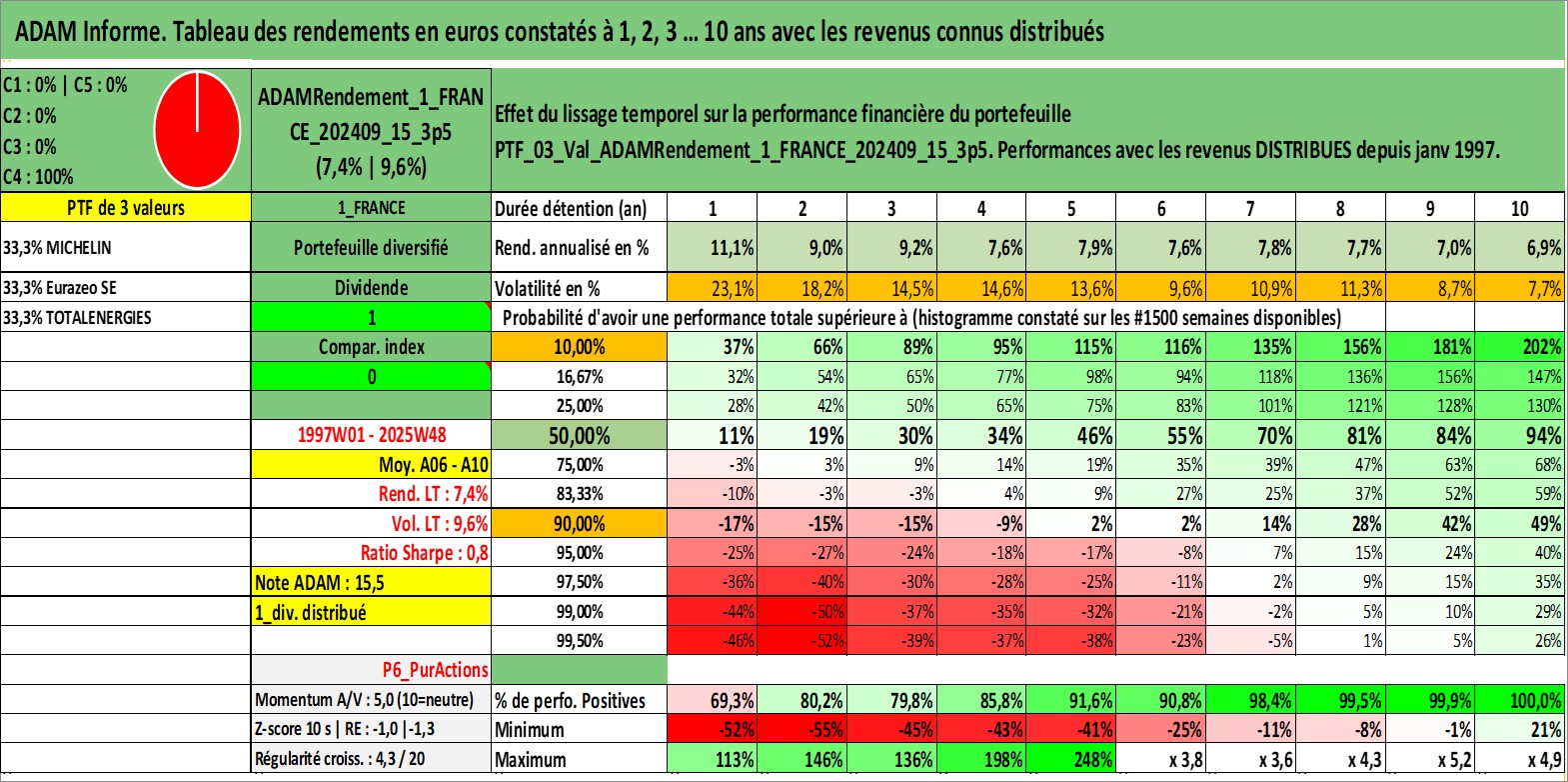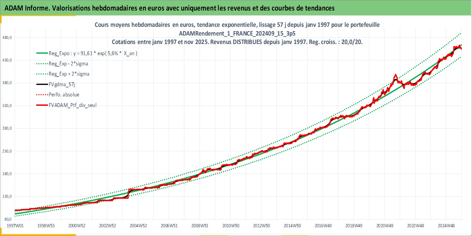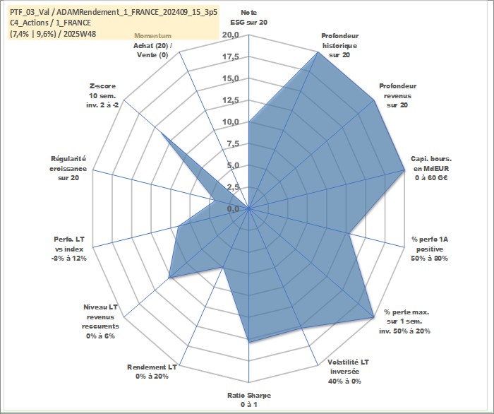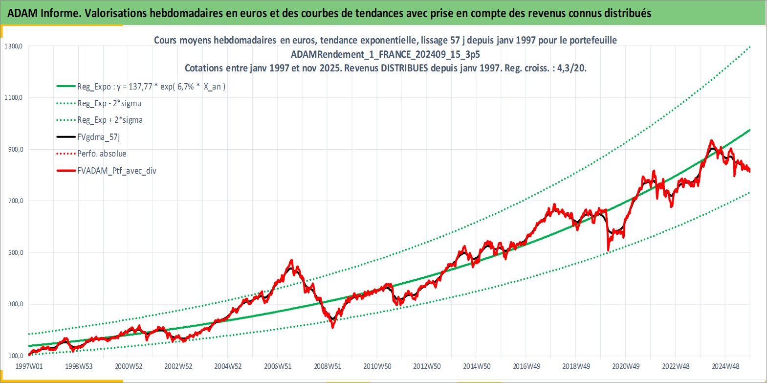 Site dédié aux investisseursPage dédiée sur site financeAnalyse des valorisations hebdomadaires du portefeuille ADAMRendement_1_FRANCE_202409_15_3p5_3actifs avec un profil P6_PurActions. Ce portefeuille est cote en EUR. Les valorisations couvrent les semaines 1997W01 a 2025W48. Les revenus de cet actif financier sont pris en compte depuis la semaine 1997W01. La note globale ESG de cet actif est estimee a 10.0 (apres rebasage entre 0 et 20).