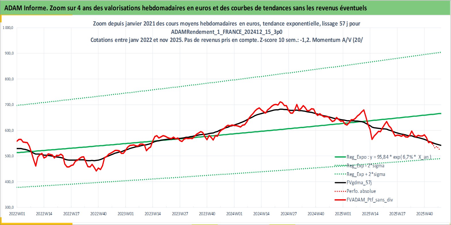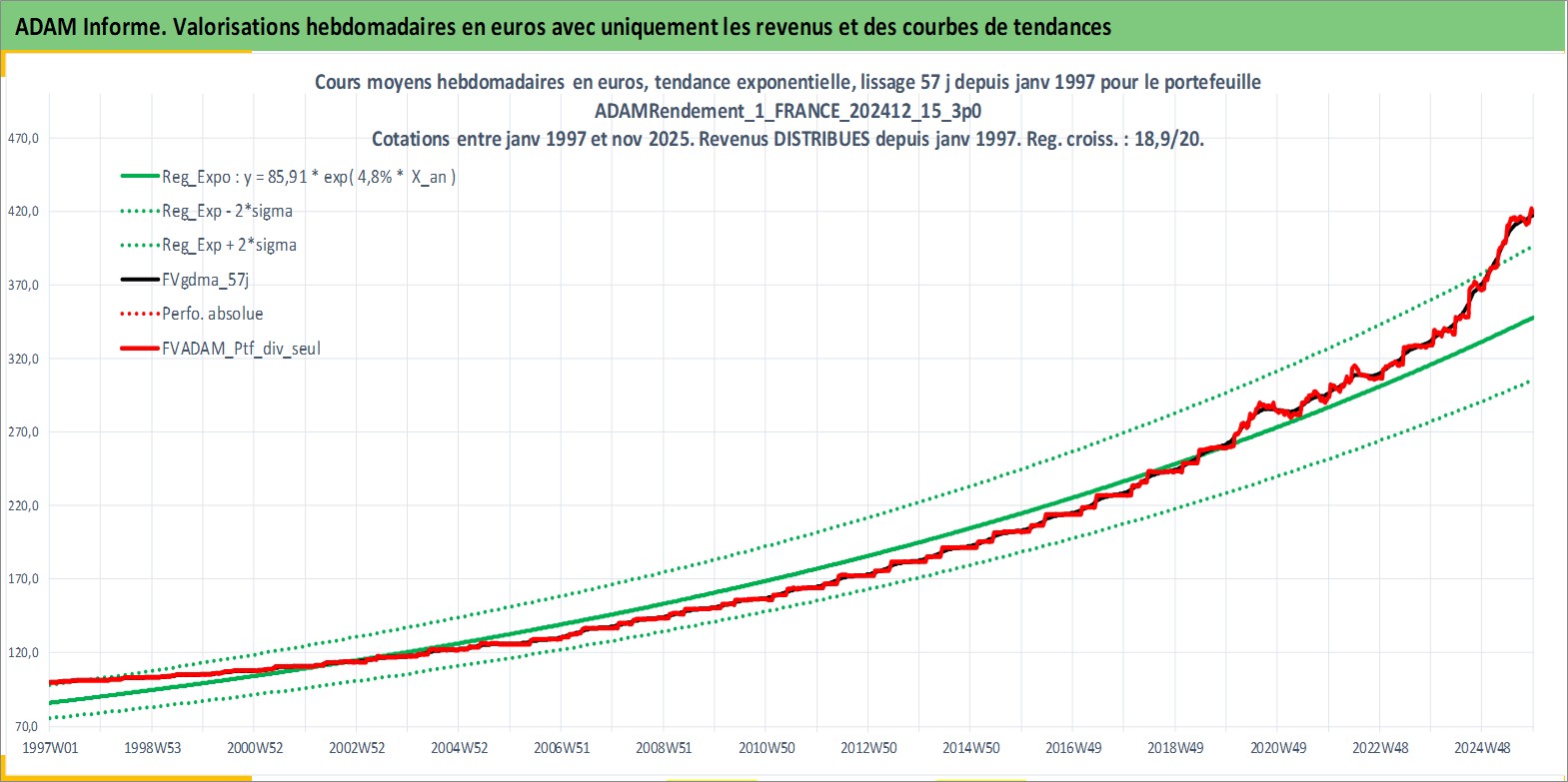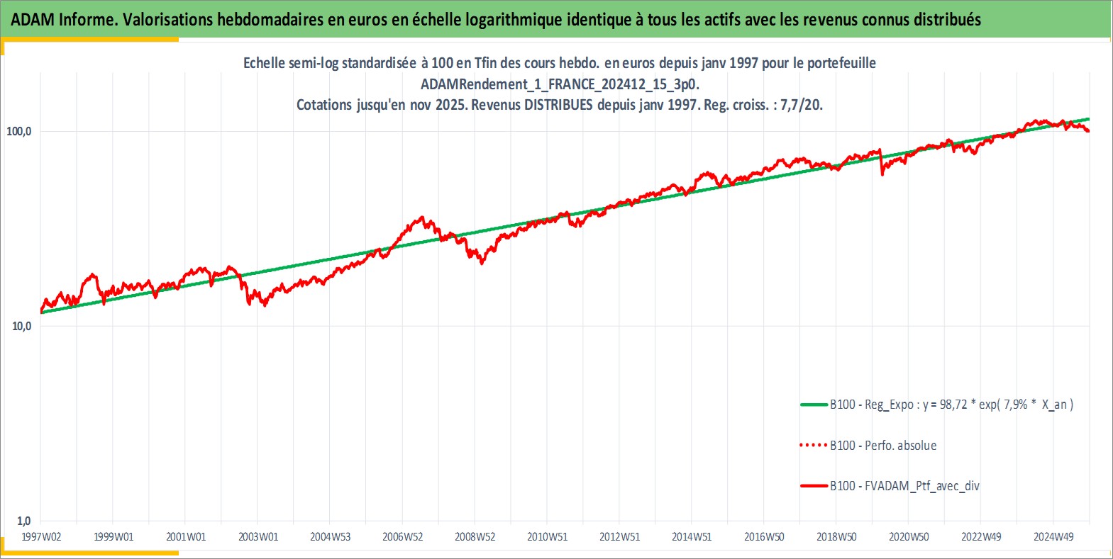 Site dédié aux investisseursPage dédiée sur site financeAnalyse des valorisations hebdomadaires du portefeuille ADAMRendement_1_FRANCE_202412_15_3p0_3actifs avec un profil P6_PurActions. Ce portefeuille est cote en EUR. Les valorisations couvrent les semaines 1997W01 a 2025W48. Les revenus de cet actif financier sont pris en compte depuis la semaine 1997W01. La note globale ESG de cet actif est estimee a 12.7 (apres rebasage entre 0 et 20).
