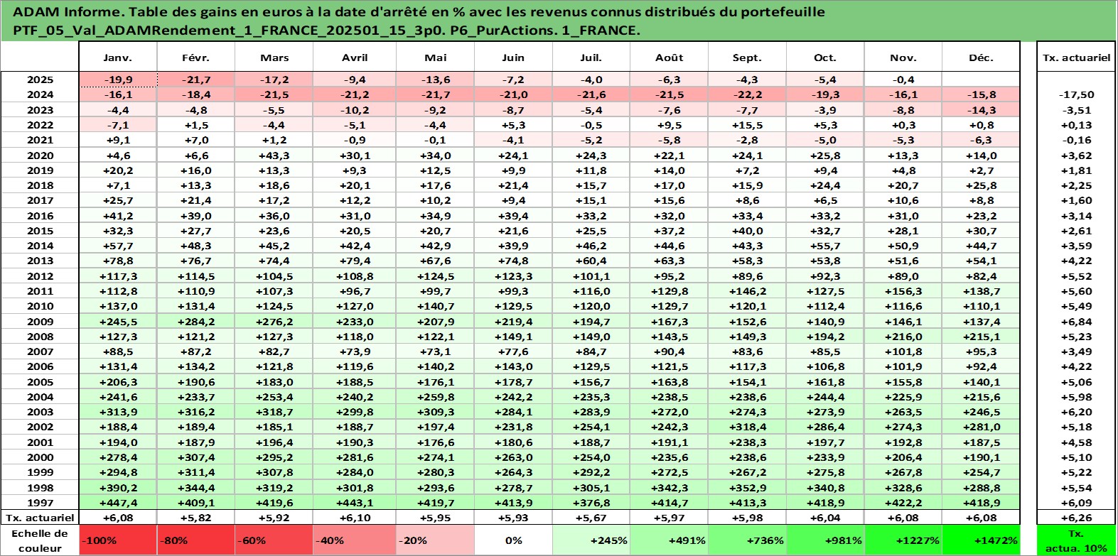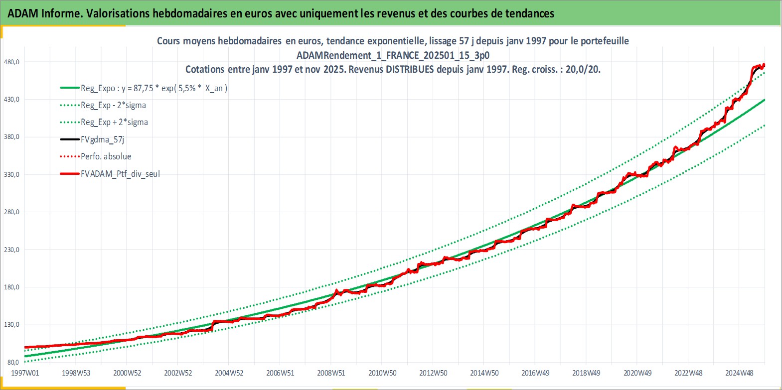 Site dédié aux investisseursPage dédiée sur site financeAnalyse des valorisations hebdomadaires du portefeuille ADAMRendement_1_FRANCE_202501_15_3p0_5actifs avec un profil P6_PurActions. Ce portefeuille est cote en EUR. Les valorisations couvrent les semaines 1997W01 a 2025W48. Les revenus de cet actif financier sont pris en compte depuis la semaine 1997W01. La note globale ESG de cet actif est estimee a 11.7 (apres rebasage entre 0 et 20).