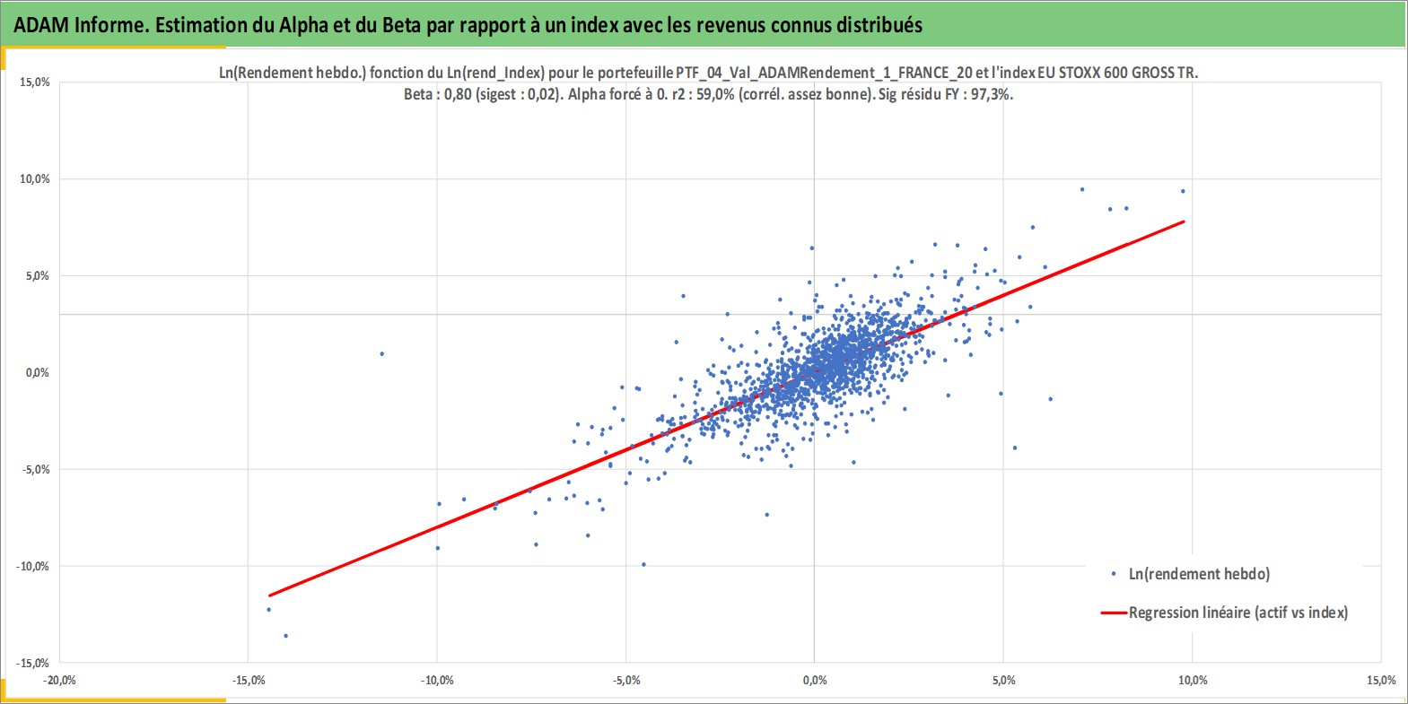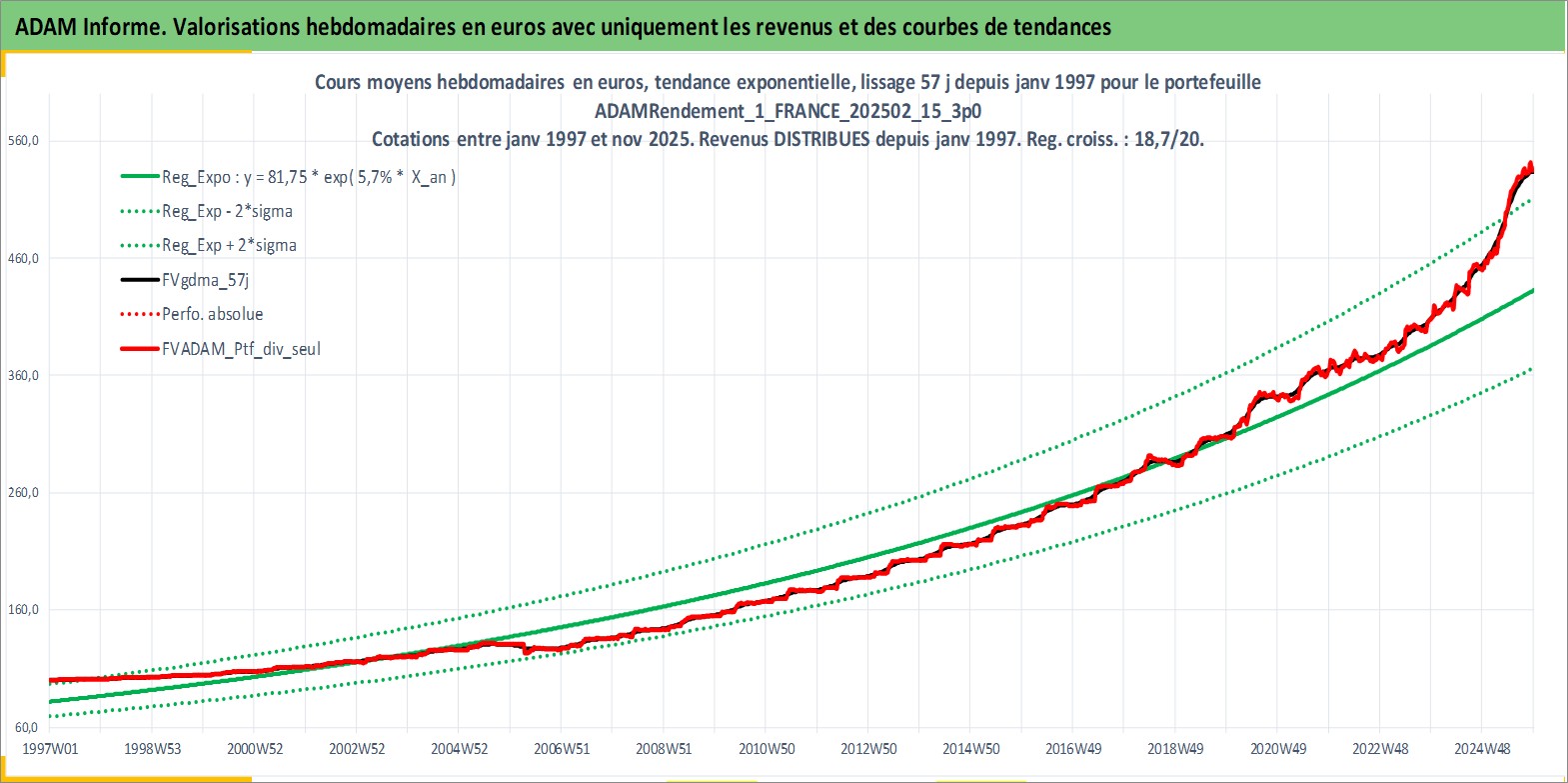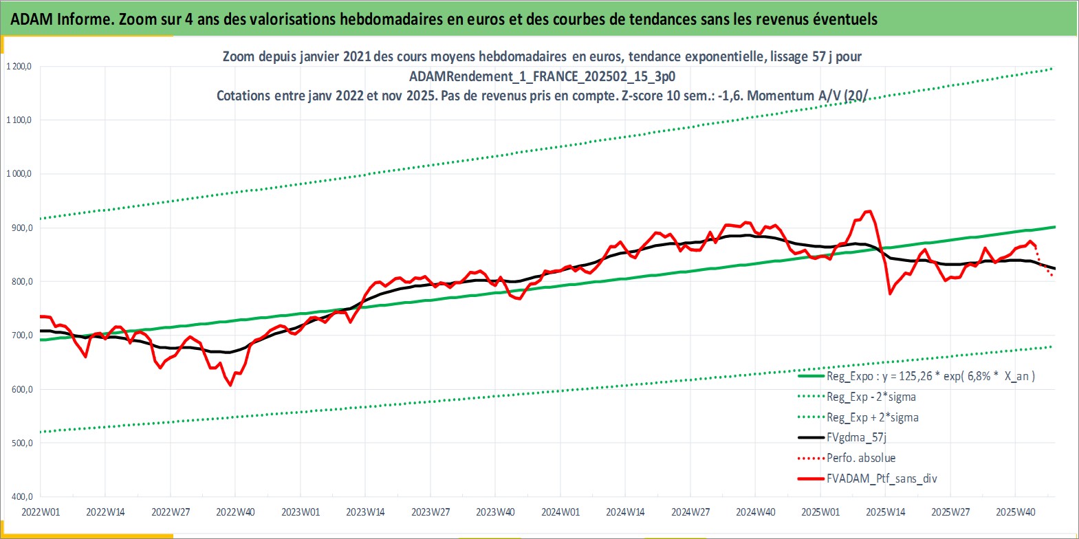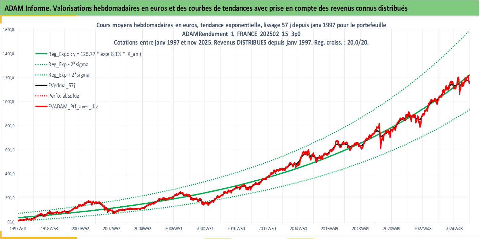 Site dédié aux investisseursPage dédiée sur site financeAnalyse des valorisations hebdomadaires du portefeuille ADAMRendement_1_FRANCE_202502_15_3p0_4actifs avec un profil P6_PurActions. Ce portefeuille est cote en EUR. Les valorisations couvrent les semaines 1997W01 a 2025W48. Les revenus de cet actif financier sont pris en compte depuis la semaine 1997W01. La note globale ESG de cet actif est estimee a 11.2 (apres rebasage entre 0 et 20).