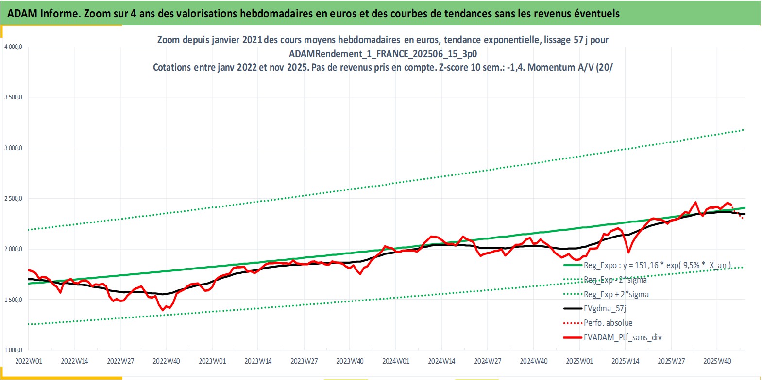 Site dédié aux investisseursPage dédiée sur site financeAnalyse des valorisations hebdomadaires du portefeuille ADAMRendement_1_FRANCE_202506_15_3p0_3actifs avec un profil P6_PurActions. Ce portefeuille est cote en EUR. Les valorisations couvrent les semaines 1997W01 a 2025W48. Les revenus de cet actif financier sont pris en compte depuis la semaine 1997W01. La note globale ESG de cet actif est estimee a 11.3 (apres rebasage entre 0 et 20).