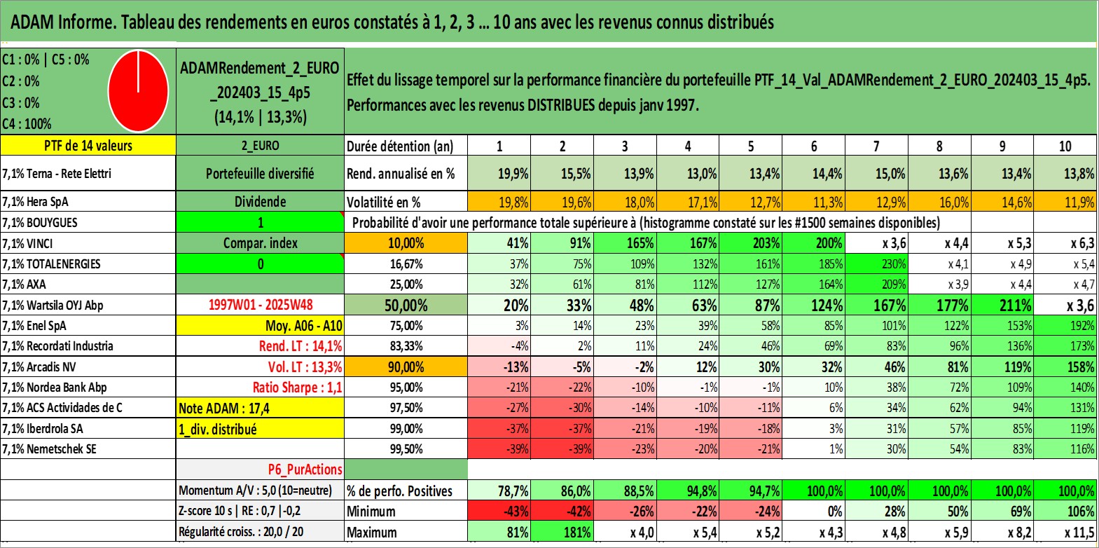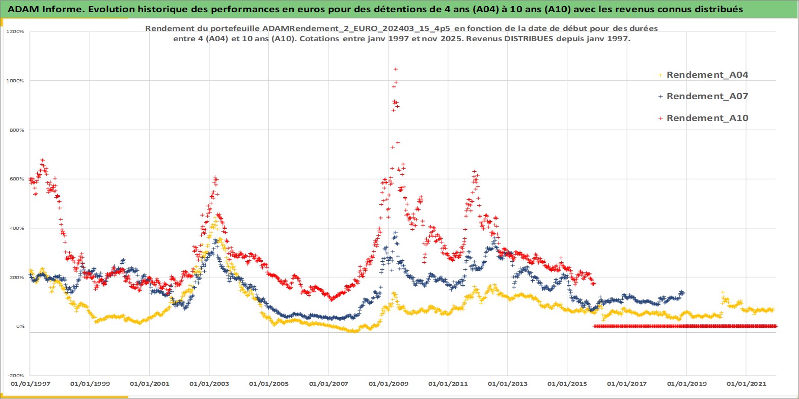 Site dédié aux investisseursPage dédiée sur site financeAnalyse des valorisations hebdomadaires du portefeuille ADAMRendement_2_EURO_202403_15_4p5_14actifs avec un profil P6_PurActions. Ce portefeuille est cote en EUR. Les valorisations couvrent les semaines 1997W01 a 2025W48. Les revenus de cet actif financier sont pris en compte depuis la semaine 1997W01. La note globale ESG de cet actif est estimee a 8.5 (apres rebasage entre 0 et 20).