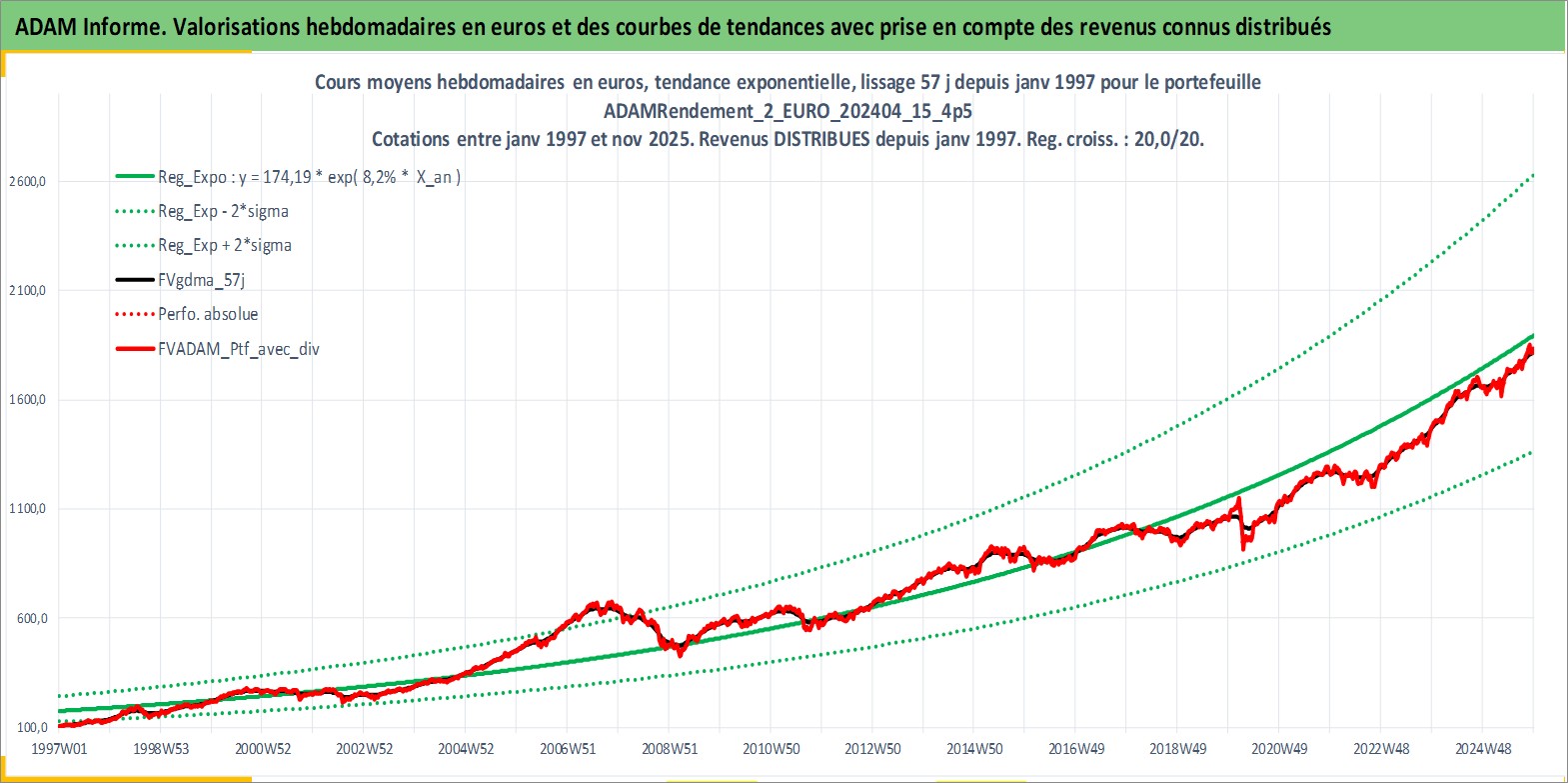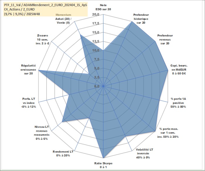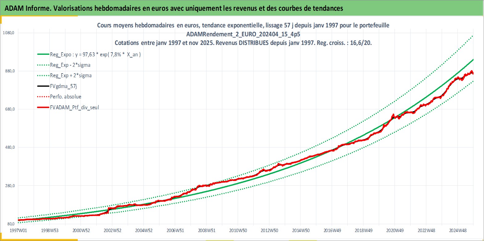 Site dédié aux investisseursPage dédiée sur site financeAnalyse des valorisations hebdomadaires du portefeuille ADAMRendement_2_EURO_202404_15_4p5_11actifs avec un profil P6_PurActions. Ce portefeuille est cote en EUR. Les valorisations couvrent les semaines 1997W01 a 2025W48. Les revenus de cet actif financier sont pris en compte depuis la semaine 1997W01. La note globale ESG de cet actif est estimee a 9.9 (apres rebasage entre 0 et 20).