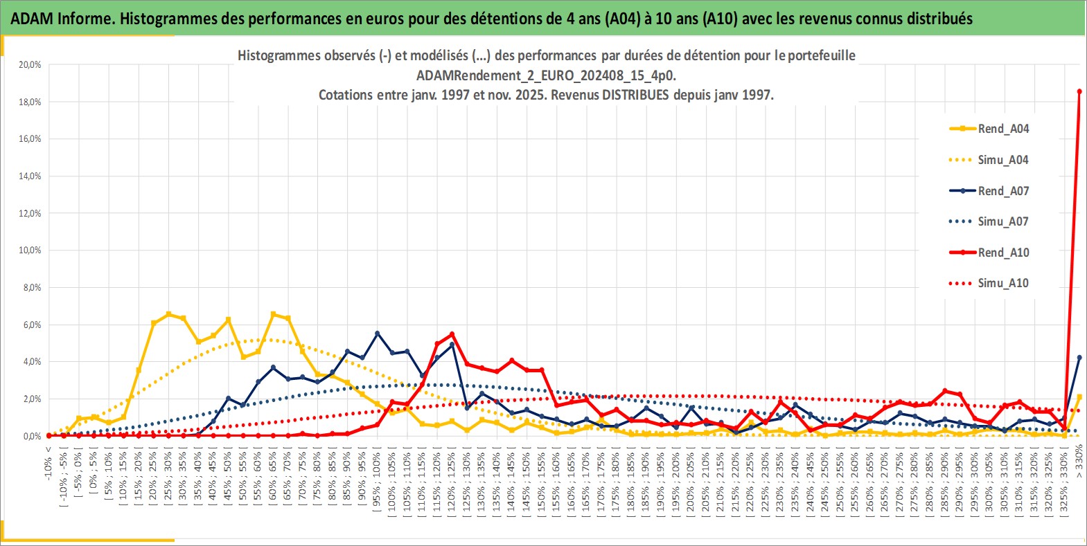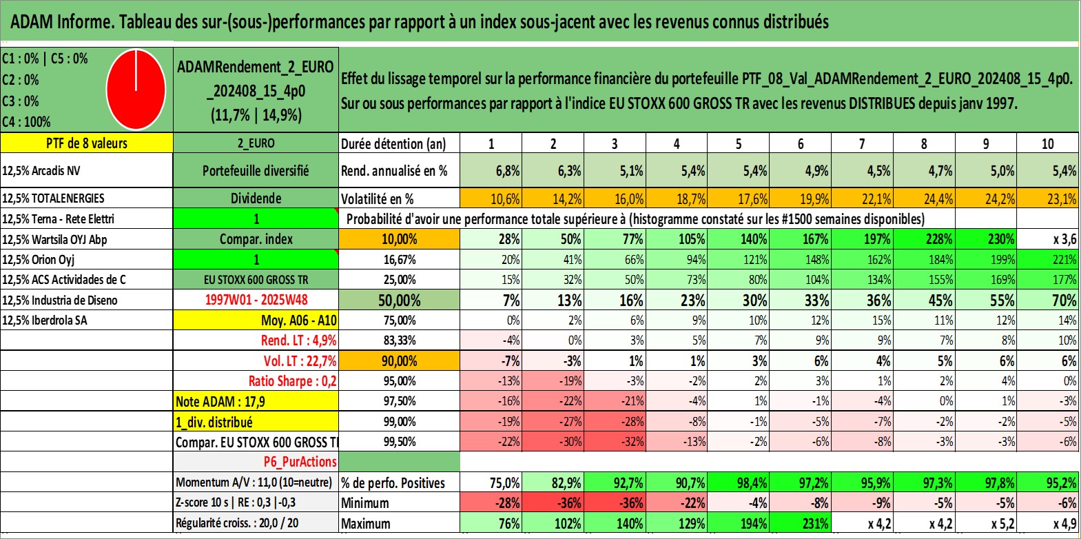 Site dédié aux investisseursPage dédiée sur site financeAnalyse des valorisations hebdomadaires du portefeuille ADAMRendement_2_EURO_202408_15_4p0_8actifs avec un profil P6_PurActions. Ce portefeuille est cote en EUR. Les valorisations couvrent les semaines 1997W01 a 2025W48. Les revenus de cet actif financier sont pris en compte depuis la semaine 1997W01. La note globale ESG de cet actif est estimee a 10.3 (apres rebasage entre 0 et 20).