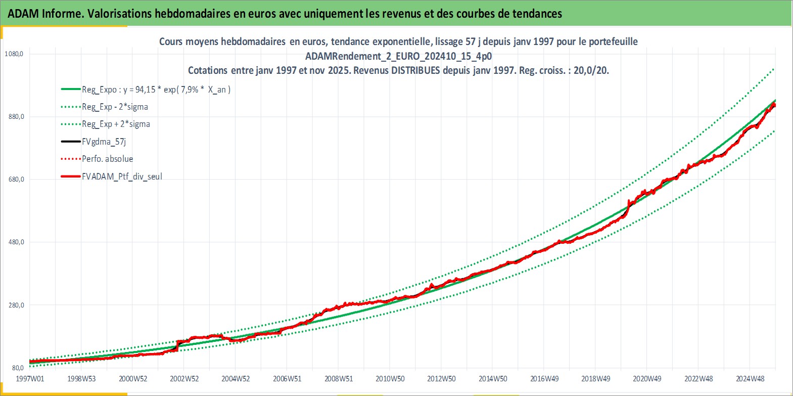 Site dédié aux investisseursPage dédiée sur site financeAnalyse des valorisations hebdomadaires du portefeuille ADAMRendement_2_EURO_202410_15_4p0_9actifs avec un profil P6_PurActions. Ce portefeuille est cote en EUR. Les valorisations couvrent les semaines 1997W01 a 2025W48. Les revenus de cet actif financier sont pris en compte depuis la semaine 1997W01. La note globale ESG de cet actif est estimee a 10.1 (apres rebasage entre 0 et 20).