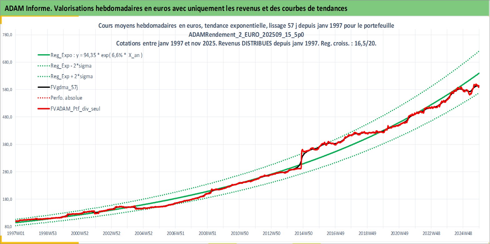 Site dédié aux investisseursPage dédiée sur site financeAnalyse des valorisations hebdomadaires du portefeuille ADAMRendement_2_EURO_202509_15_5p0_5actifs avec un profil P6_PurActions. Ce portefeuille est cote en EUR. Les valorisations couvrent les semaines 1997W01 a 2025W48. Les revenus de cet actif financier sont pris en compte depuis la semaine 1997W01. La note globale ESG de cet actif est estimee a 13.3 (apres rebasage entre 0 et 20).