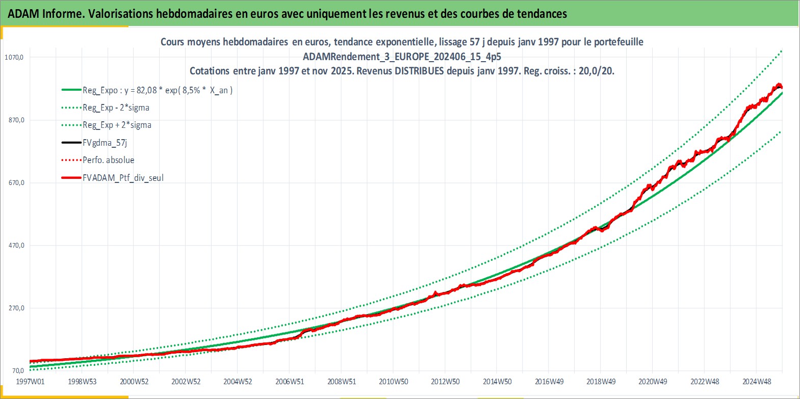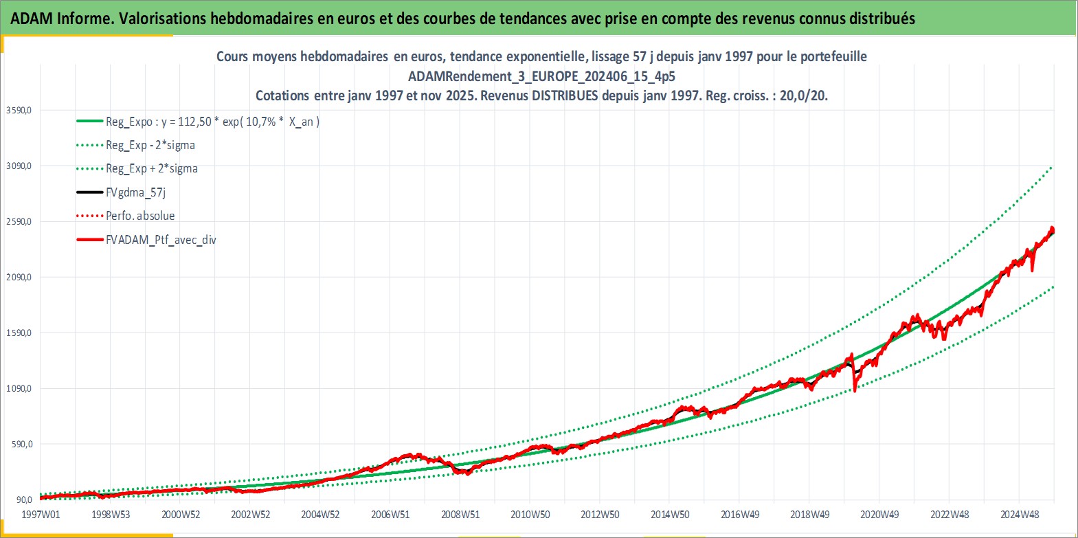 Site dédié aux investisseursPage dédiée sur site financeAnalyse des valorisations hebdomadaires du portefeuille ADAMRendement_3_EUROPE_202406_15_4p5_18actifs avec un profil P6_PurActions. Ce portefeuille est cote en EUR. Les valorisations couvrent les semaines 1997W01 a 2025W48. Les revenus de cet actif financier sont pris en compte depuis la semaine 1997W01. La note globale ESG de cet actif est estimee a 10.4 (apres rebasage entre 0 et 20).