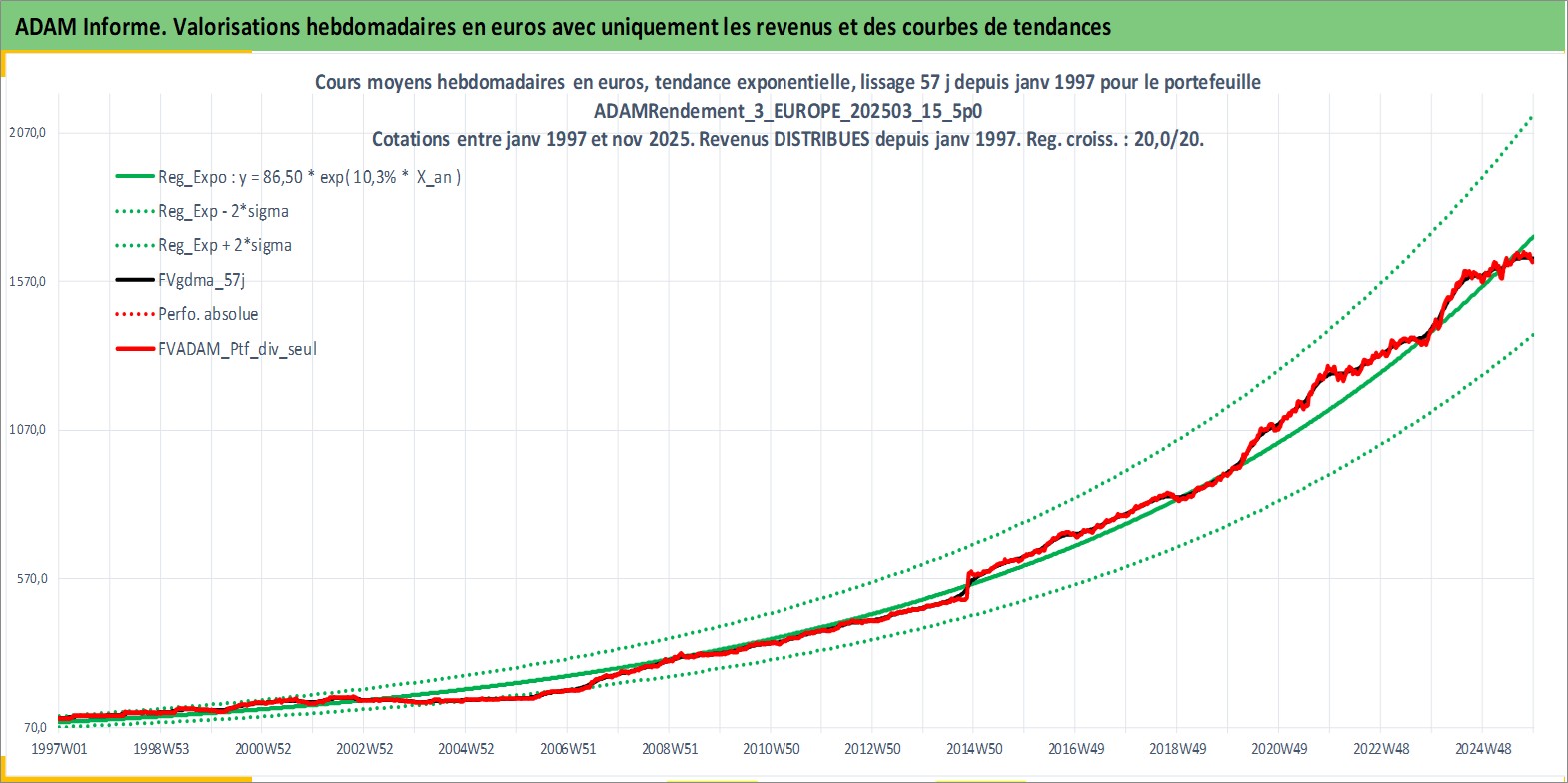 Site dédié aux investisseursPage dédiée sur site financeAnalyse des valorisations hebdomadaires du portefeuille ADAMRendement_3_EUROPE_202503_15_5p0_13actifs avec un profil P6_PurActions. Ce portefeuille est cote en EUR. Les valorisations couvrent les semaines 1997W01 a 2025W48. Les revenus de cet actif financier sont pris en compte depuis la semaine 1997W01. La note globale ESG de cet actif est estimee a 12.9 (apres rebasage entre 0 et 20).
