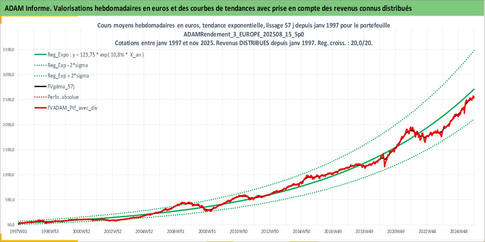 Site dédié aux investisseursPage dédiée sur site financeAnalyse des valorisations hebdomadaires du portefeuille ADAMRendement_3_EUROPE_202508_15_5p0_12actifs avec un profil P6_PurActions. Ce portefeuille est cote en EUR. Les valorisations couvrent les semaines 1997W01 a 2025W48. Les revenus de cet actif financier sont pris en compte depuis la semaine 1997W01. La note globale ESG de cet actif est estimee a 13.1 (apres rebasage entre 0 et 20).