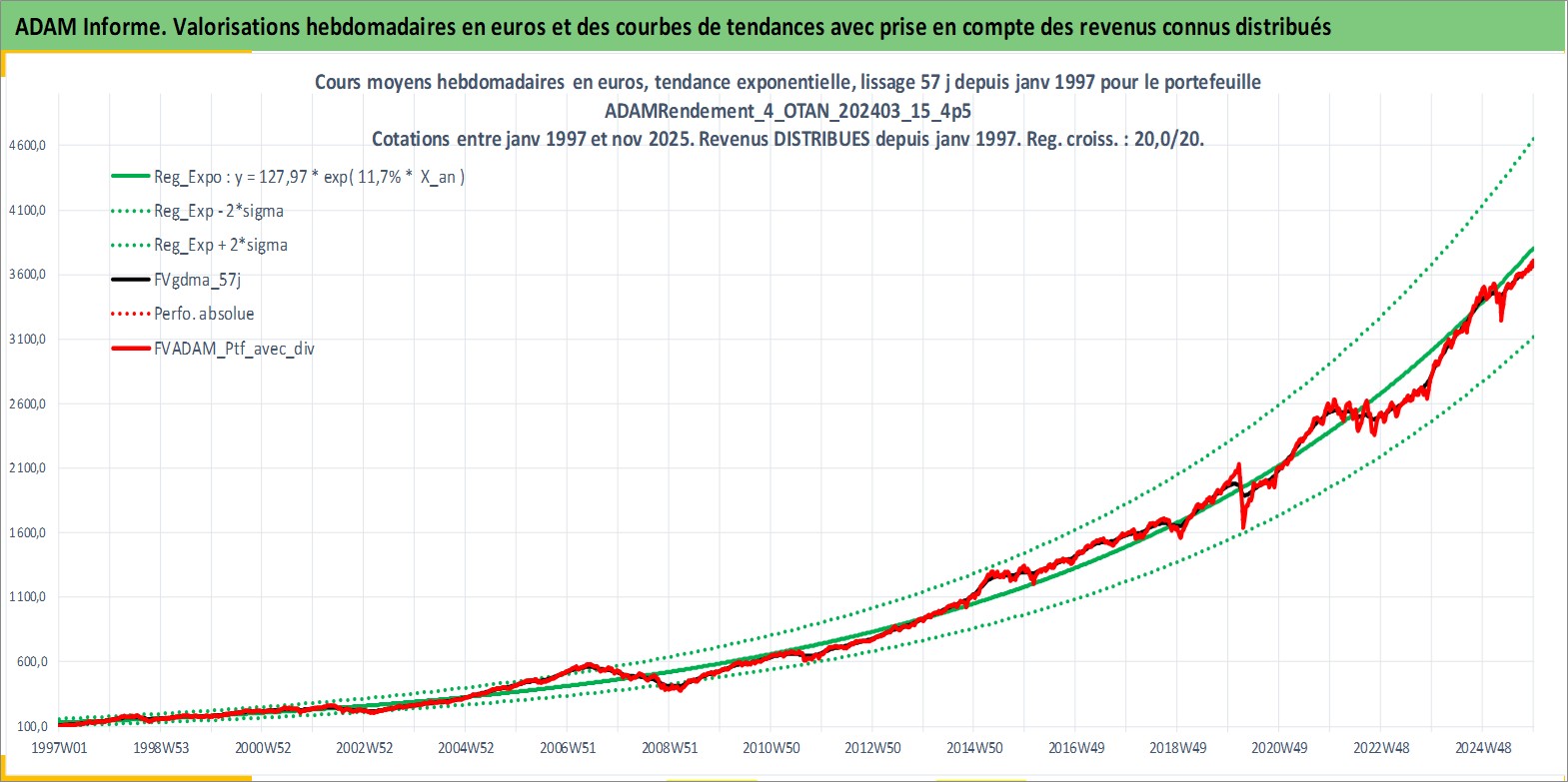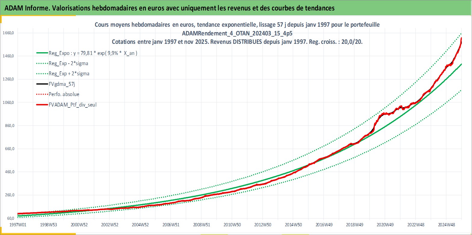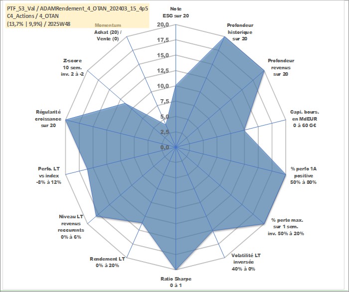 Site dédié aux investisseursPage dédiée sur site financeAnalyse des valorisations hebdomadaires du portefeuille ADAMRendement_4_OTAN_202403_15_4p5_53actifs avec un profil P6_PurActions. Ce portefeuille est cote en EUR. Les valorisations couvrent les semaines 1997W01 a 2025W48. Les revenus de cet actif financier sont pris en compte depuis la semaine 1997W01. La note globale ESG de cet actif est estimee a 10.1 (apres rebasage entre 0 et 20).