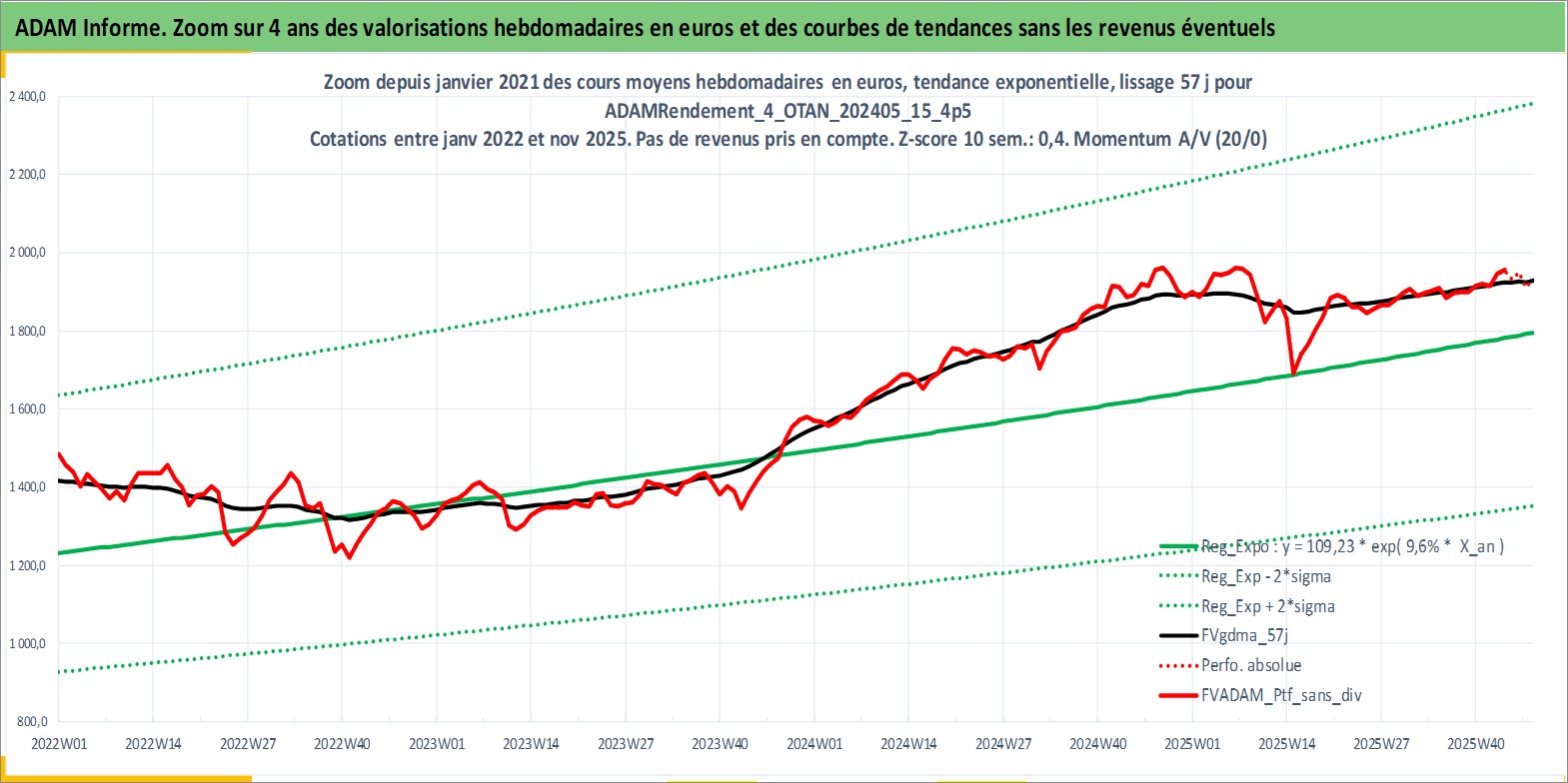 Site dédié aux investisseursPage dédiée sur site financeAnalyse des valorisations hebdomadaires du portefeuille ADAMRendement_4_OTAN_202405_15_4p5_39actifs avec un profil P6_PurActions. Ce portefeuille est cote en EUR. Les valorisations couvrent les semaines 1997W01 a 2025W48. Les revenus de cet actif financier sont pris en compte depuis la semaine 1997W01. La note globale ESG de cet actif est estimee a 10.5 (apres rebasage entre 0 et 20).