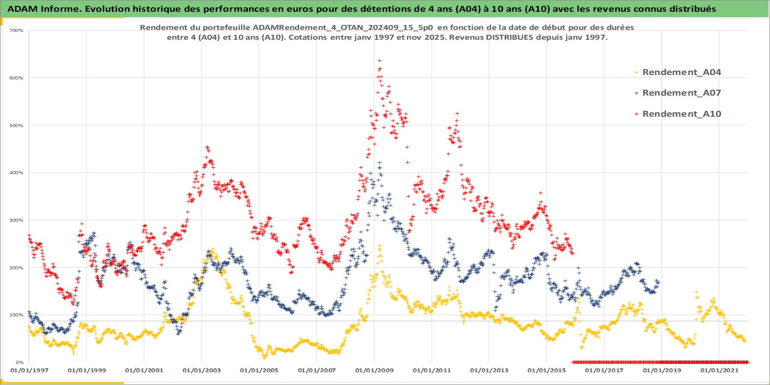 Site dédié aux investisseursPage dédiée sur site financeAnalyse des valorisations hebdomadaires du portefeuille ADAMRendement_4_OTAN_202409_15_5p0_20actifs avec un profil P6_PurActions. Ce portefeuille est cote en EUR. Les valorisations couvrent les semaines 1997W01 a 2025W48. Les revenus de cet actif financier sont pris en compte depuis la semaine 1997W01. La note globale ESG de cet actif est estimee a 10.5 (apres rebasage entre 0 et 20).