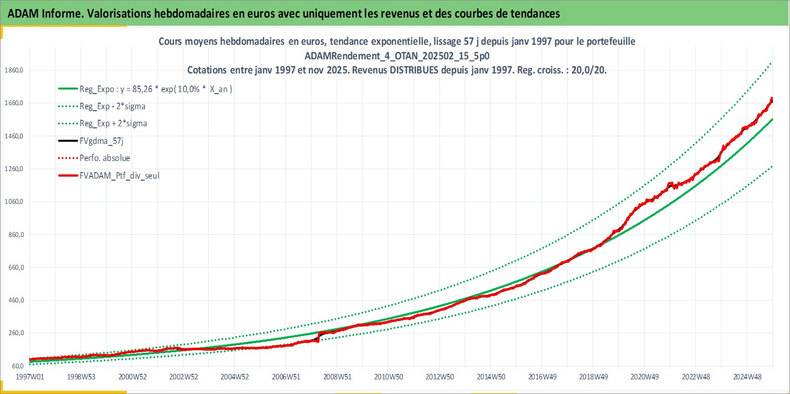 Site dédié aux investisseursPage dédiée sur site financeAnalyse des valorisations hebdomadaires du portefeuille ADAMRendement_4_OTAN_202502_15_5p0_29actifs avec un profil P6_PurActions. Ce portefeuille est cote en EUR. Les valorisations couvrent les semaines 1997W01 a 2025W48. Les revenus de cet actif financier sont pris en compte depuis la semaine 1997W01. La note globale ESG de cet actif est estimee a 11.0 (apres rebasage entre 0 et 20).
