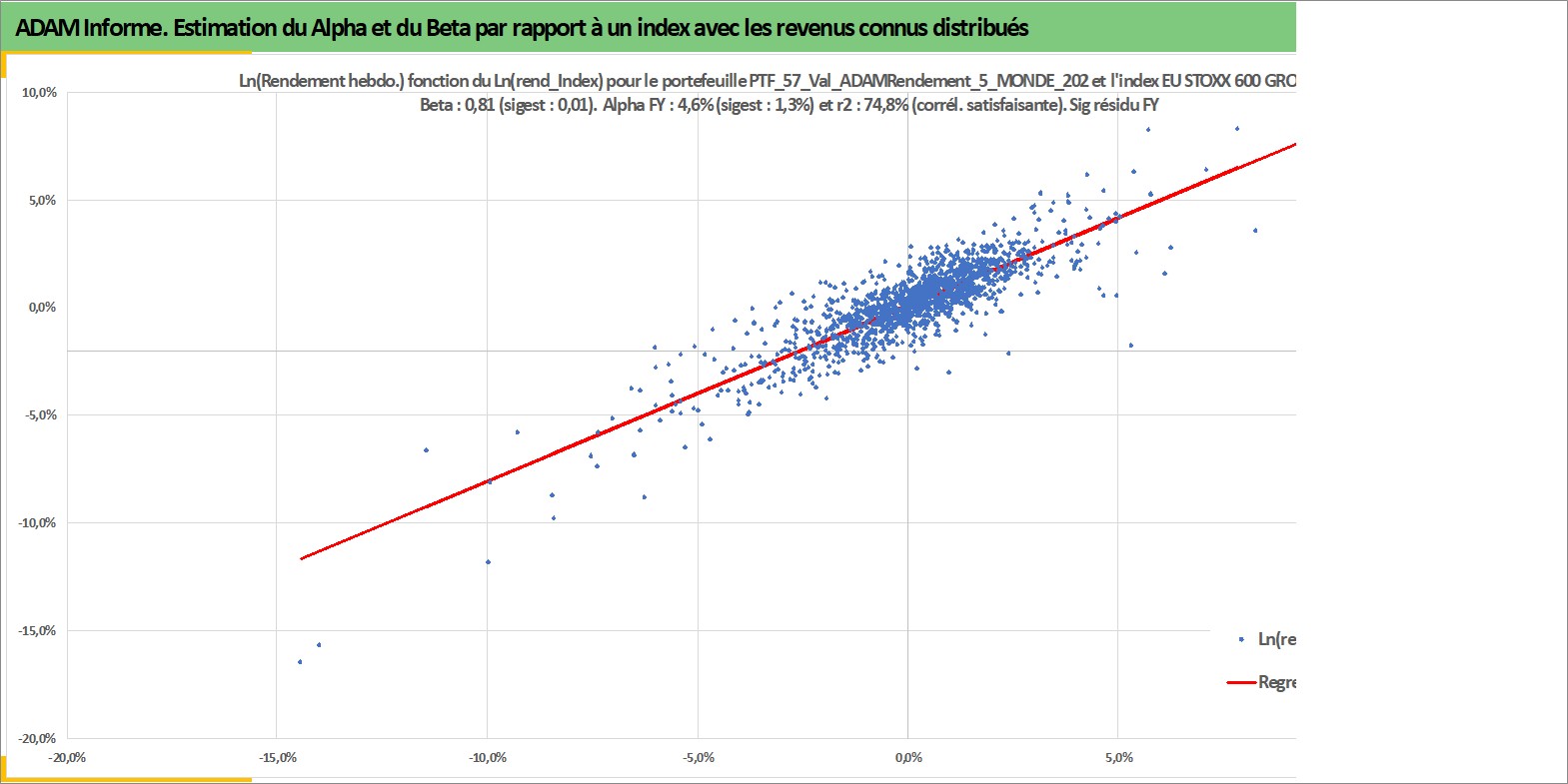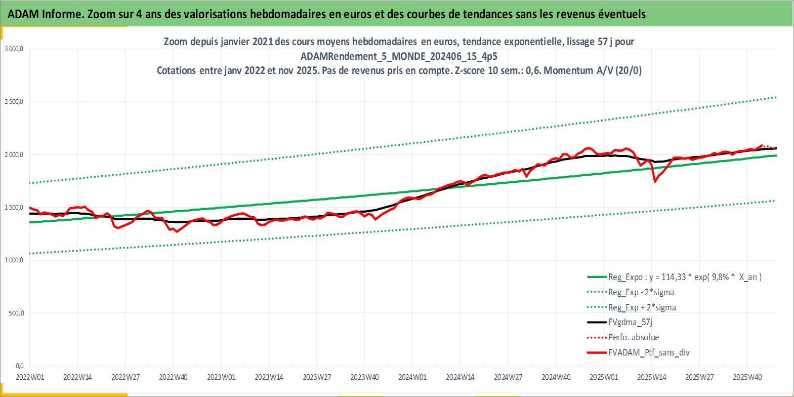 Site dédié aux investisseursPage dédiée sur site financeAnalyse des valorisations hebdomadaires du portefeuille ADAMRendement_5_MONDE_202406_15_4p5_57actifs avec un profil P6_PurActions. Ce portefeuille est cote en EUR. Les valorisations couvrent les semaines 1997W01 a 2025W48. Les revenus de cet actif financier sont pris en compte depuis la semaine 1997W01. La note globale ESG de cet actif est estimee a 9.2 (apres rebasage entre 0 et 20).