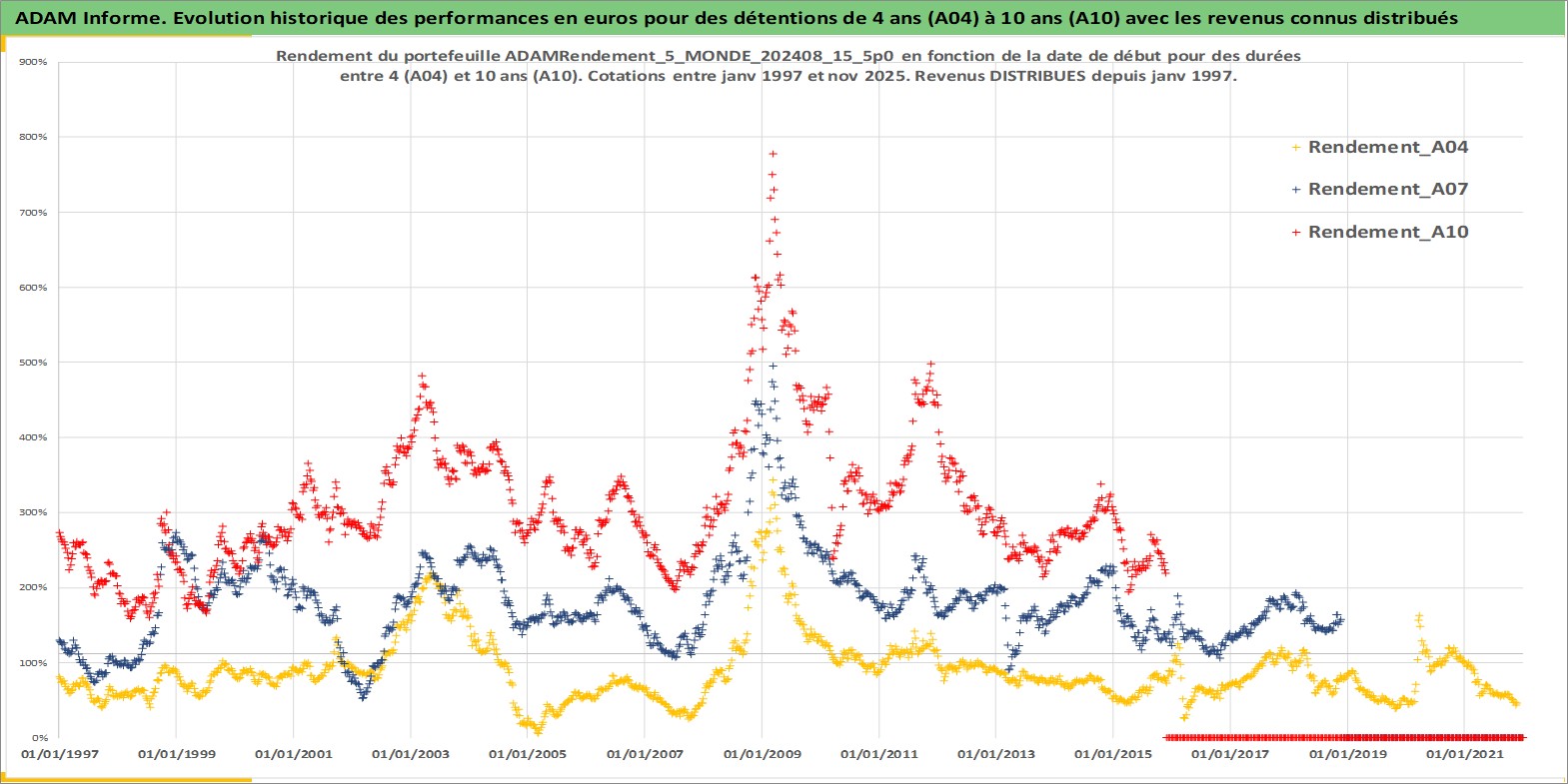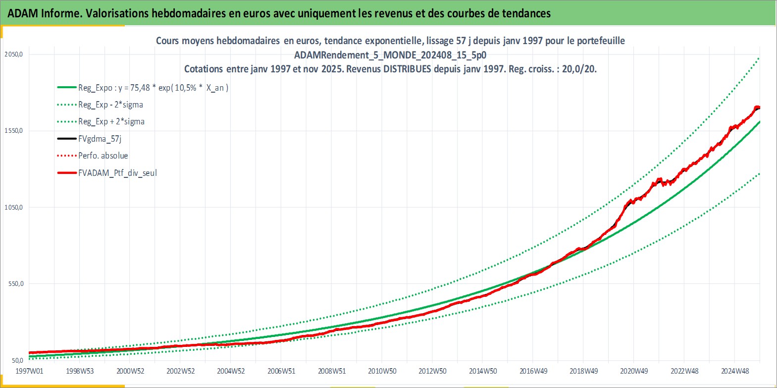 Site dédié aux investisseursPage dédiée sur site financeAnalyse des valorisations hebdomadaires du portefeuille ADAMRendement_5_MONDE_202408_15_5p0_31actifs avec un profil P6_PurActions. Ce portefeuille est cote en EUR. Les valorisations couvrent les semaines 1997W01 a 2025W48. Les revenus de cet actif financier sont pris en compte depuis la semaine 1997W01. La note globale ESG de cet actif est estimee a 9.0 (apres rebasage entre 0 et 20).