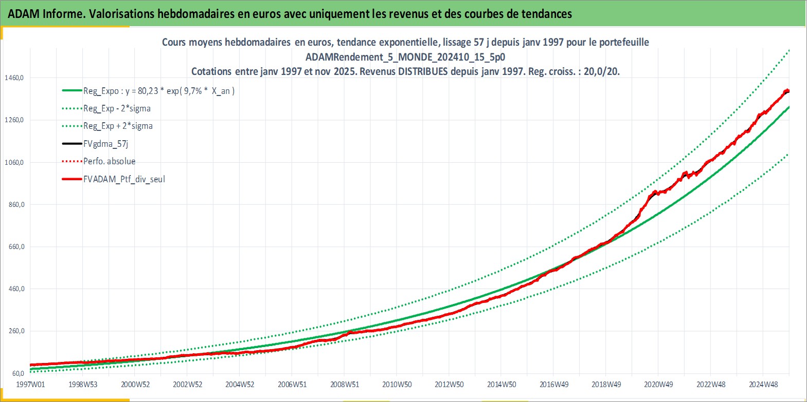 Site dédié aux investisseursPage dédiée sur site financeAnalyse des valorisations hebdomadaires du portefeuille ADAMRendement_5_MONDE_202410_15_5p0_33actifs avec un profil P6_PurActions. Ce portefeuille est cote en EUR. Les valorisations couvrent les semaines 1997W01 a 2025W48. Les revenus de cet actif financier sont pris en compte depuis la semaine 1997W01. La note globale ESG de cet actif est estimee a 10.3 (apres rebasage entre 0 et 20).