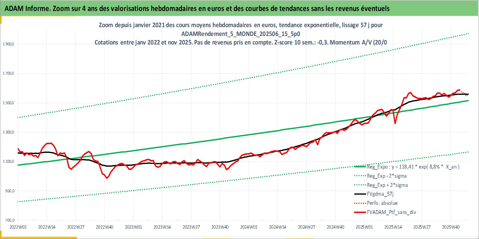 Site dédié aux investisseursPage dédiée sur site financeAnalyse des valorisations hebdomadaires du portefeuille ADAMRendement_5_MONDE_202506_15_5p0_24actifs avec un profil P6_PurActions. Ce portefeuille est cote en EUR. Les valorisations couvrent les semaines 1997W01 a 2025W48. Les revenus de cet actif financier sont pris en compte depuis la semaine 1997W01. La note globale ESG de cet actif est estimee a 12.1 (apres rebasage entre 0 et 20).