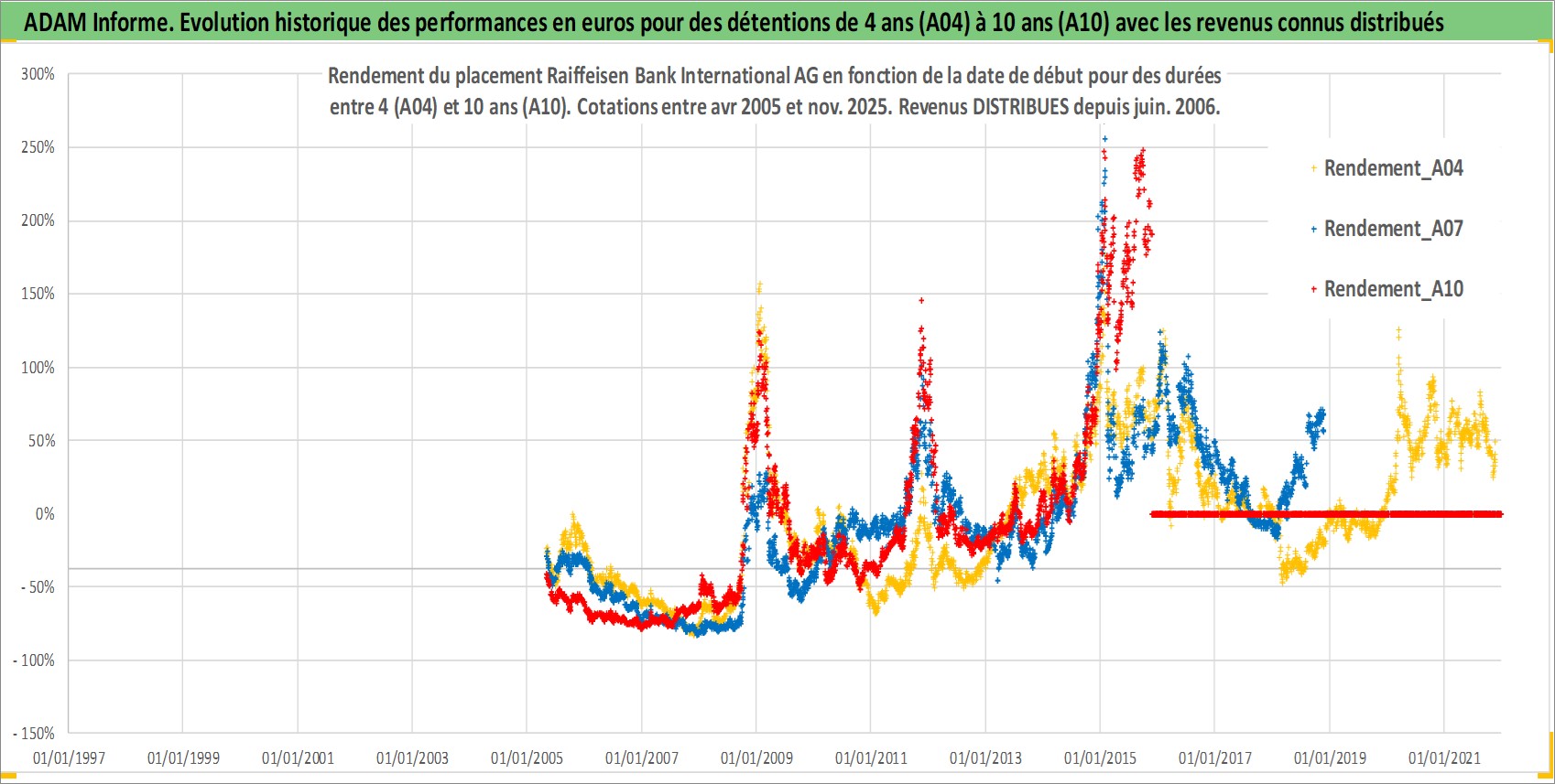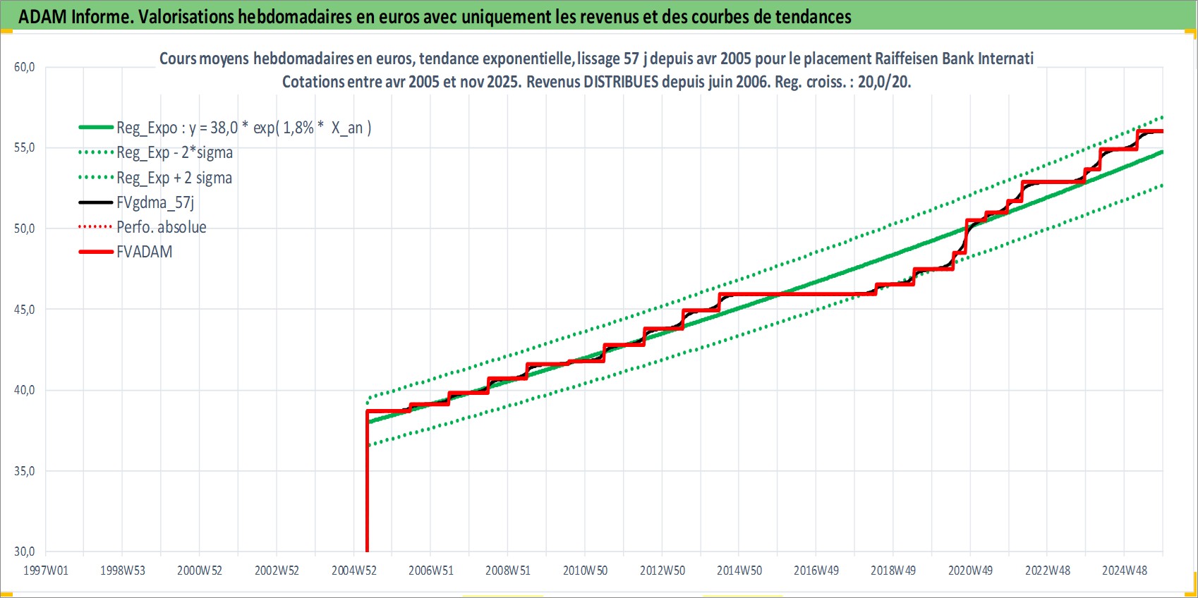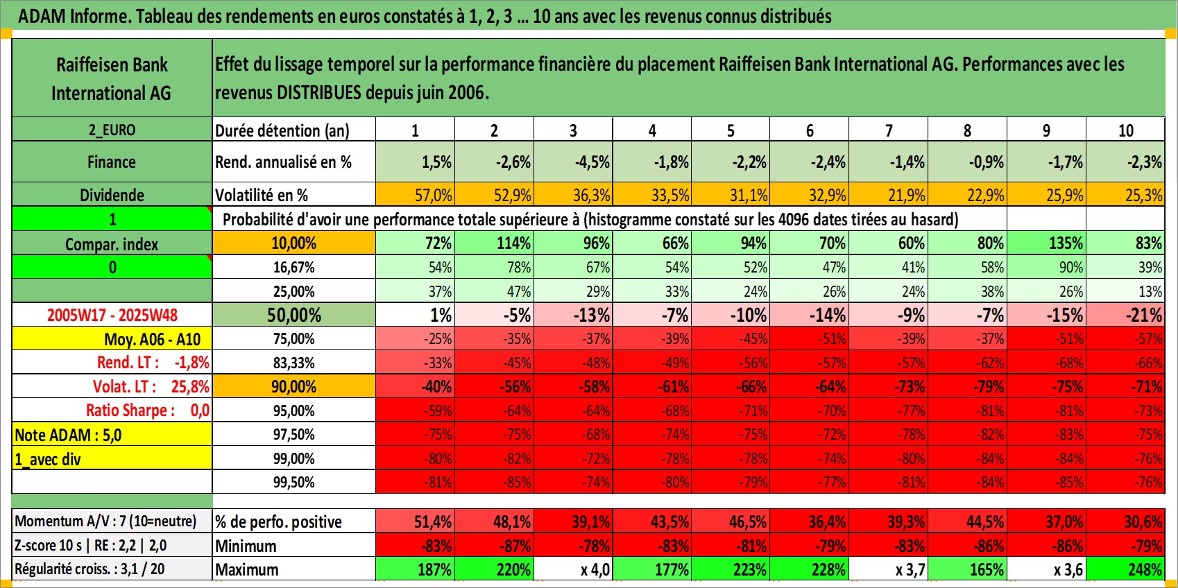 Site dédié aux investisseursPage dédiée sur site financeAnalyse des valorisations hebdomadaires de l'action Raiffeisen Bank International AG. Cet actif est cote en EUR. Les valorisations couvrent les semaines 2005W17 a 2025W48. Les revenus de cet actif financier sont pris en compte depuis la semaine 2006W24. La note globale ESG de cet actif est estimee a 12.0 (apres rebasage entre 0 et 20).
