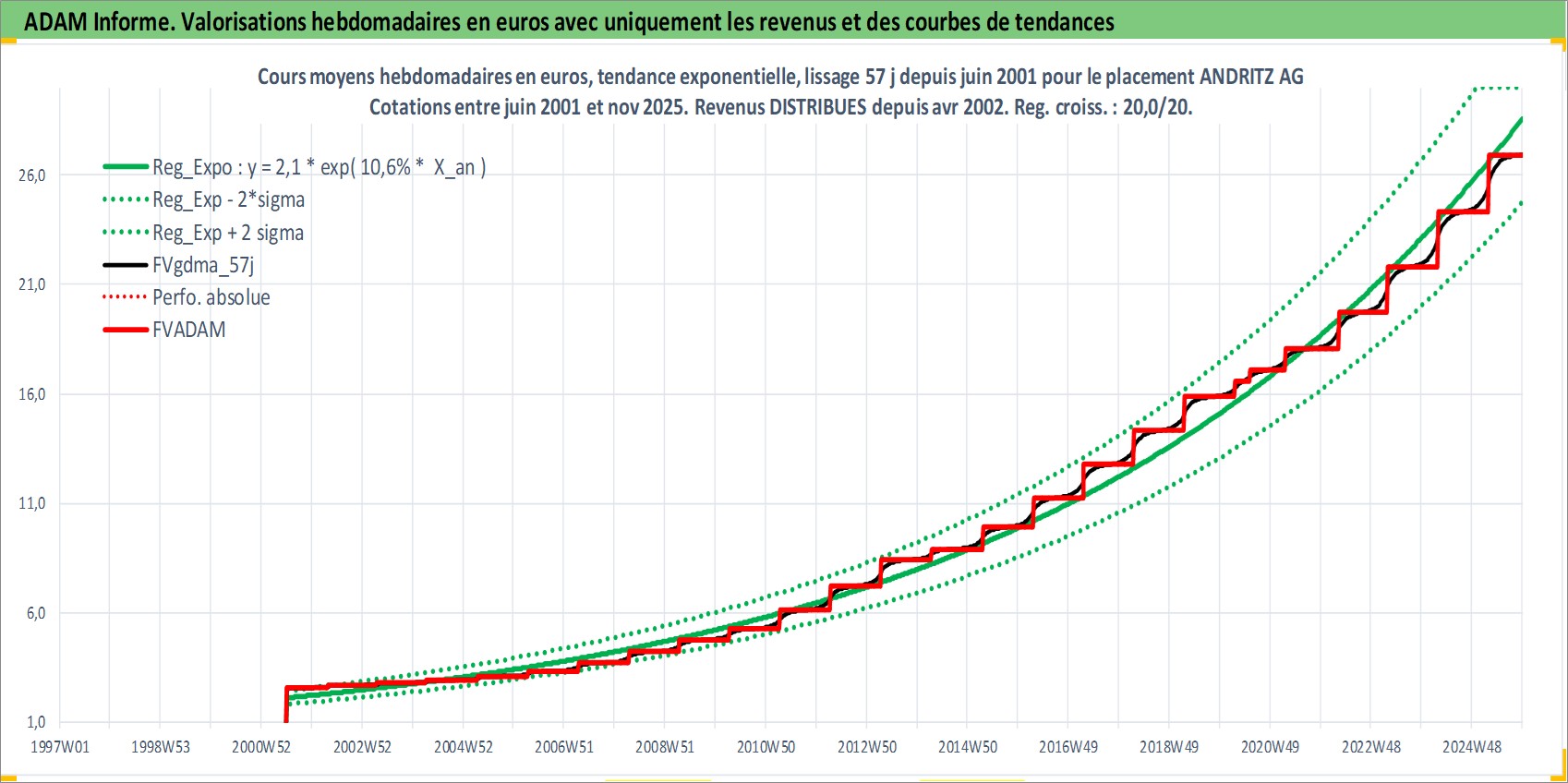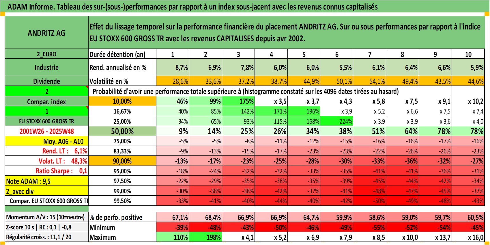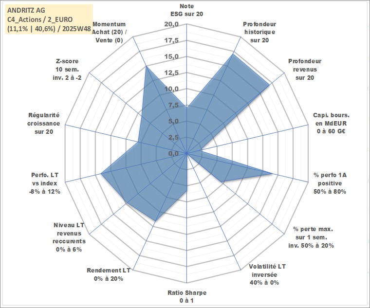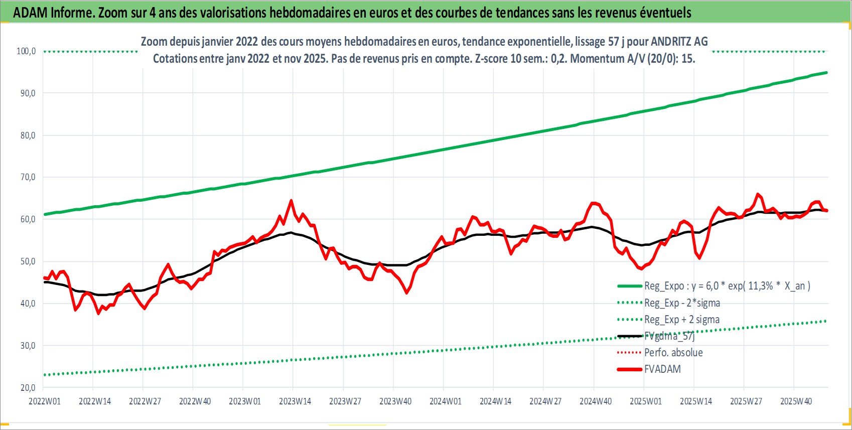 Site dédié aux investisseursPage dédiée sur site financeAnalyse des valorisations hebdomadaires de l'action ANDRITZ AG. Cet actif est cote en EUR. Les valorisations couvrent les semaines 2001W26 a 2025W48. Les revenus de cet actif financier sont pris en compte depuis la semaine 2002W17. La note globale ESG de cet actif est estimee a 7.0 (apres rebasage entre 0 et 20).