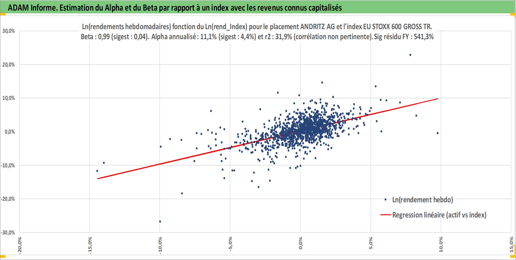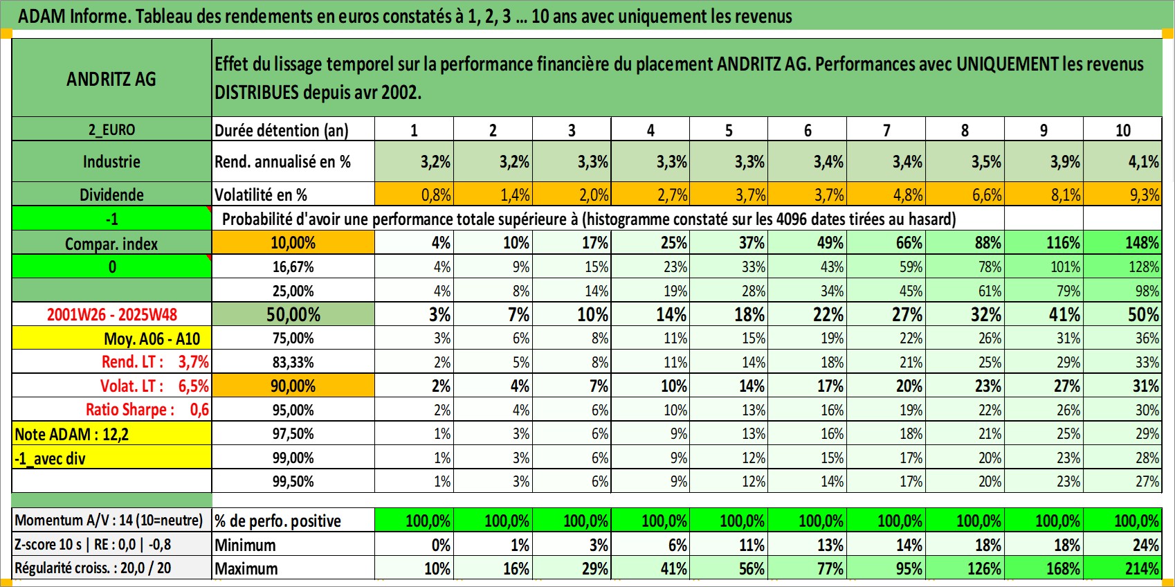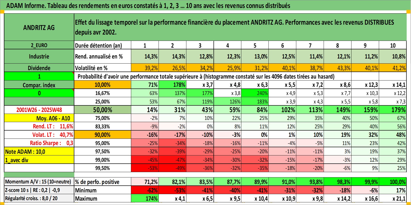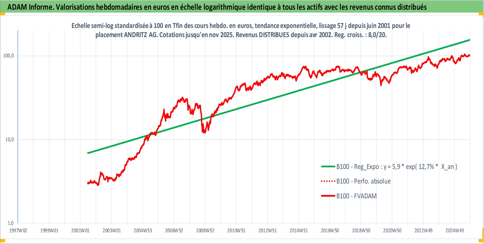 Site dédié aux investisseursPage dédiée sur site financeAnalyse des valorisations hebdomadaires de l'action ANDRITZ AG. Cet actif est cote en EUR. Les valorisations couvrent les semaines 2001W26 a 2025W48. Les revenus de cet actif financier sont pris en compte depuis la semaine 2002W17. La note globale ESG de cet actif est estimee a 7.0 (apres rebasage entre 0 et 20).