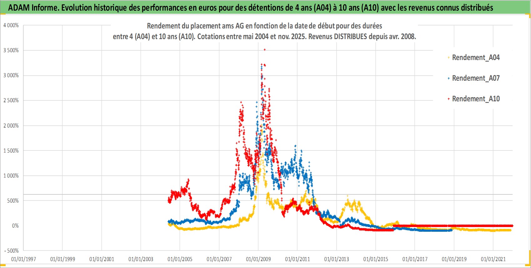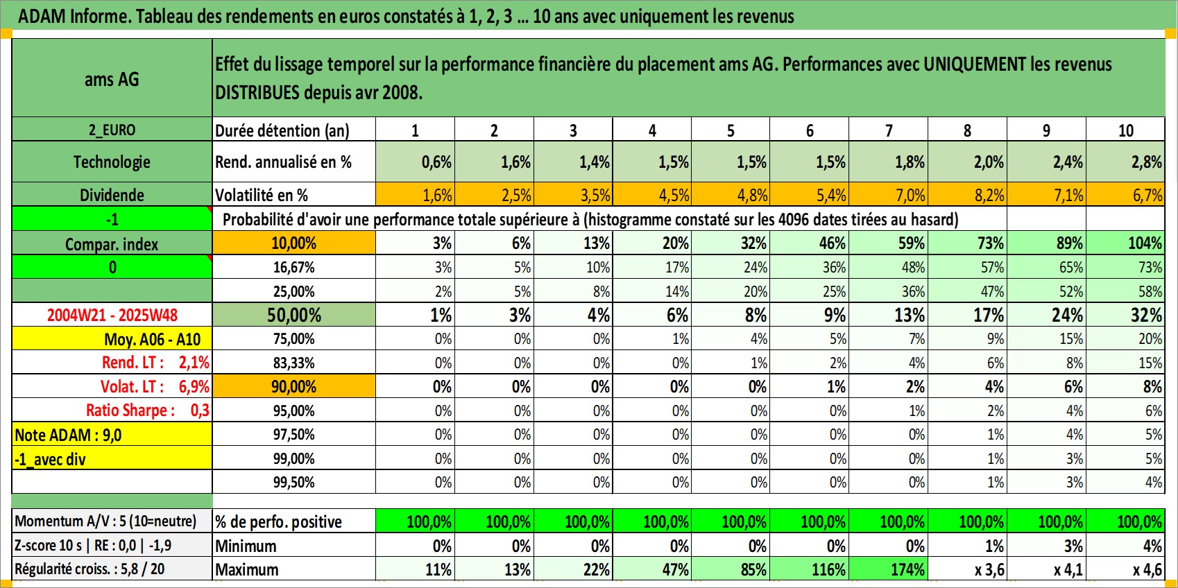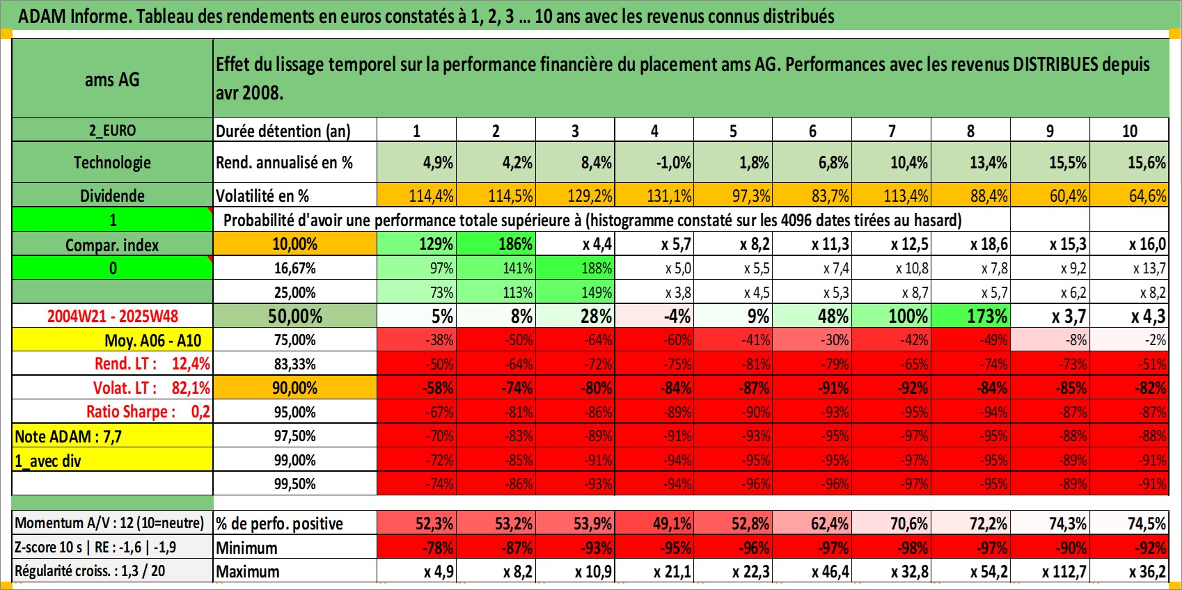 Site dédié aux investisseursPage dédiée sur site financeAnalyse des valorisations hebdomadaires de l'action ams AG. Cet actif est cote en CHF. Les valorisations sont en contrevaleur EURO et couvrent les semaines 2004W21 a 2025W48. Les revenus de cet actif financier sont pris en compte depuis la semaine 2008W14. La note ESG de cet actif n'est pas connue.