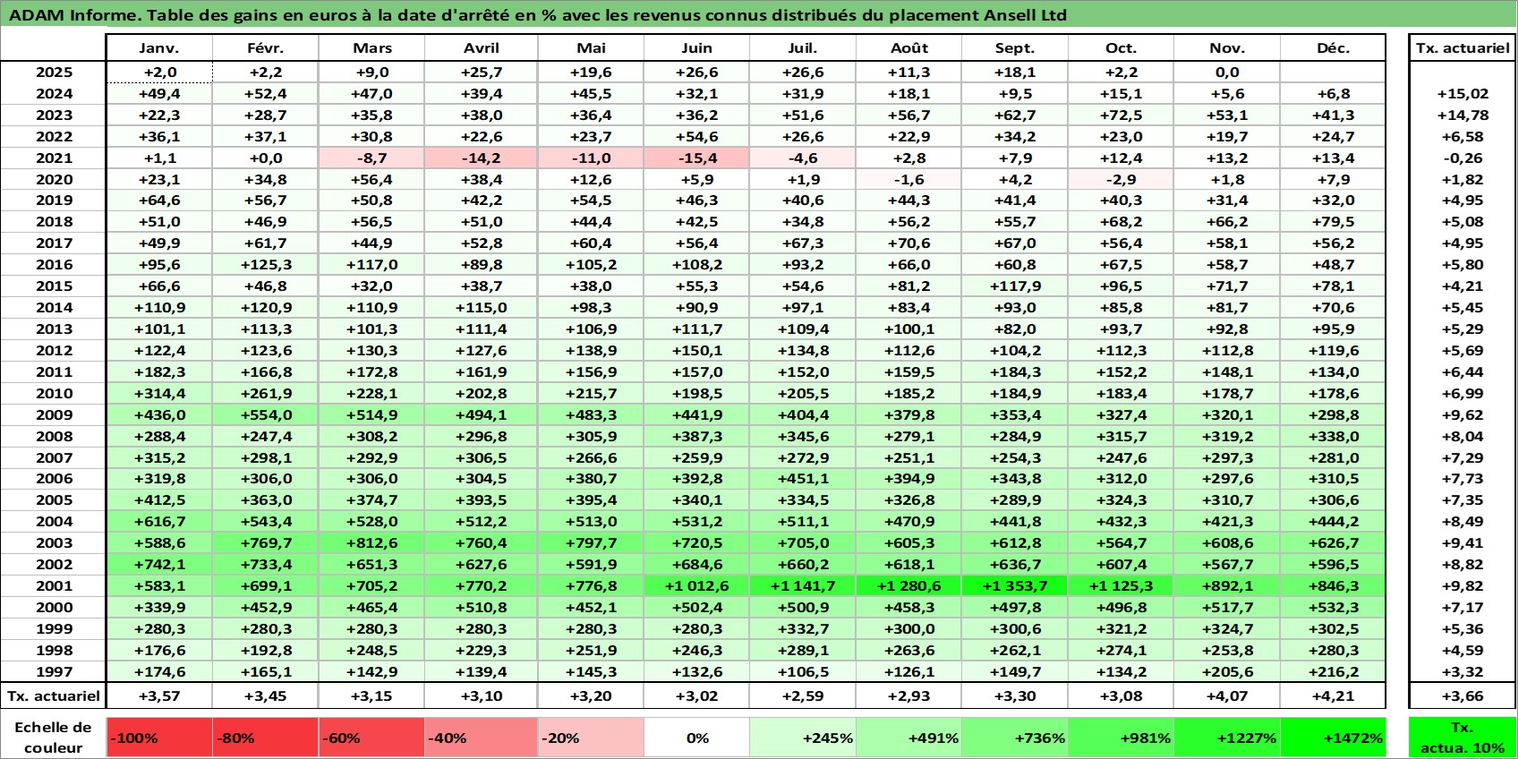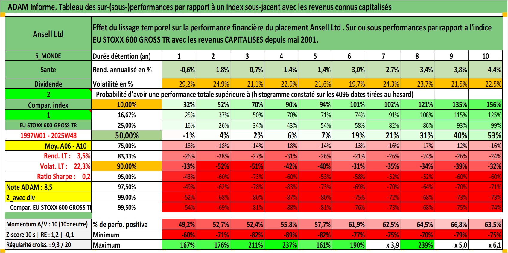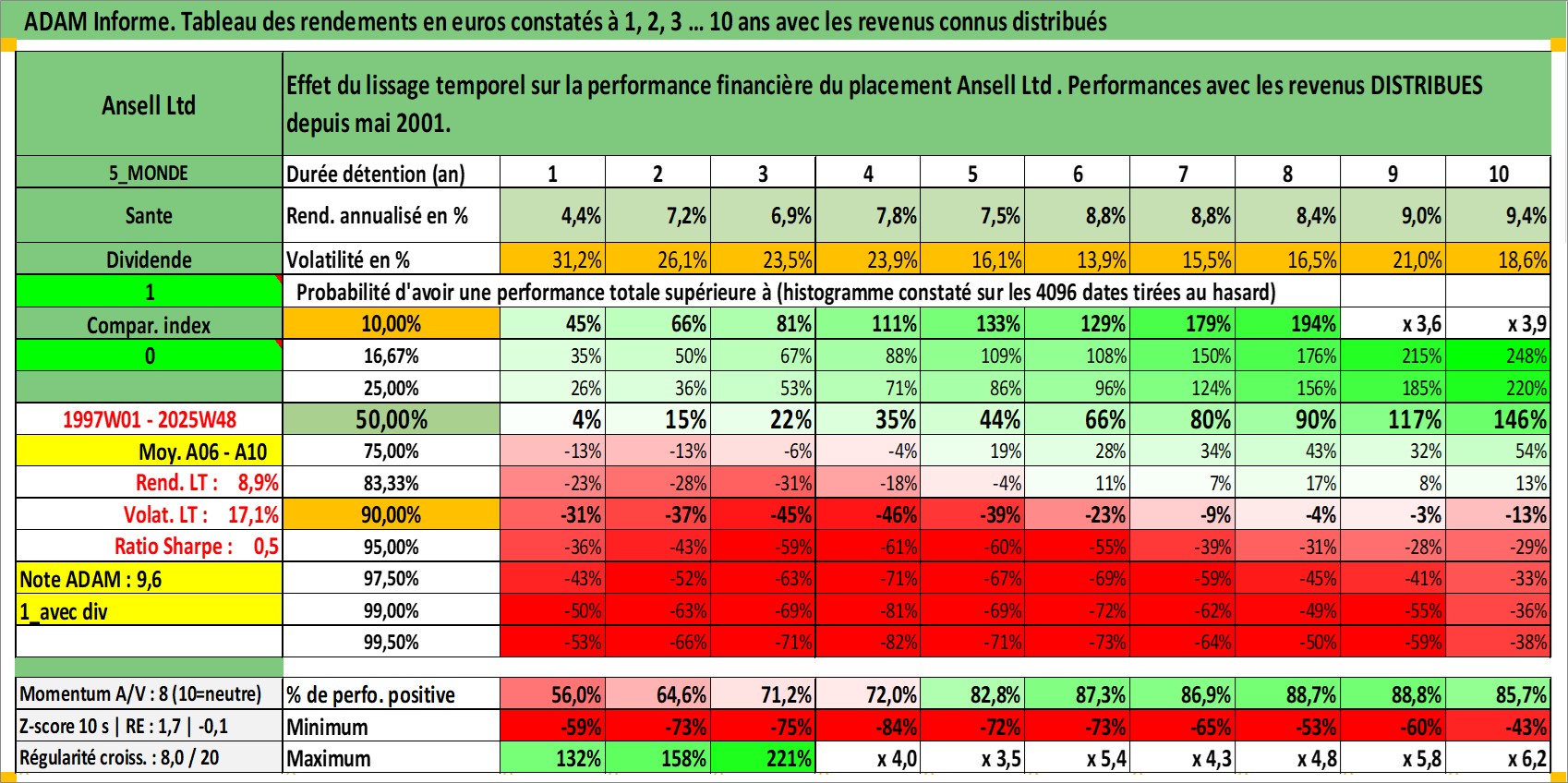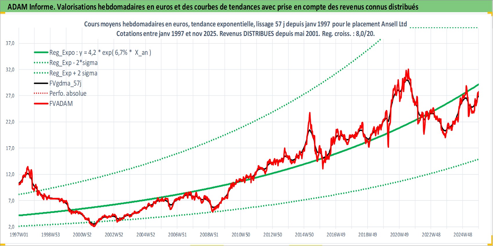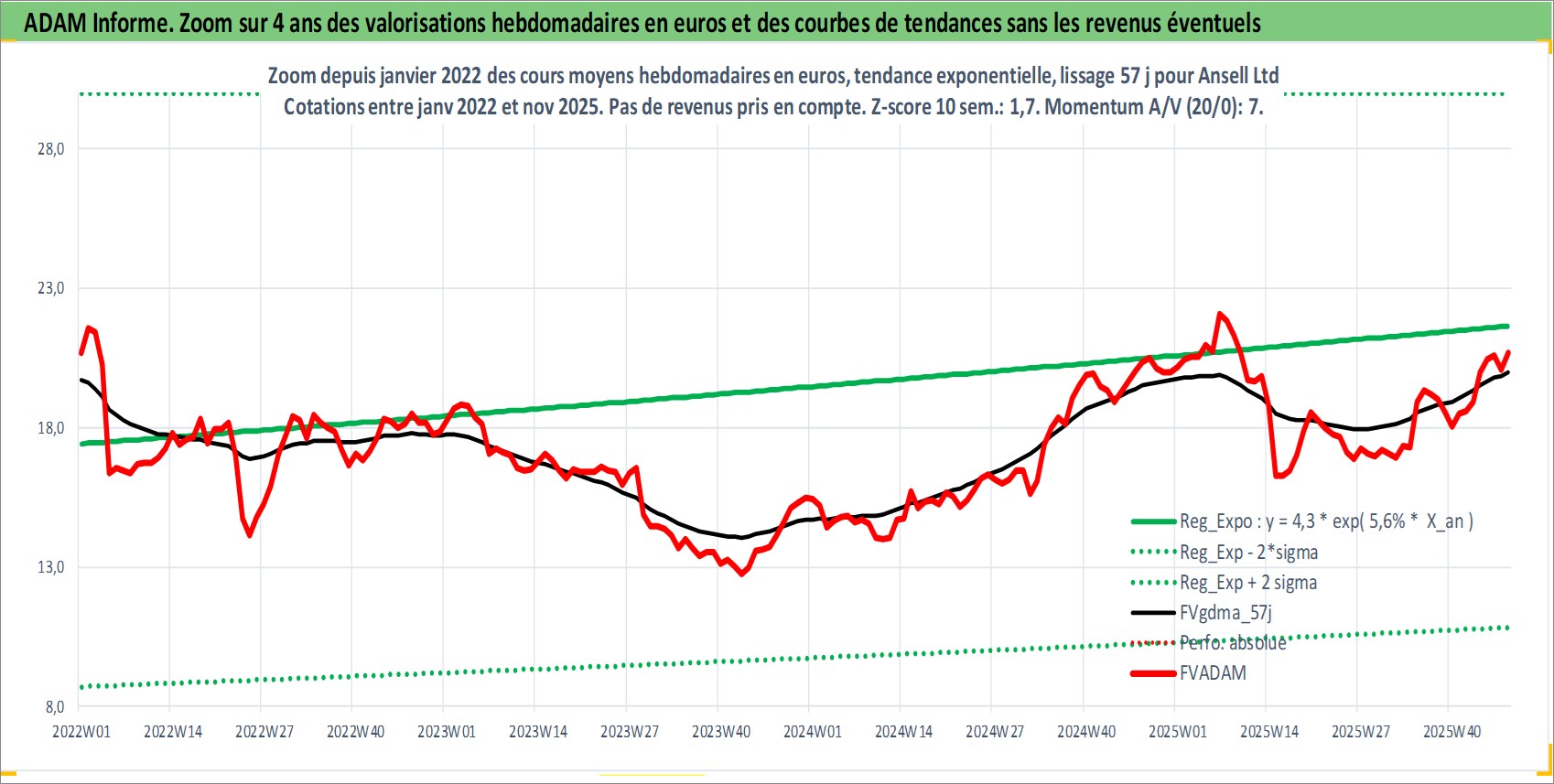 Site dédié aux investisseursPage dédiée sur site financeAnalyse des valorisations hebdomadaires de l'action Ansell Ltd . Cet actif est cote en AUD. Les valorisations sont en contrevaleur EURO et couvrent les semaines 1997W01 a 2025W48. Les revenus de cet actif financier sont pris en compte depuis la semaine 2001W22. La note ESG de cet actif n'est pas connue.