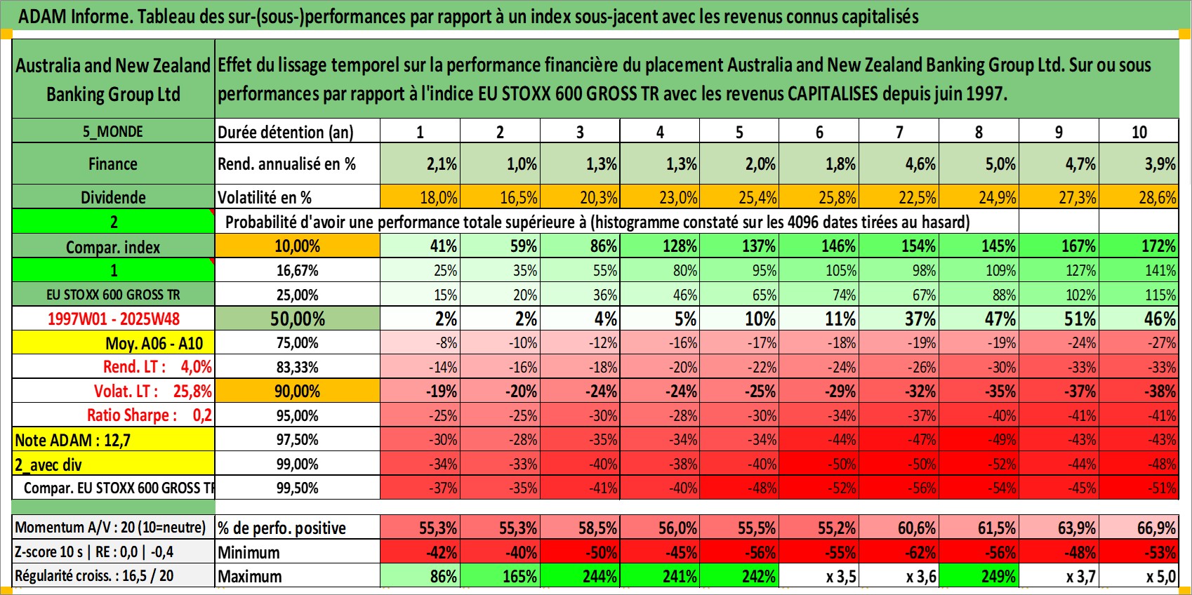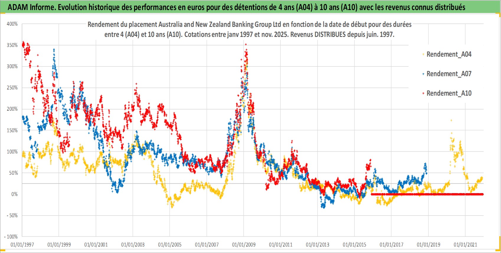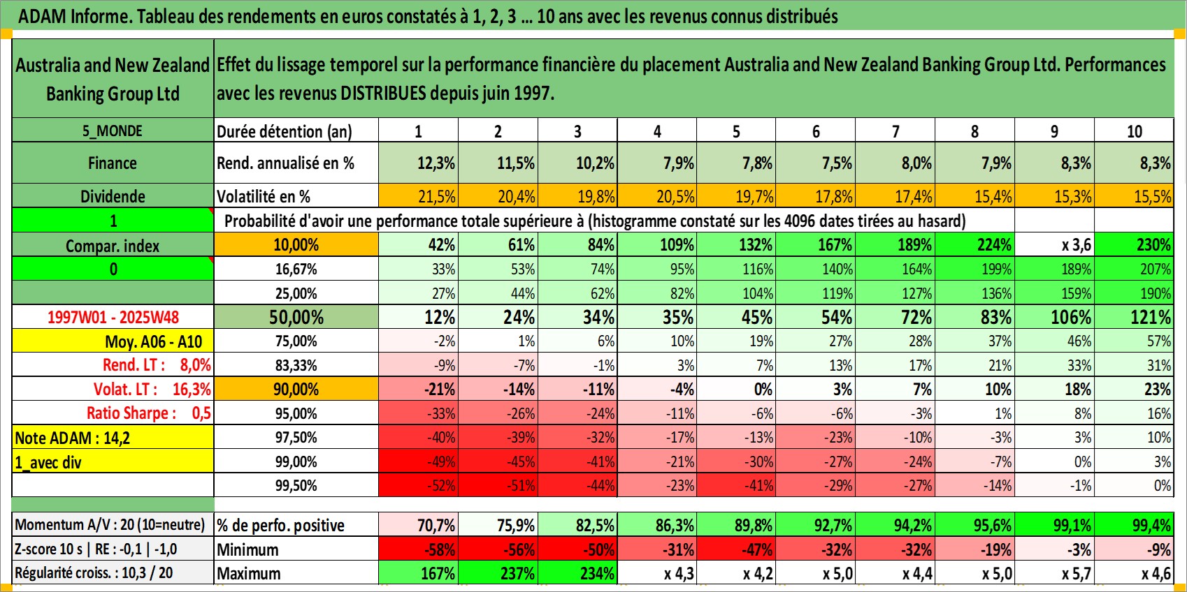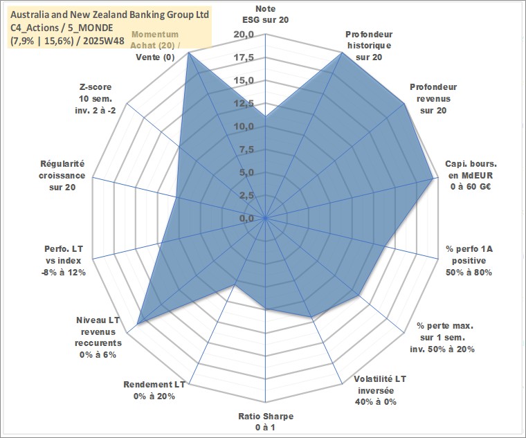 Site dédié aux investisseursPage dédiée sur site financeAnalyse des valorisations hebdomadaires de l'action Australia and New Zealand Banking Group Ltd. Cet actif est cote en AUD. Les valorisations sont en contrevaleur EURO et couvrent les semaines 1997W01 a 2025W48. Les revenus de cet actif financier sont pris en compte depuis la semaine 1997W23. La note globale ESG de cet actif est estimee a 11.0 (apres rebasage entre 0 et 20).