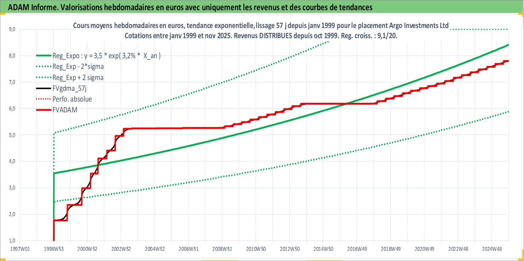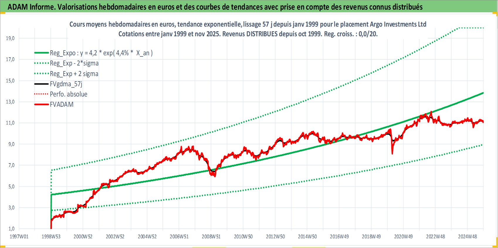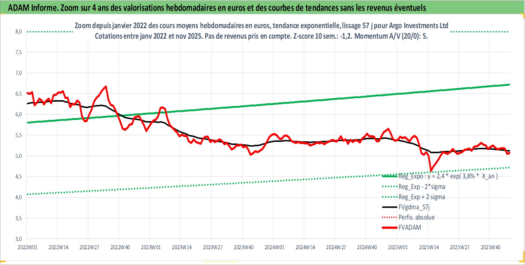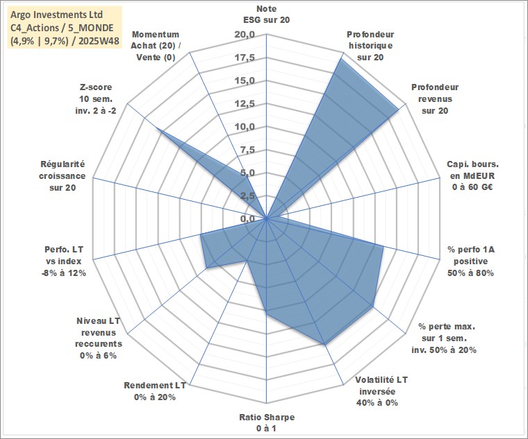 Site dédié aux investisseursPage dédiée sur site financeAnalyse des valorisations hebdomadaires de l'action Argo Investments Ltd. Cet actif est cote en AUD. Les valorisations sont en contrevaleur EURO et couvrent les semaines 1999W01 a 2025W48. Les revenus de cet actif financier sont pris en compte depuis la semaine 1999W42. La note ESG de cet actif n'est pas connue.