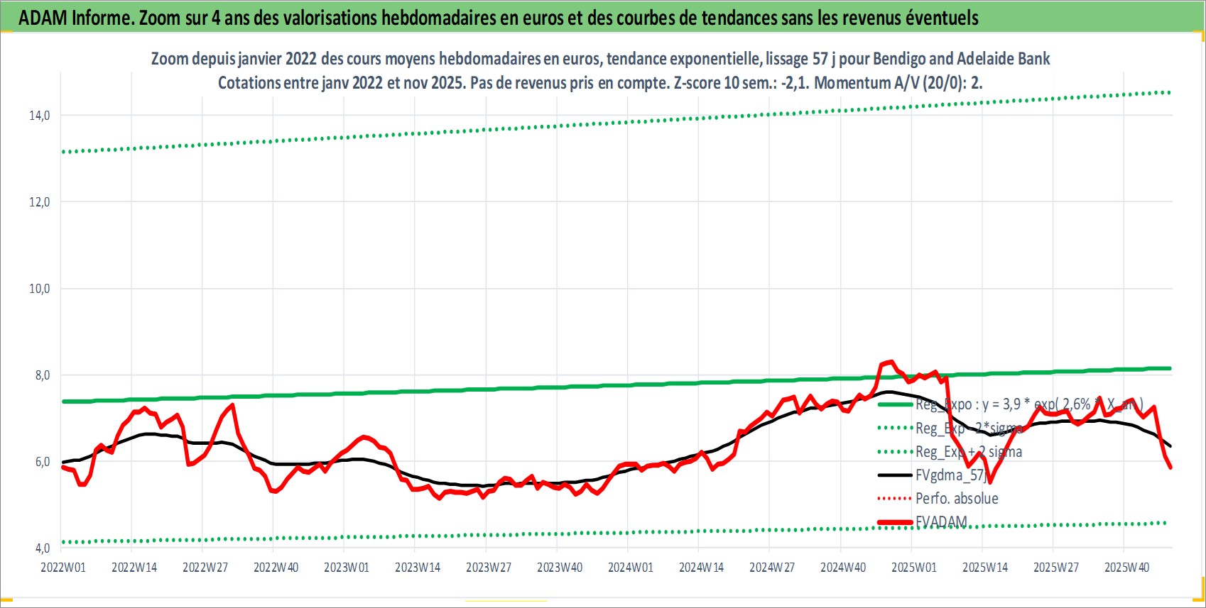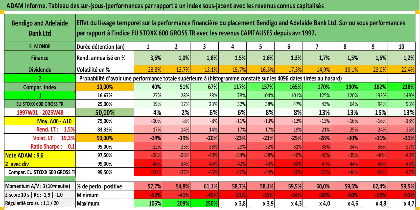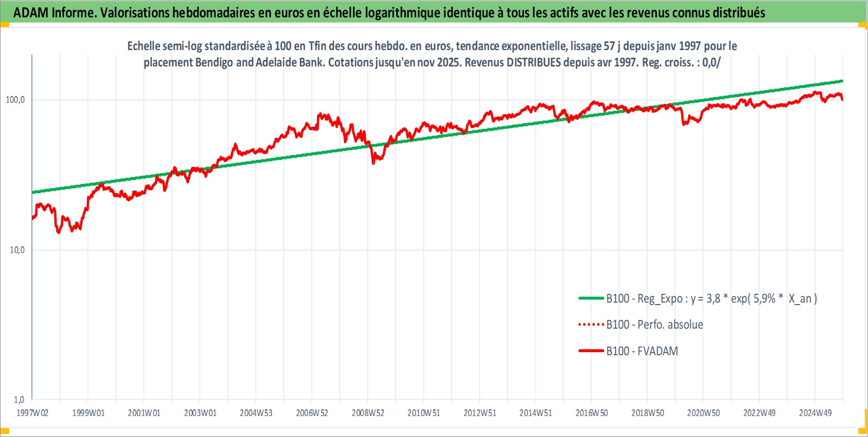 Site dédié aux investisseursPage dédiée sur site financeAnalyse des valorisations hebdomadaires de l'action Bendigo and Adelaide Bank Ltd. Cet actif est cote en AUD. Les valorisations sont en contrevaleur EURO et couvrent les semaines 1997W01 a 2025W48. Les revenus de cet actif financier sont pris en compte depuis la semaine 1997W15. La note ESG de cet actif n'est pas connue.