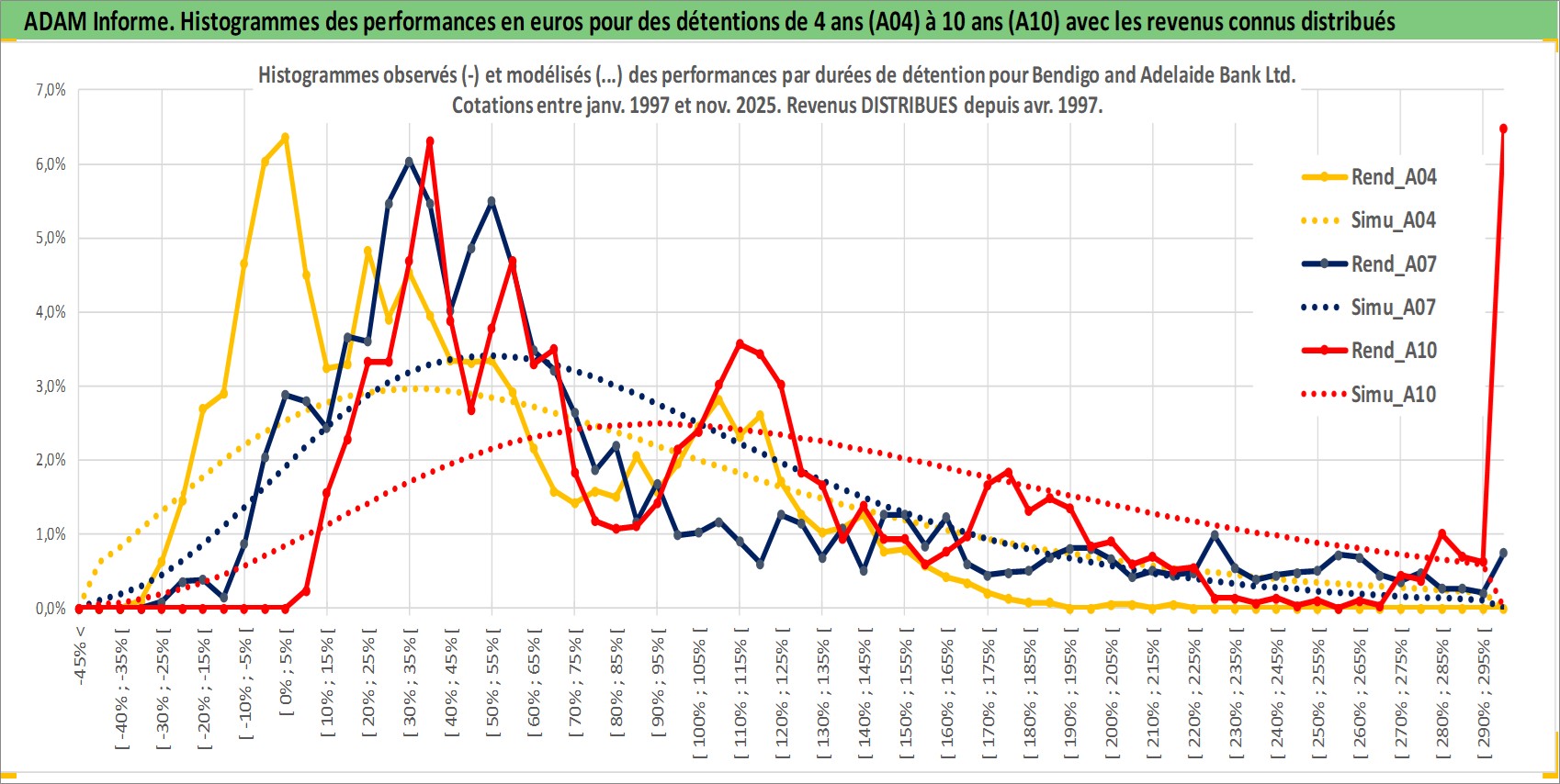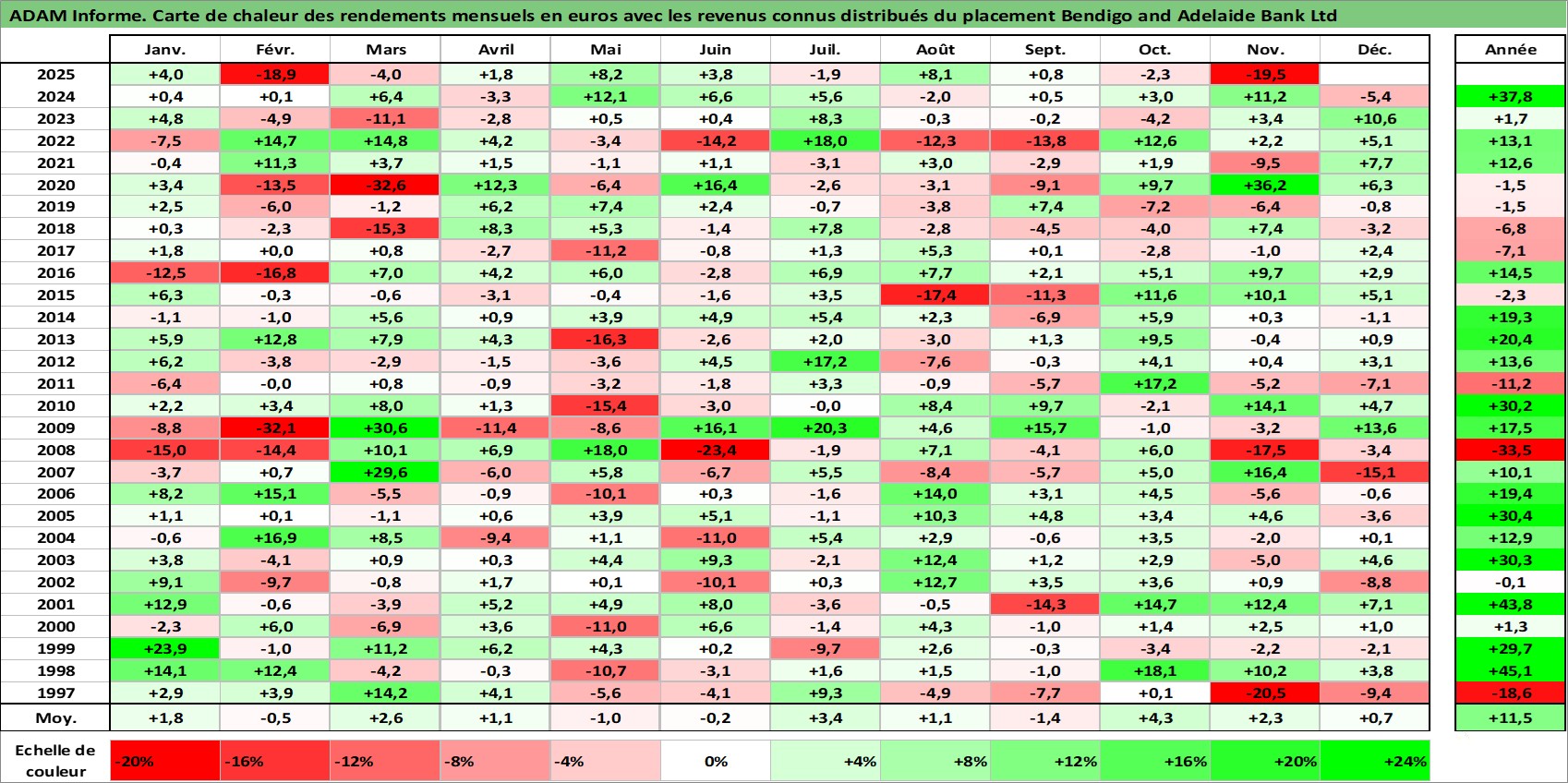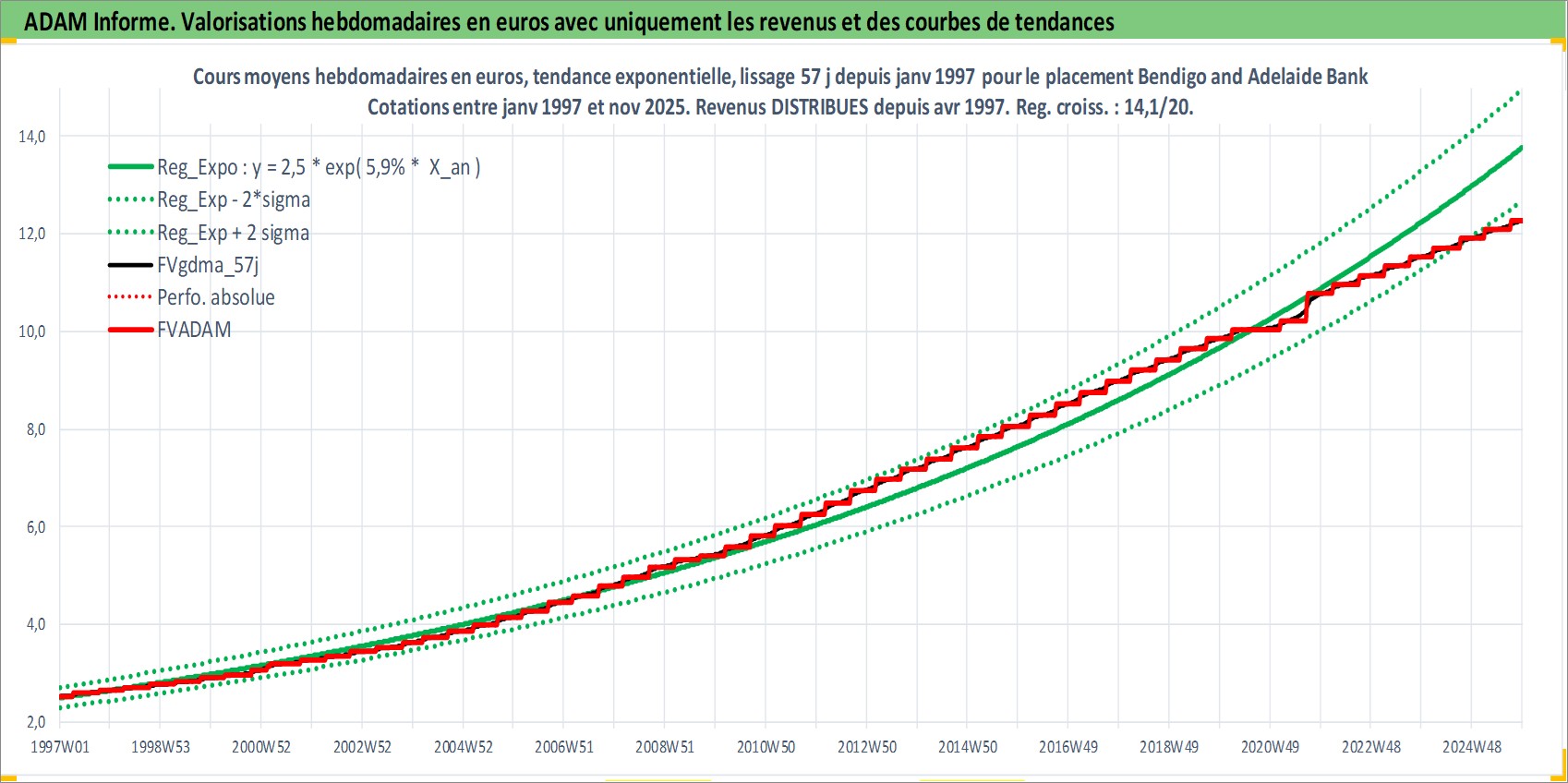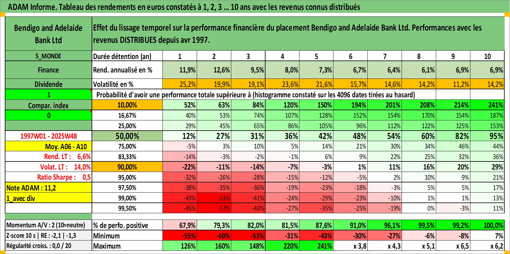 Site dédié aux investisseursPage dédiée sur site financeAnalyse des valorisations hebdomadaires de l'action Bendigo and Adelaide Bank Ltd. Cet actif est cote en AUD. Les valorisations sont en contrevaleur EURO et couvrent les semaines 1997W01 a 2025W48. Les revenus de cet actif financier sont pris en compte depuis la semaine 1997W15. La note ESG de cet actif n'est pas connue.