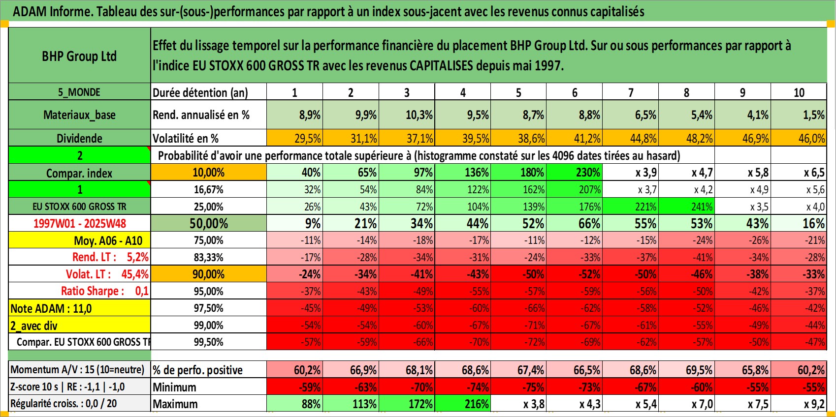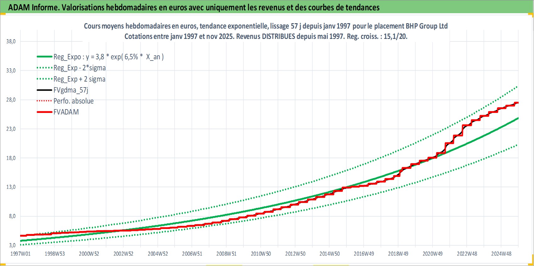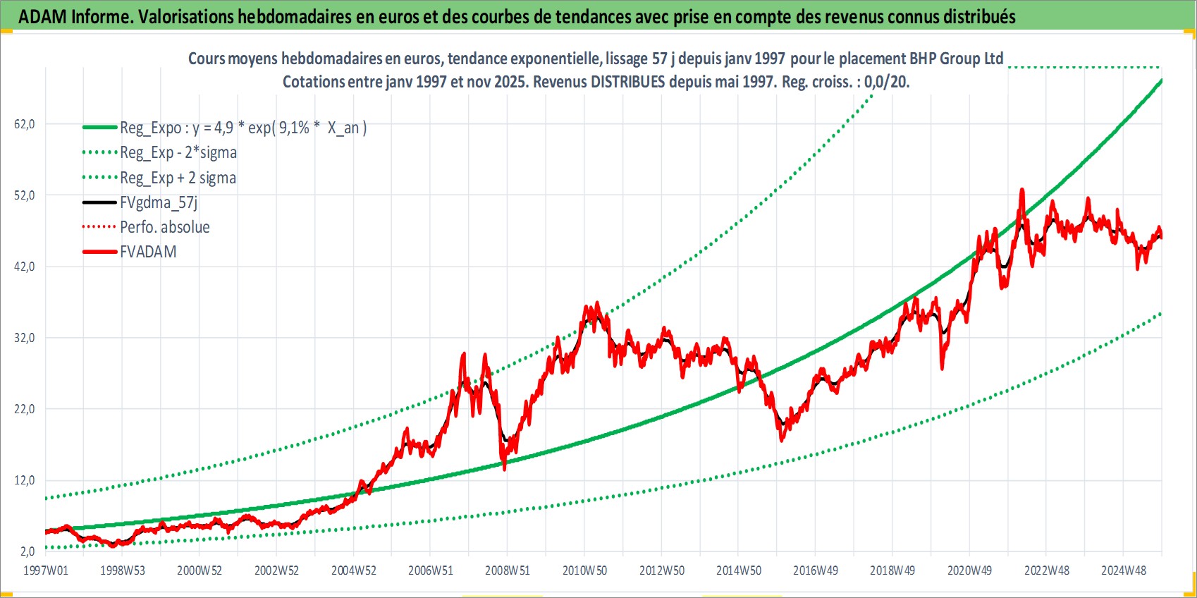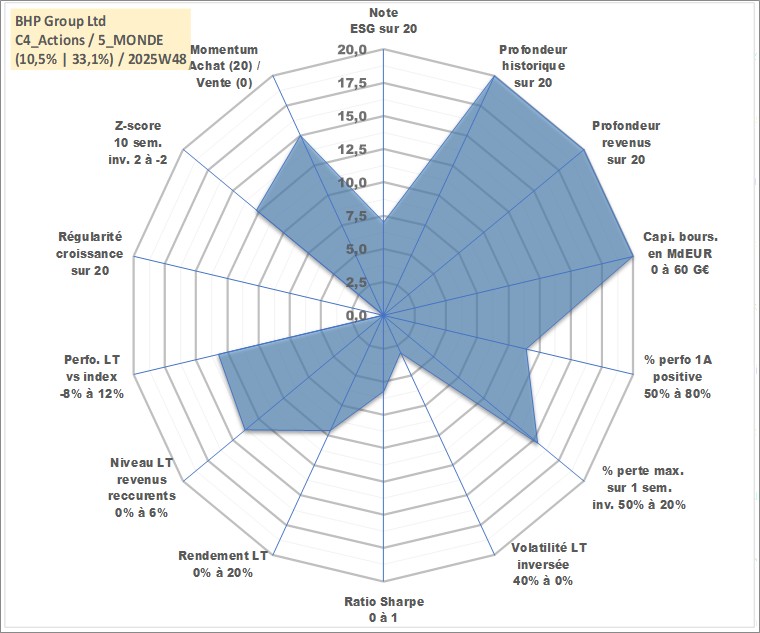 Site dédié aux investisseursPage dédiée sur site financeAnalyse des valorisations hebdomadaires de l'action BHP Group Ltd. Cet actif est cote en AUD. Les valorisations sont en contrevaleur EURO et couvrent les semaines 1997W01 a 2025W48. Les revenus de cet actif financier sont pris en compte depuis la semaine 1997W20. La note globale ESG de cet actif est estimee a 7.0 (apres rebasage entre 0 et 20).