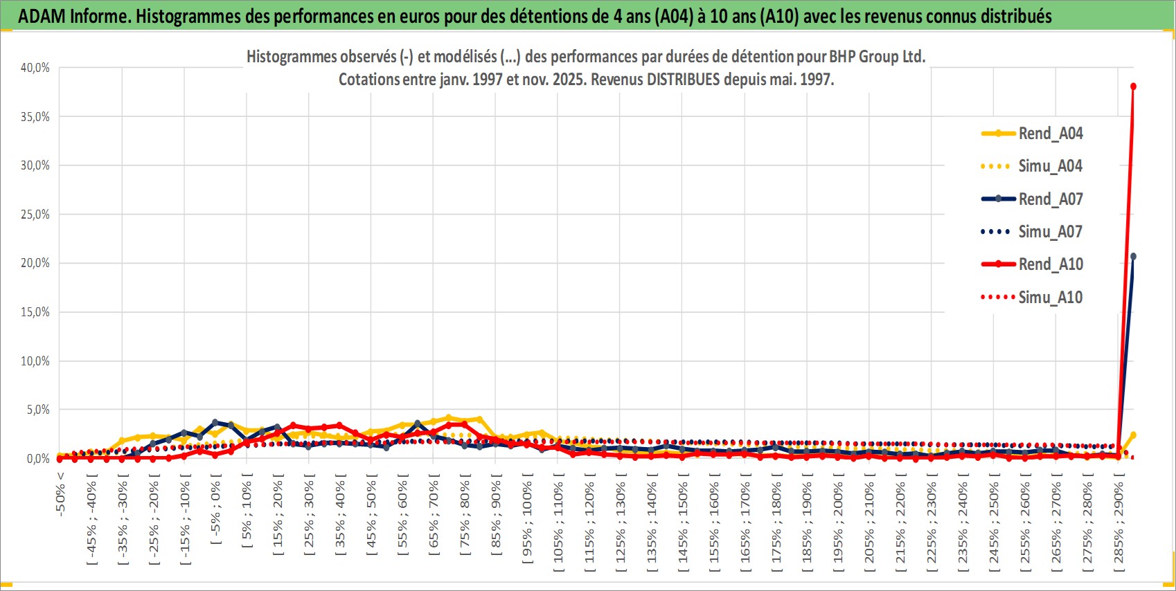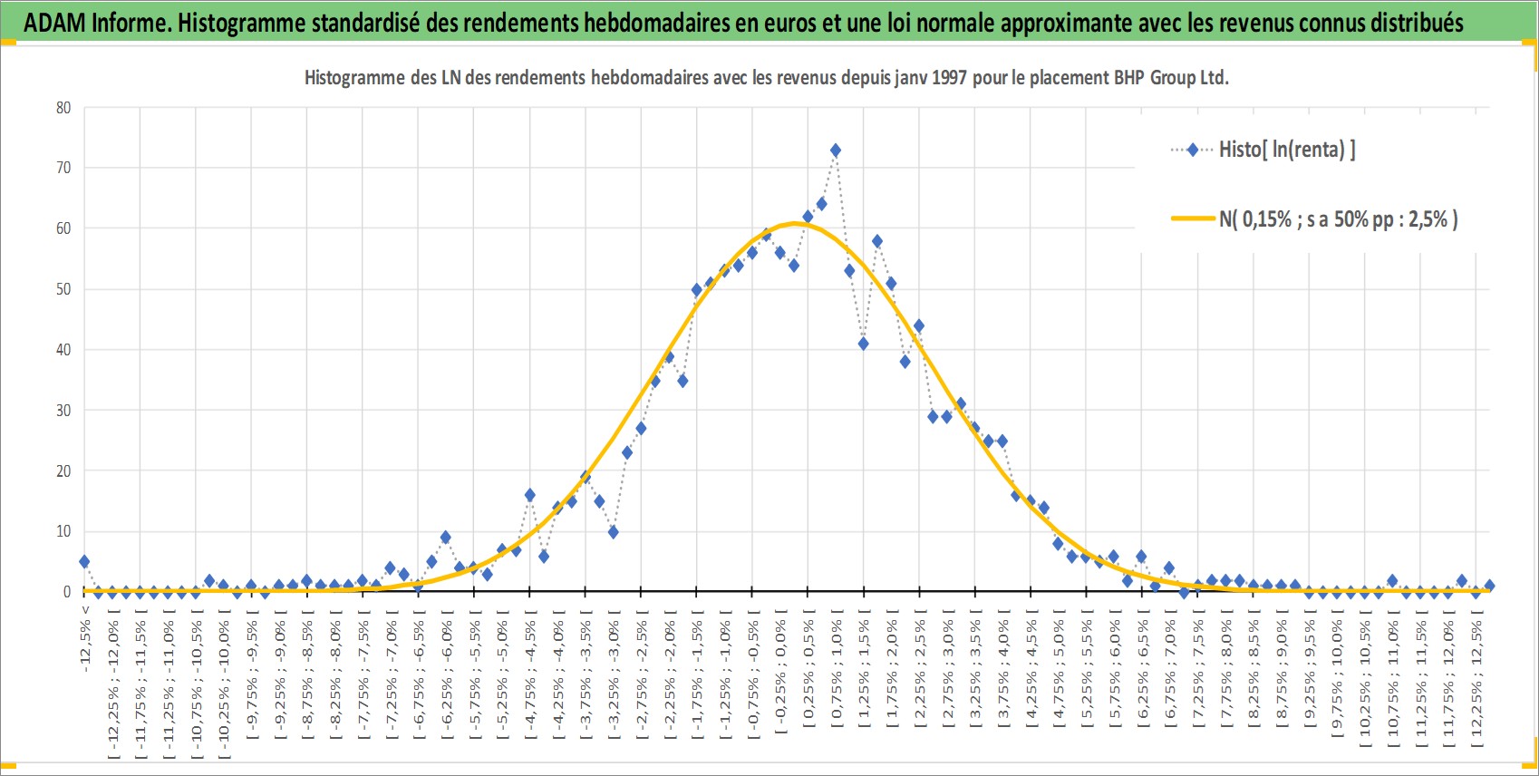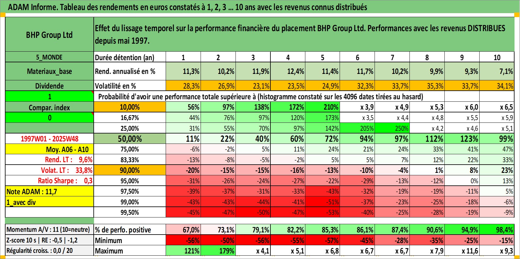 Site dédié aux investisseursPage dédiée sur site financeAnalyse des valorisations hebdomadaires de l'action BHP Group Ltd. Cet actif est cote en AUD. Les valorisations sont en contrevaleur EURO et couvrent les semaines 1997W01 a 2025W48. Les revenus de cet actif financier sont pris en compte depuis la semaine 1997W20. La note globale ESG de cet actif est estimee a 7.0 (apres rebasage entre 0 et 20).