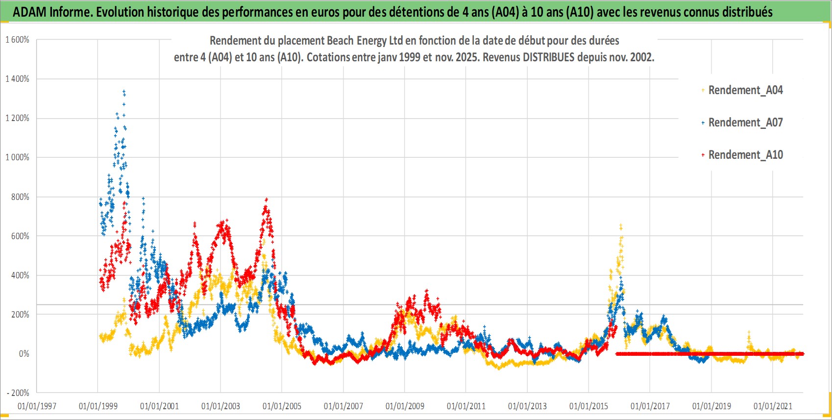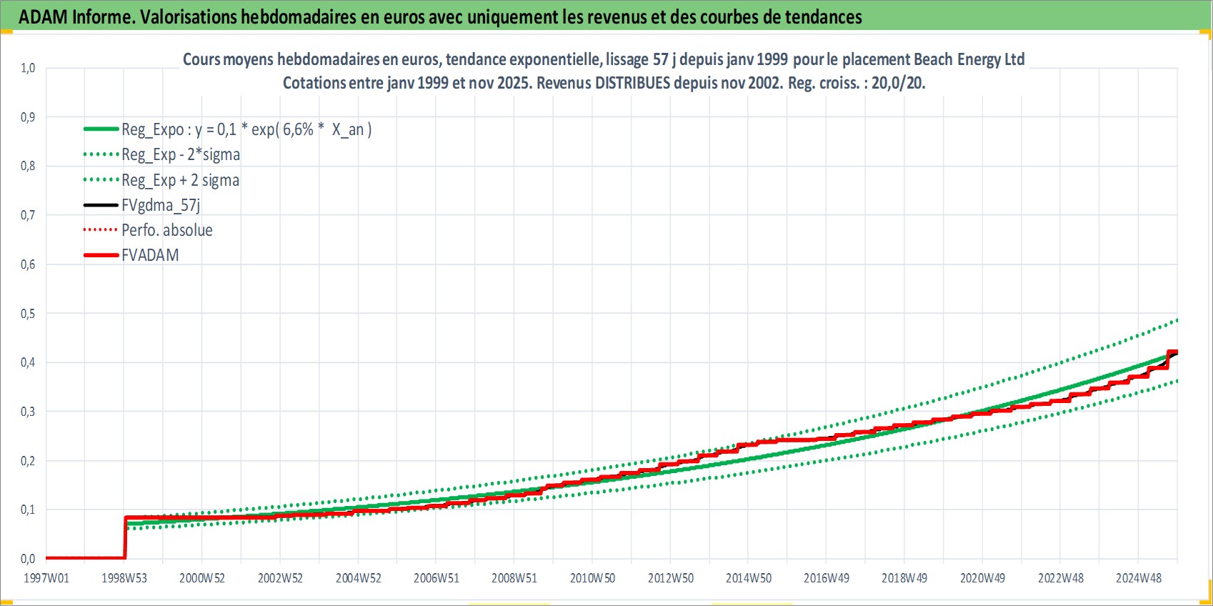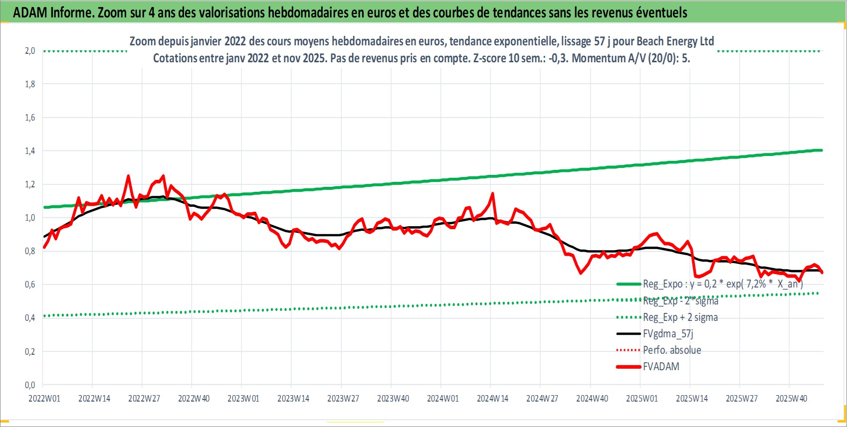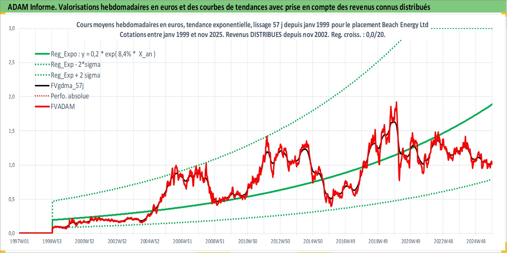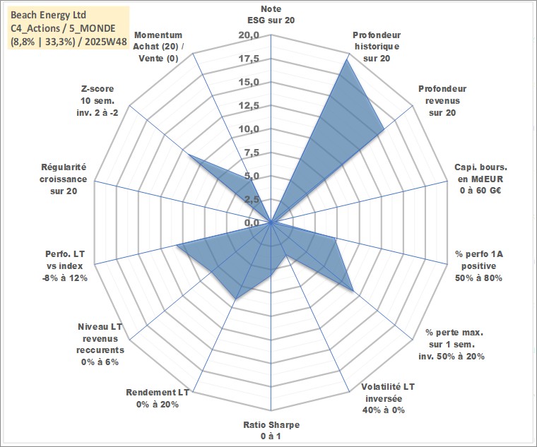 Site dédié aux investisseursPage dédiée sur site financeAnalyse des valorisations hebdomadaires de l'action Beach Energy Ltd. Cet actif est cote en AUD. Les valorisations sont en contrevaleur EURO et couvrent les semaines 1999W02 a 2025W48. Les revenus de cet actif financier sont pris en compte depuis la semaine 2002W46. La note ESG de cet actif n'est pas connue.