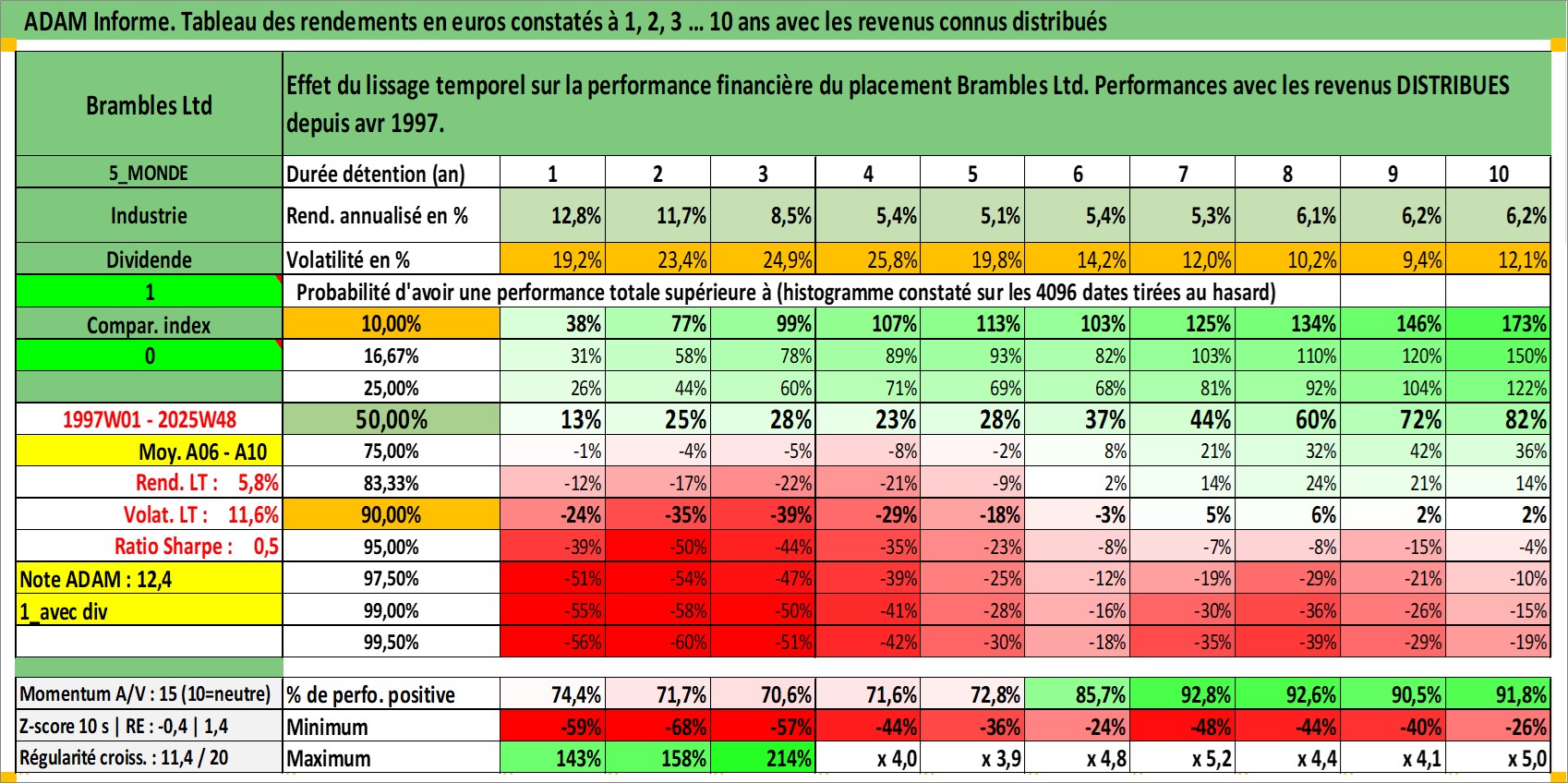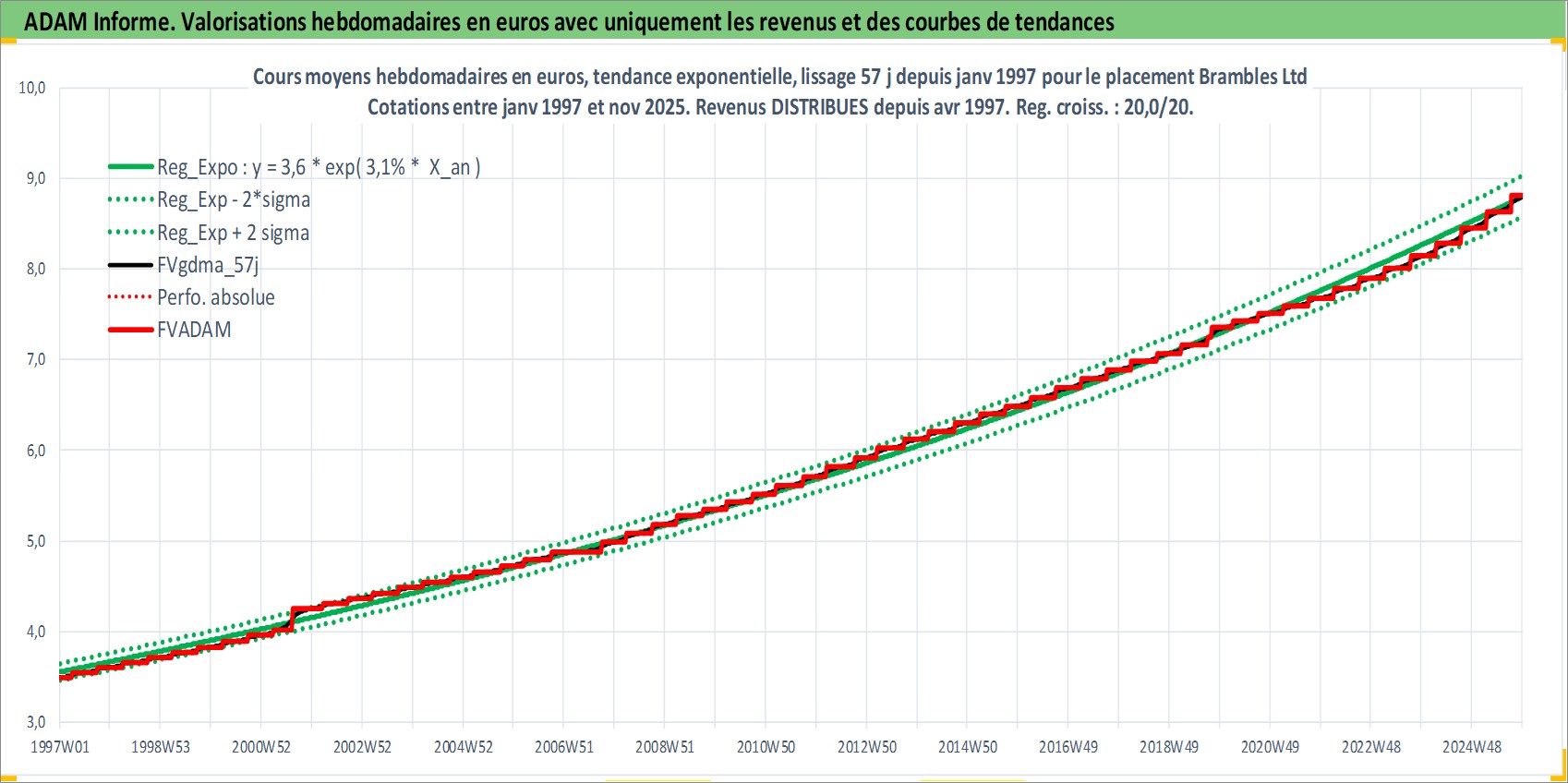 Site dédié aux investisseursPage dédiée sur site financeAnalyse des valorisations hebdomadaires de l'action Brambles Ltd. Cet actif est cote en AUD. Les valorisations sont en contrevaleur EURO et couvrent les semaines 1997W01 a 2025W48. Les revenus de cet actif financier sont pris en compte depuis la semaine 1997W14. La note globale ESG de cet actif est estimee a 14.0 (apres rebasage entre 0 et 20).