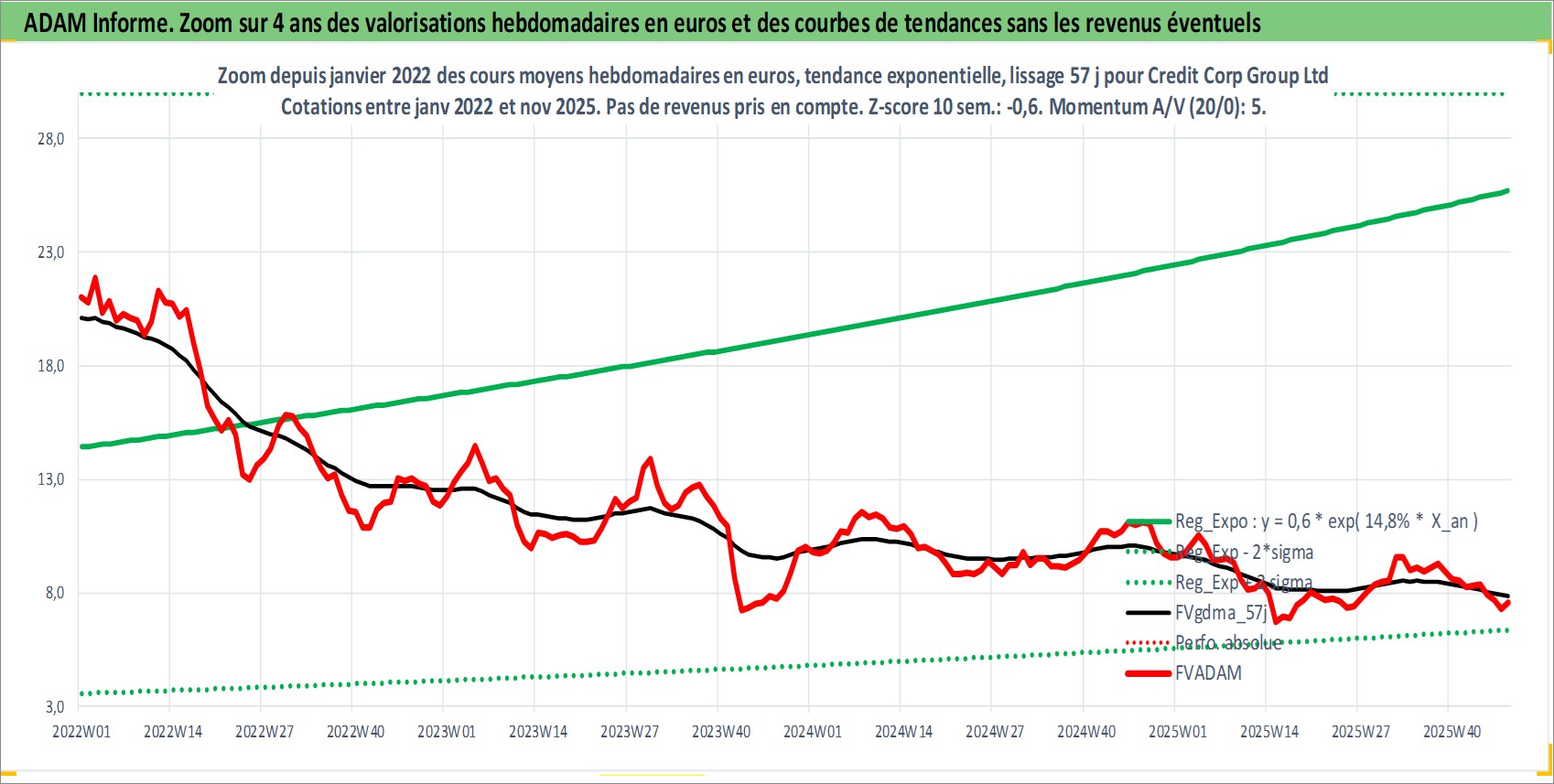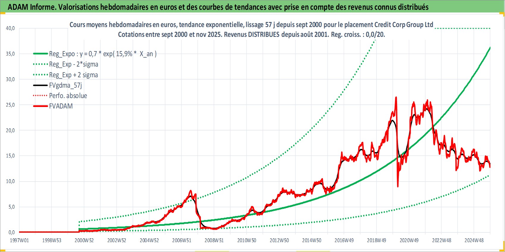 Site dédié aux investisseursPage dédiée sur site financeAnalyse des valorisations hebdomadaires de l'action Credit Corp Group Ltd. Cet actif est cote en AUD. Les valorisations sont en contrevaleur EURO et couvrent les semaines 2000W36 a 2025W48. Les revenus de cet actif financier sont pris en compte depuis la semaine 2001W33. La note ESG de cet actif n'est pas connue.