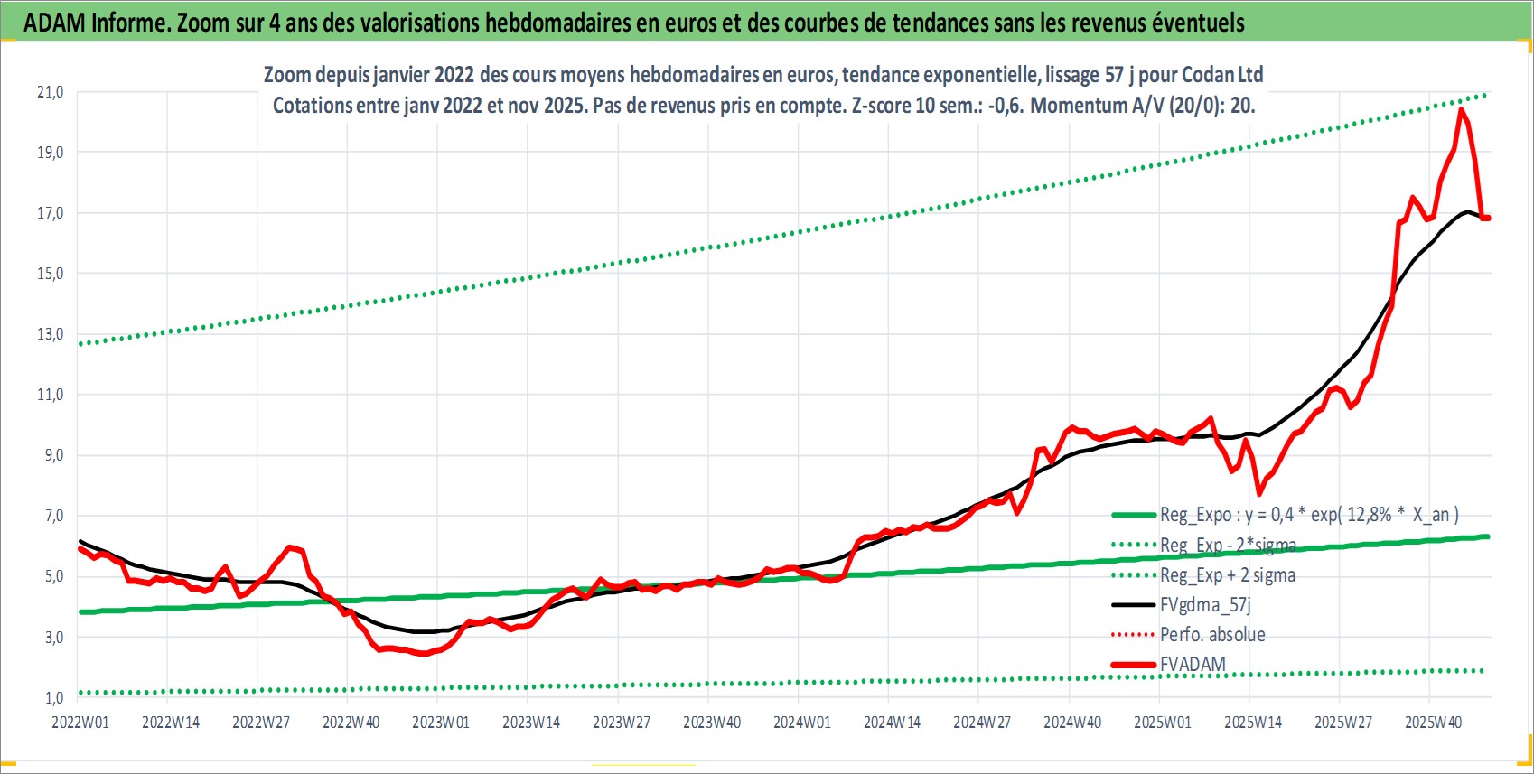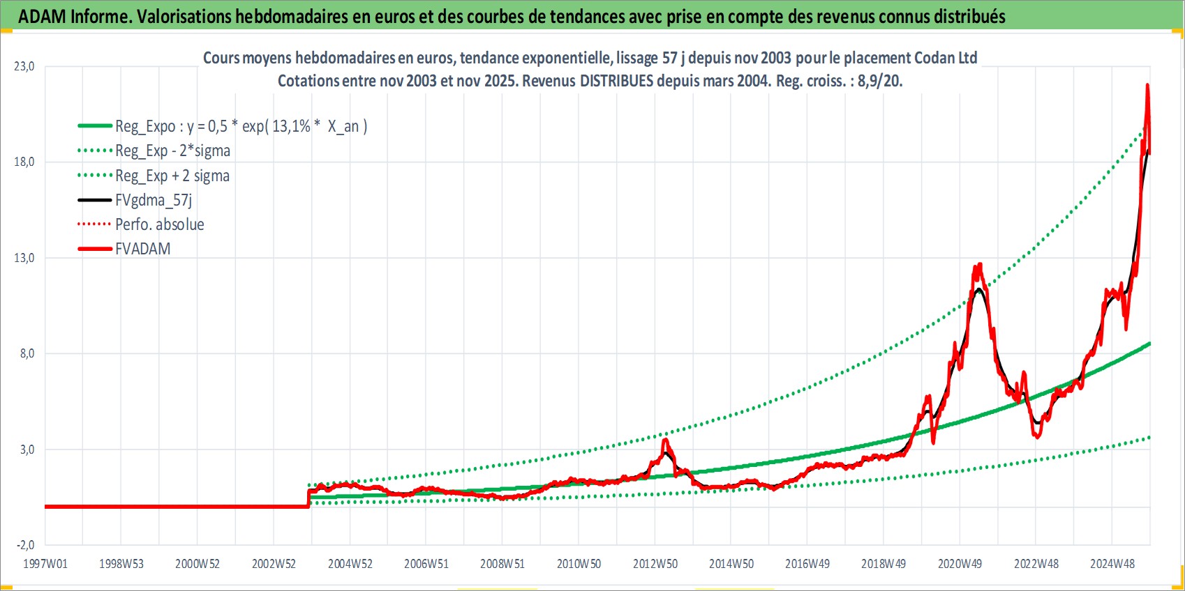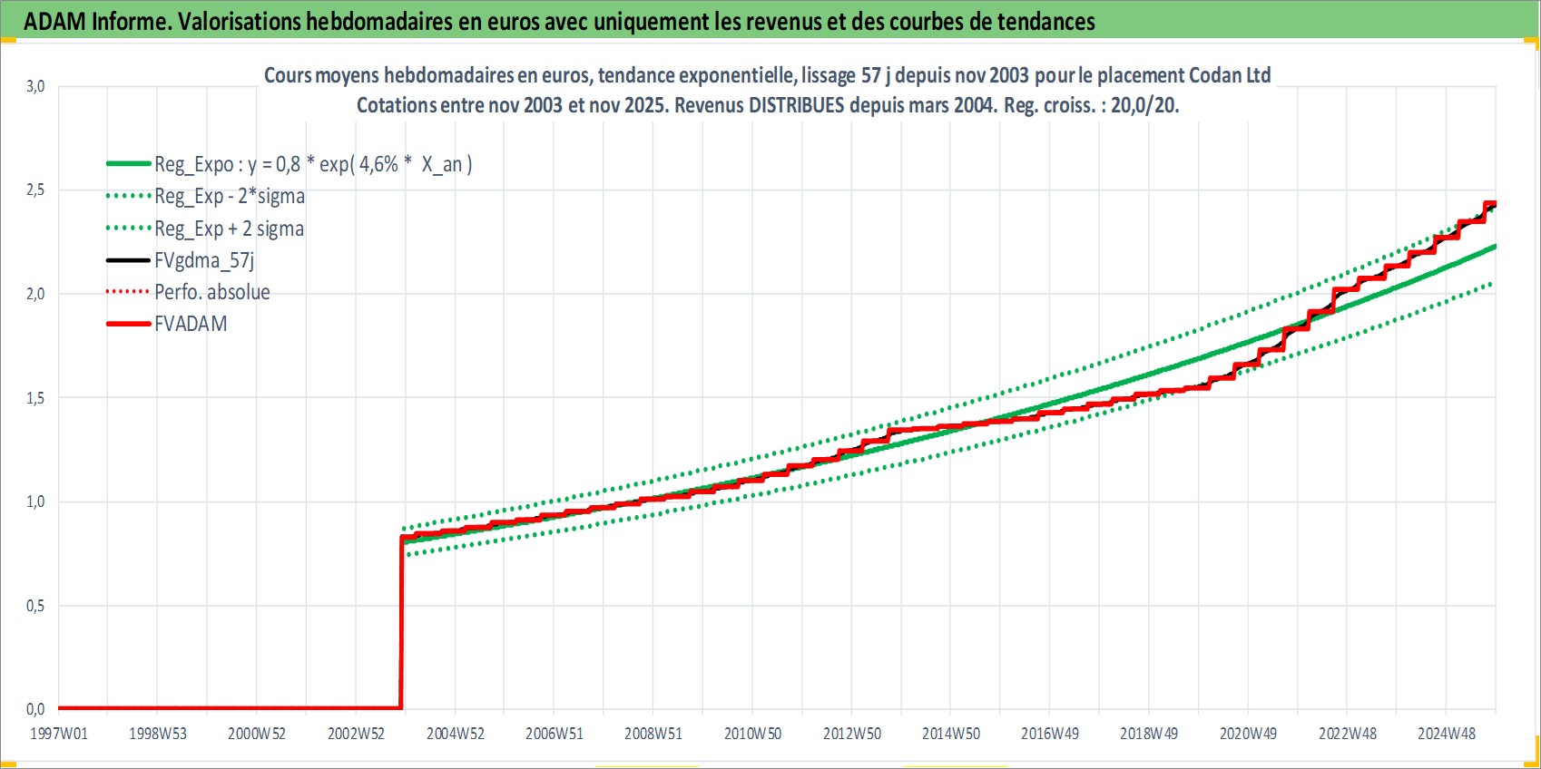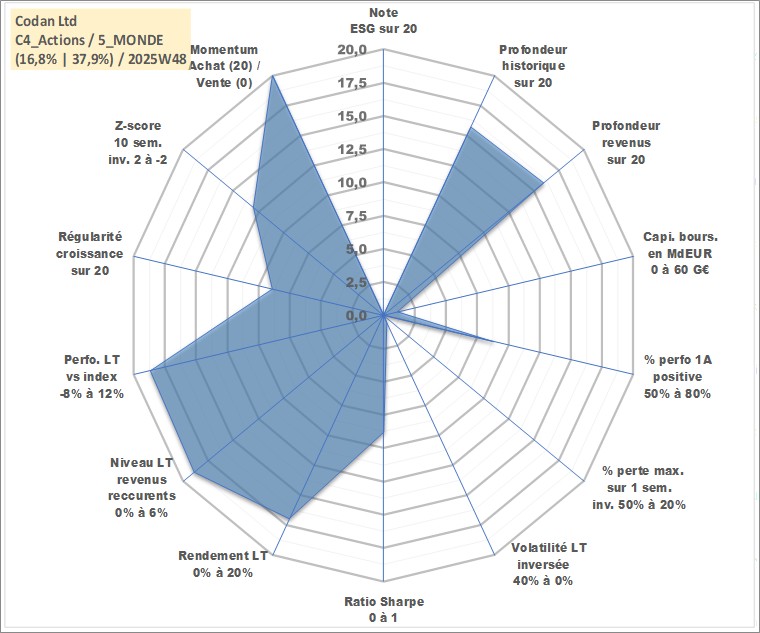 Site dédié aux investisseursPage dédiée sur site financeAnalyse des valorisations hebdomadaires de l'action Codan Ltd. Cet actif est cote en AUD. Les valorisations sont en contrevaleur EURO et couvrent les semaines 2003W48 a 2025W48. Les revenus de cet actif financier sont pris en compte depuis la semaine 2004W11. La note ESG de cet actif n'est pas connue.