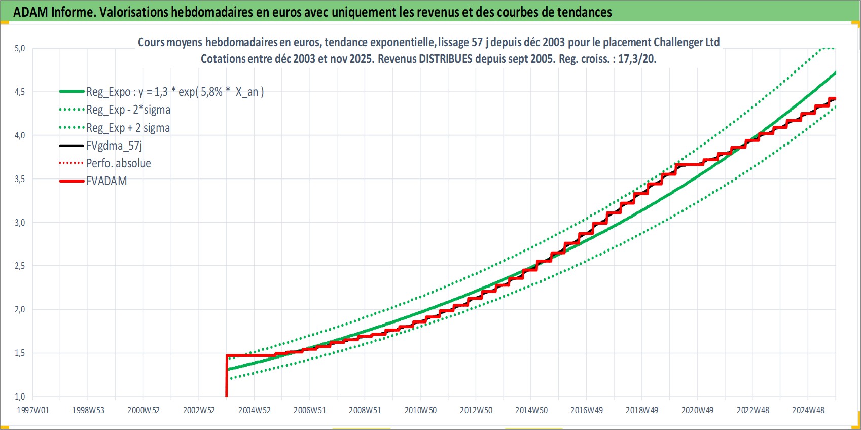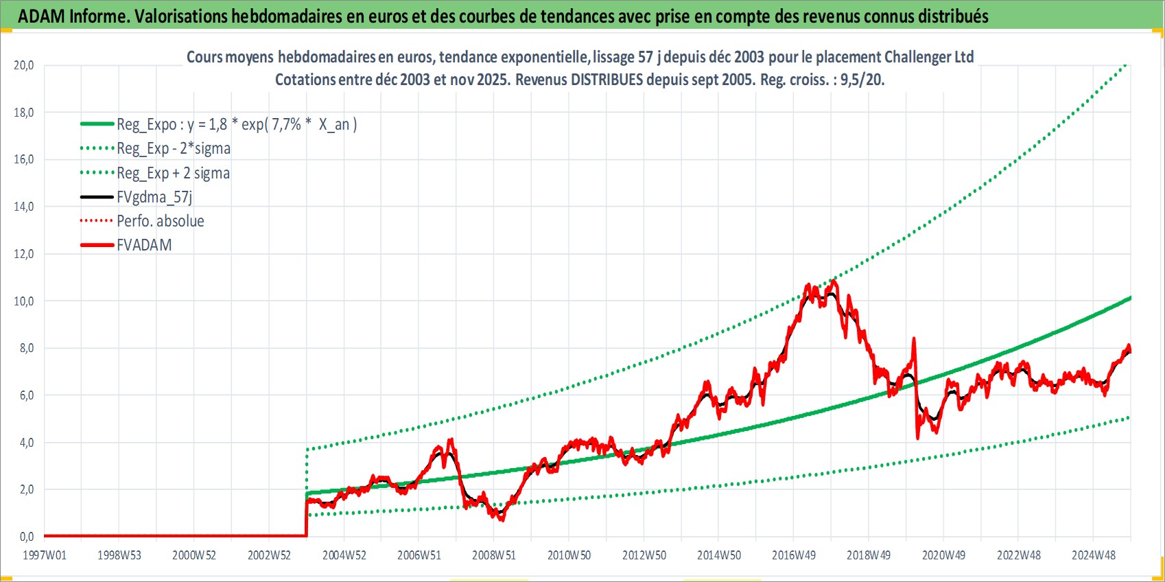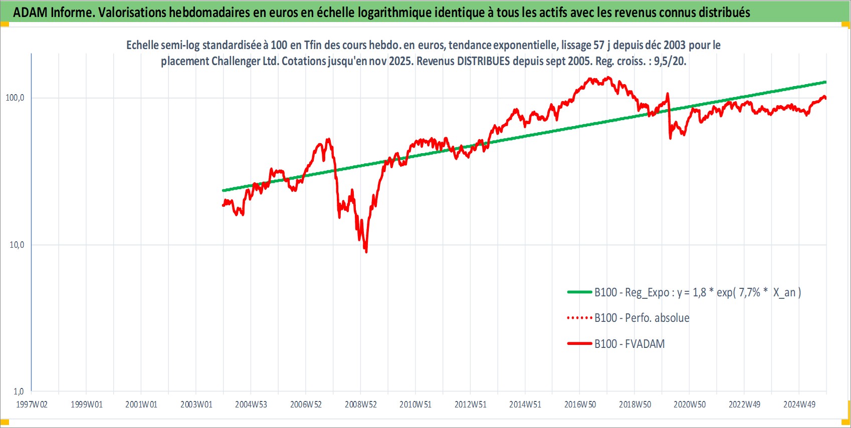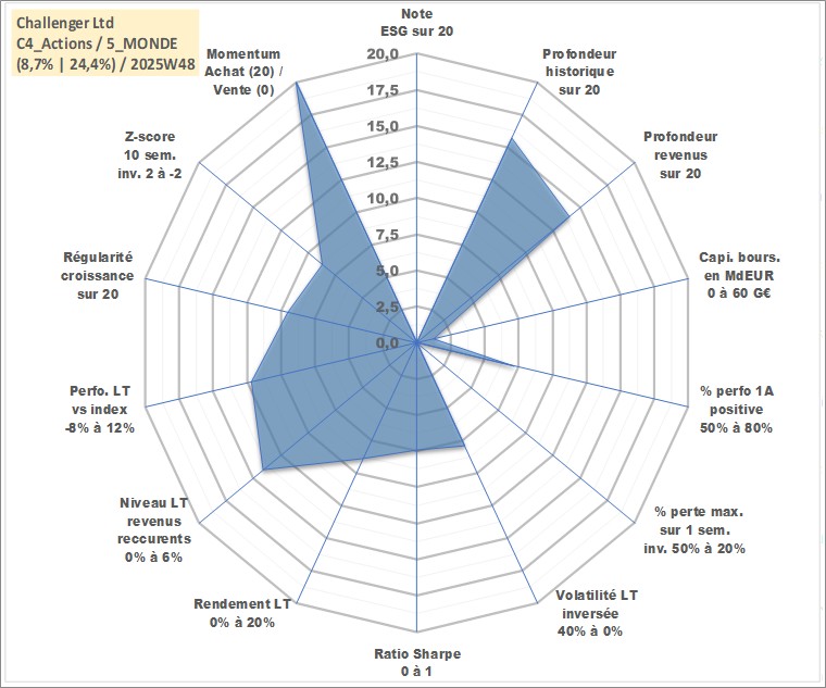 Site dédié aux investisseursPage dédiée sur site financeAnalyse des valorisations hebdomadaires de l'action Challenger Ltd. Cet actif est cote en AUD. Les valorisations sont en contrevaleur EURO et couvrent les semaines 2003W52 a 2025W48. Les revenus de cet actif financier sont pris en compte depuis la semaine 2005W39. La note ESG de cet actif n'est pas connue.