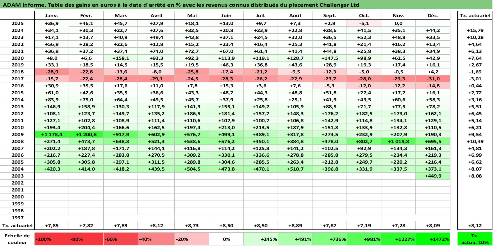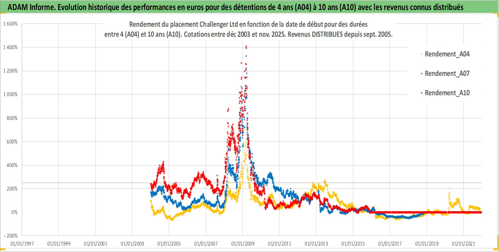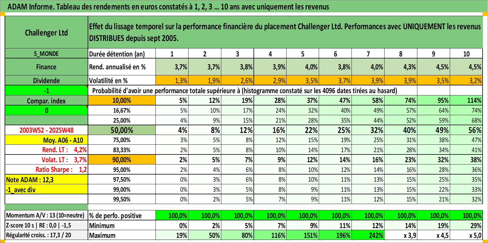Site dédié aux investisseursPage dédiée sur site financeAnalyse des valorisations hebdomadaires de l'action Challenger Ltd. Cet actif est cote en AUD. Les valorisations sont en contrevaleur EURO et couvrent les semaines 2003W52 a 2025W48. Les revenus de cet actif financier sont pris en compte depuis la semaine 2005W39. La note ESG de cet actif n'est pas connue.