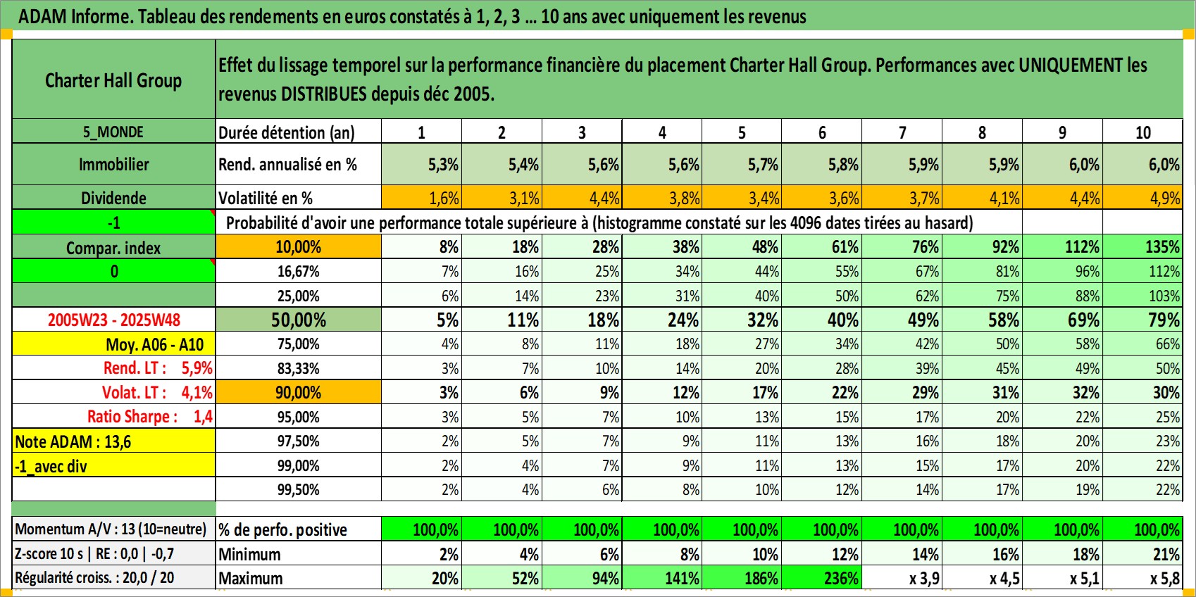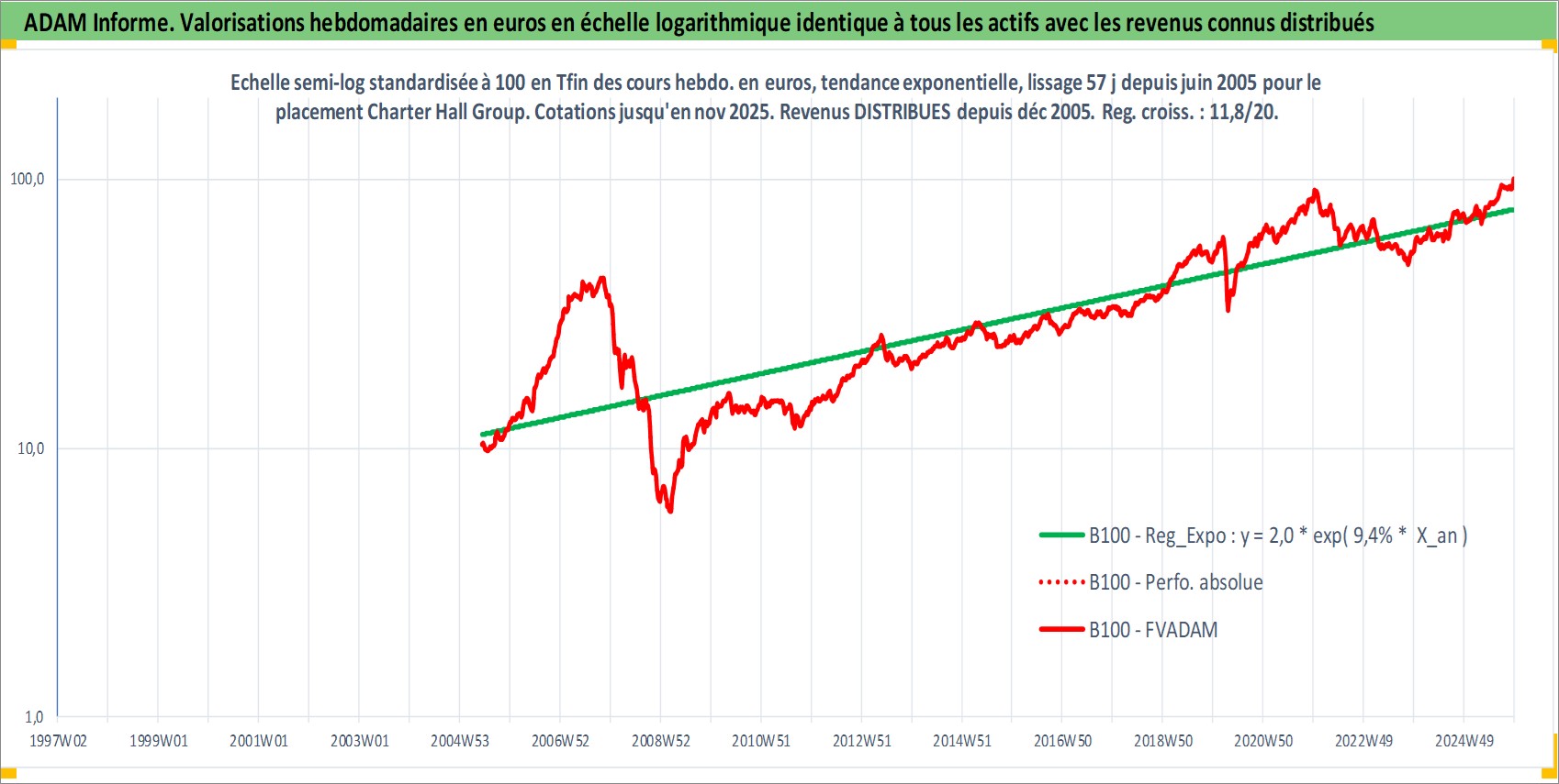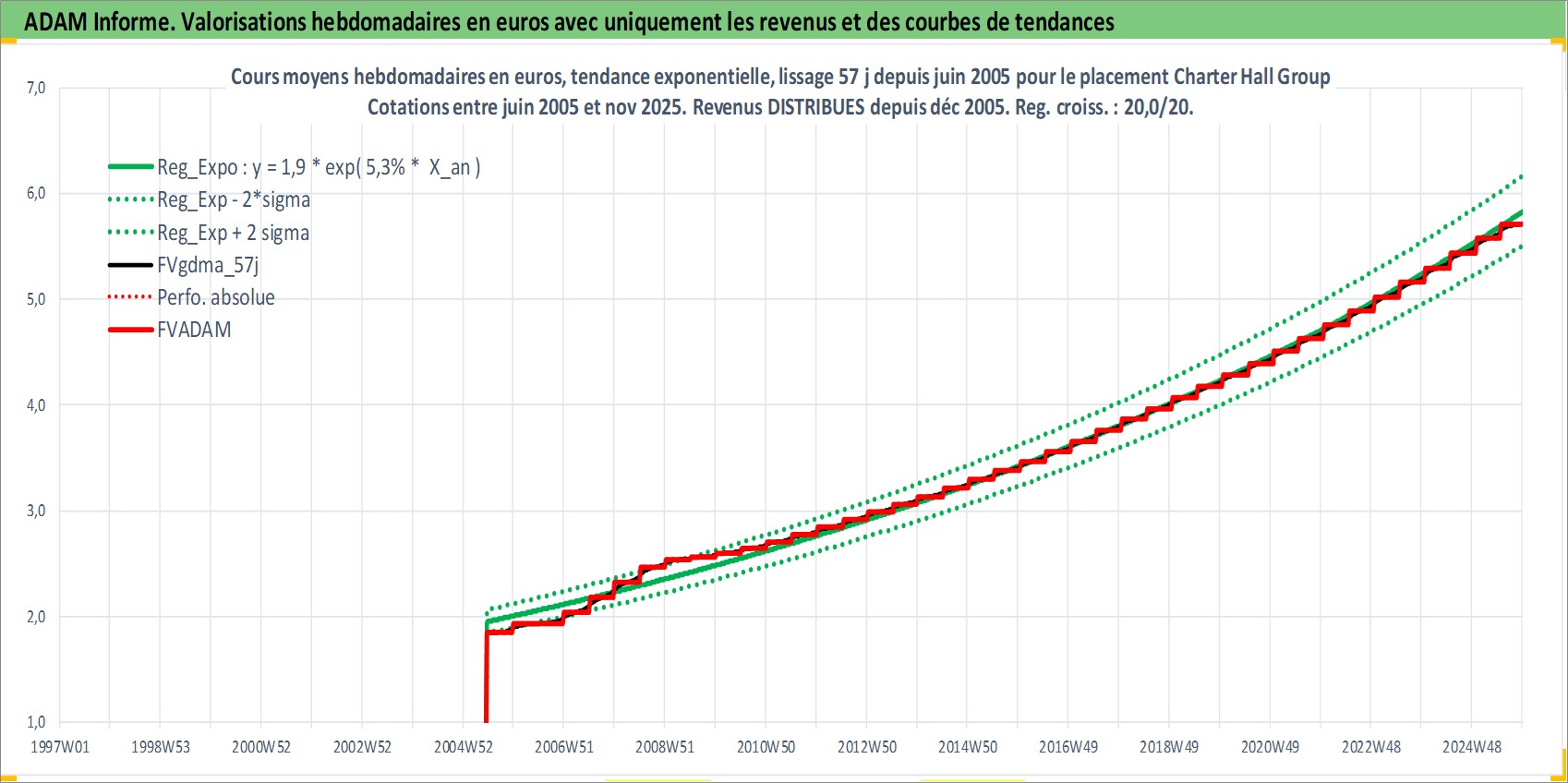 Site dédié aux investisseursPage dédiée sur site financeAnalyse des valorisations hebdomadaires de l'action Charter Hall Group. Cet actif est cote en AUD. Les valorisations sont en contrevaleur EURO et couvrent les semaines 2005W23 a 2025W48. Les revenus de cet actif financier sont pris en compte depuis la semaine 2005W51. La note ESG de cet actif n'est pas connue.