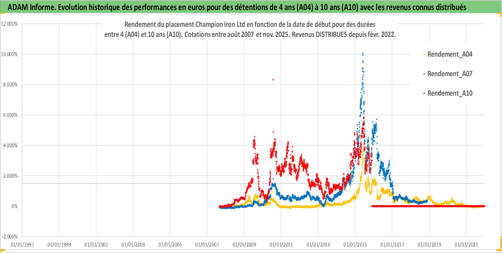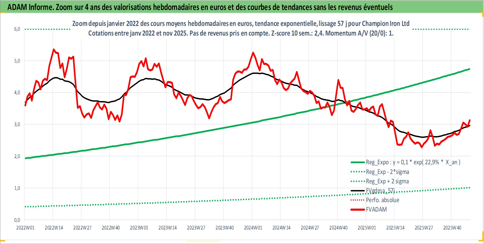 Site dédié aux investisseursPage dédiée sur site financeAnalyse des valorisations hebdomadaires de l'action Champion Iron Ltd. Cet actif est cote en AUD. Les valorisations sont en contrevaleur EURO et couvrent les semaines 2007W34 a 2025W48. Les revenus de cet actif financier sont pris en compte depuis la semaine 2022W05. La note ESG de cet actif n'est pas connue.