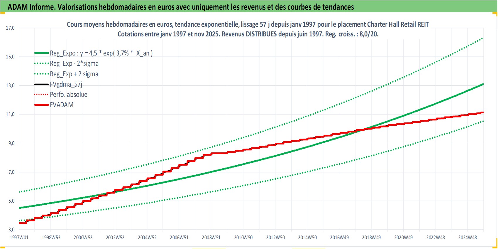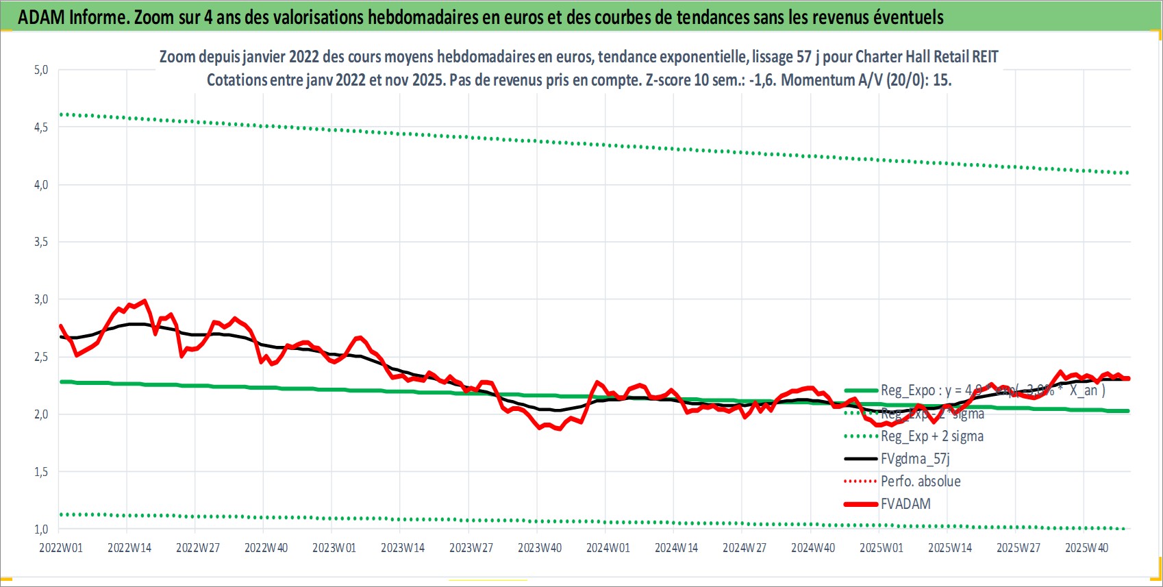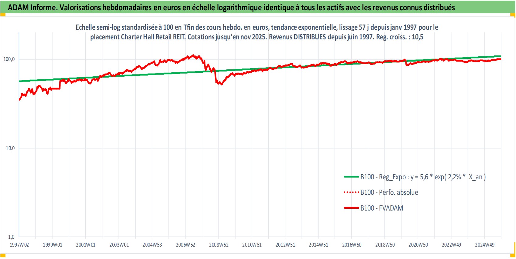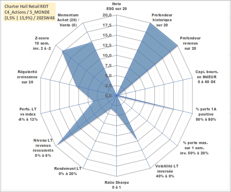 Site dédié aux investisseursPage dédiée sur site financeAnalyse des valorisations hebdomadaires de l'action Charter Hall Retail REIT. Cet actif est cote en AUD. Les valorisations sont en contrevaleur EURO et couvrent les semaines 1997W01 a 2025W48. Les revenus de cet actif financier sont pris en compte depuis la semaine 1997W26. La note ESG de cet actif n'est pas connue.