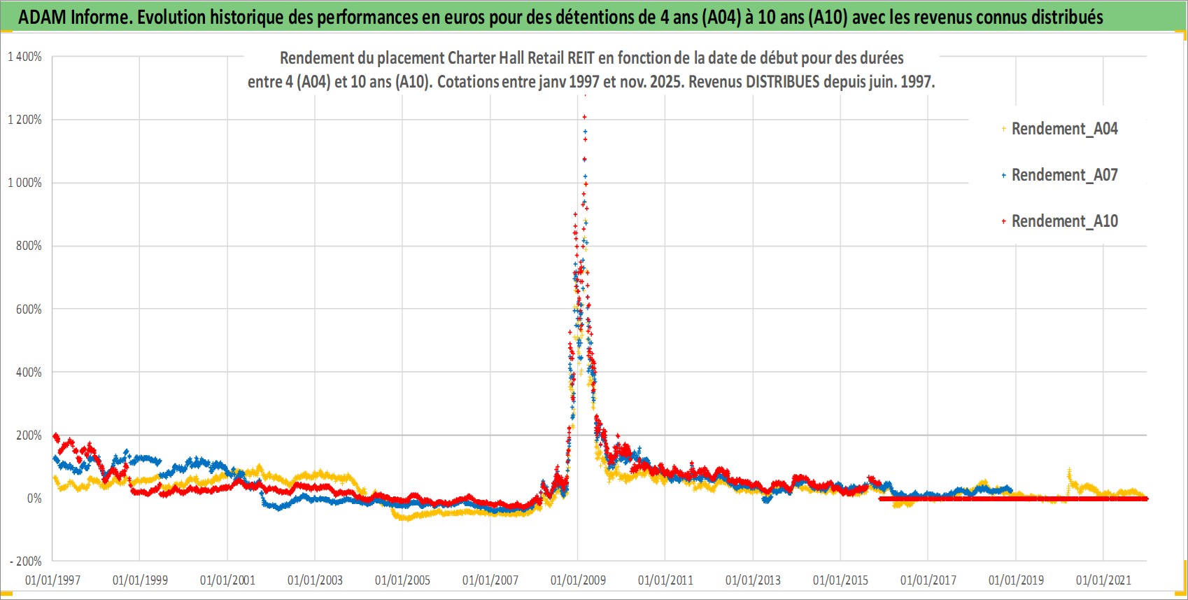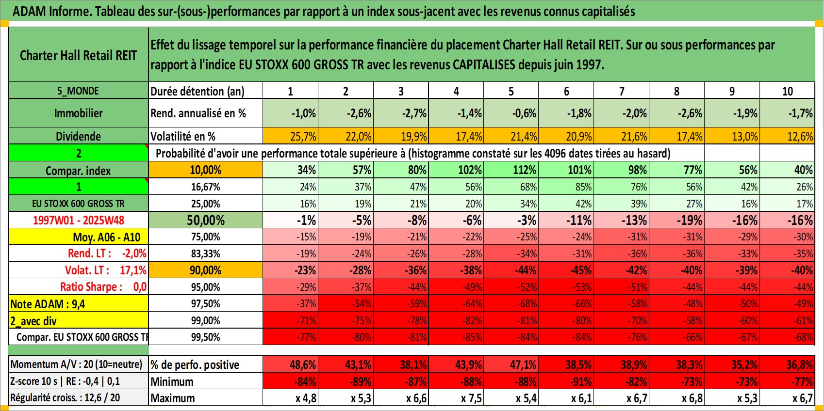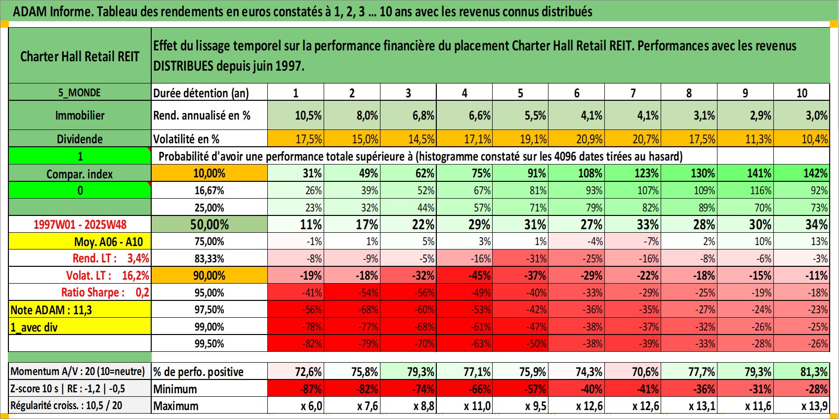 Site dédié aux investisseursPage dédiée sur site financeAnalyse des valorisations hebdomadaires de l'action Charter Hall Retail REIT. Cet actif est cote en AUD. Les valorisations sont en contrevaleur EURO et couvrent les semaines 1997W01 a 2025W48. Les revenus de cet actif financier sont pris en compte depuis la semaine 1997W26. La note ESG de cet actif n'est pas connue.