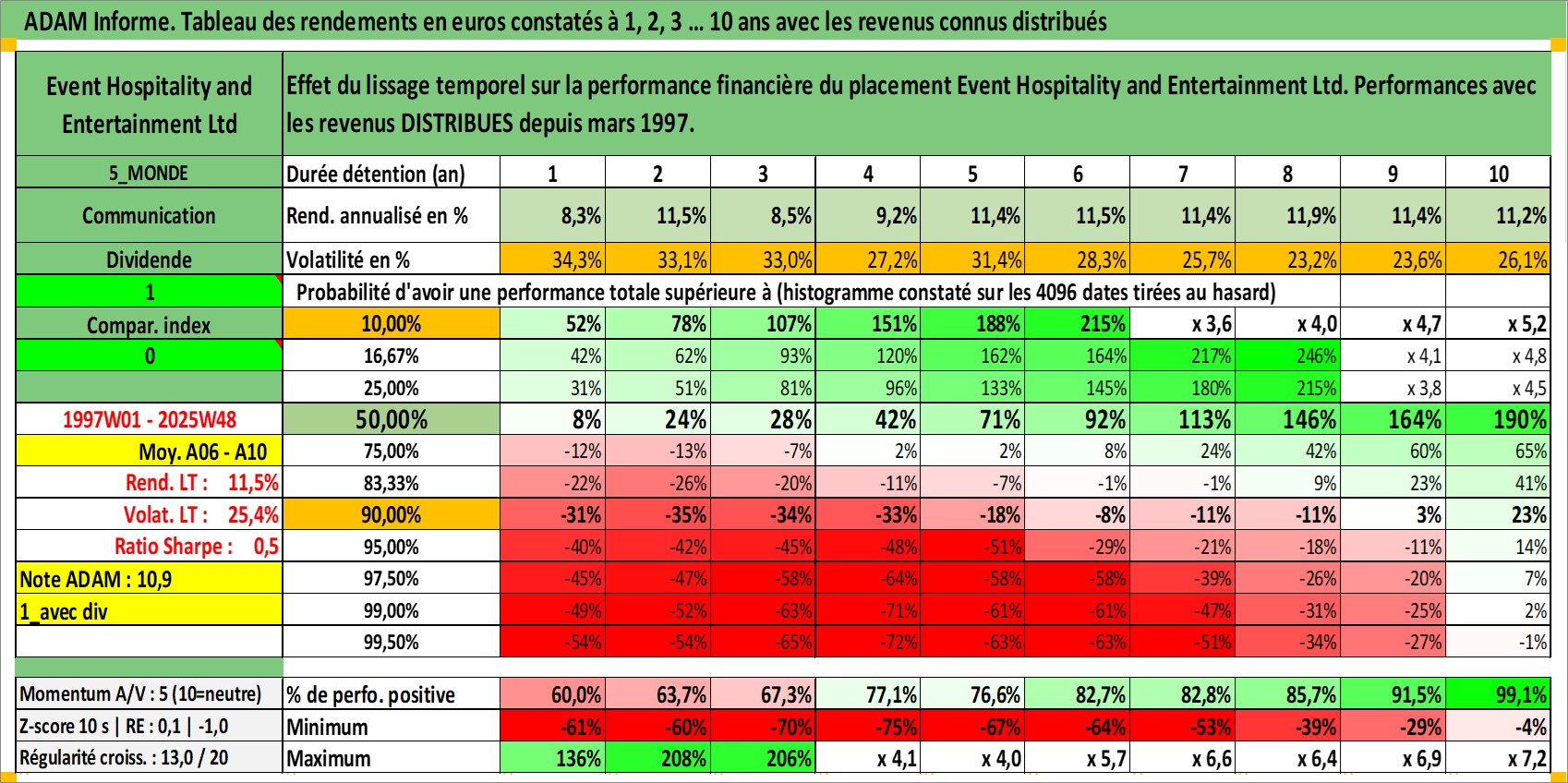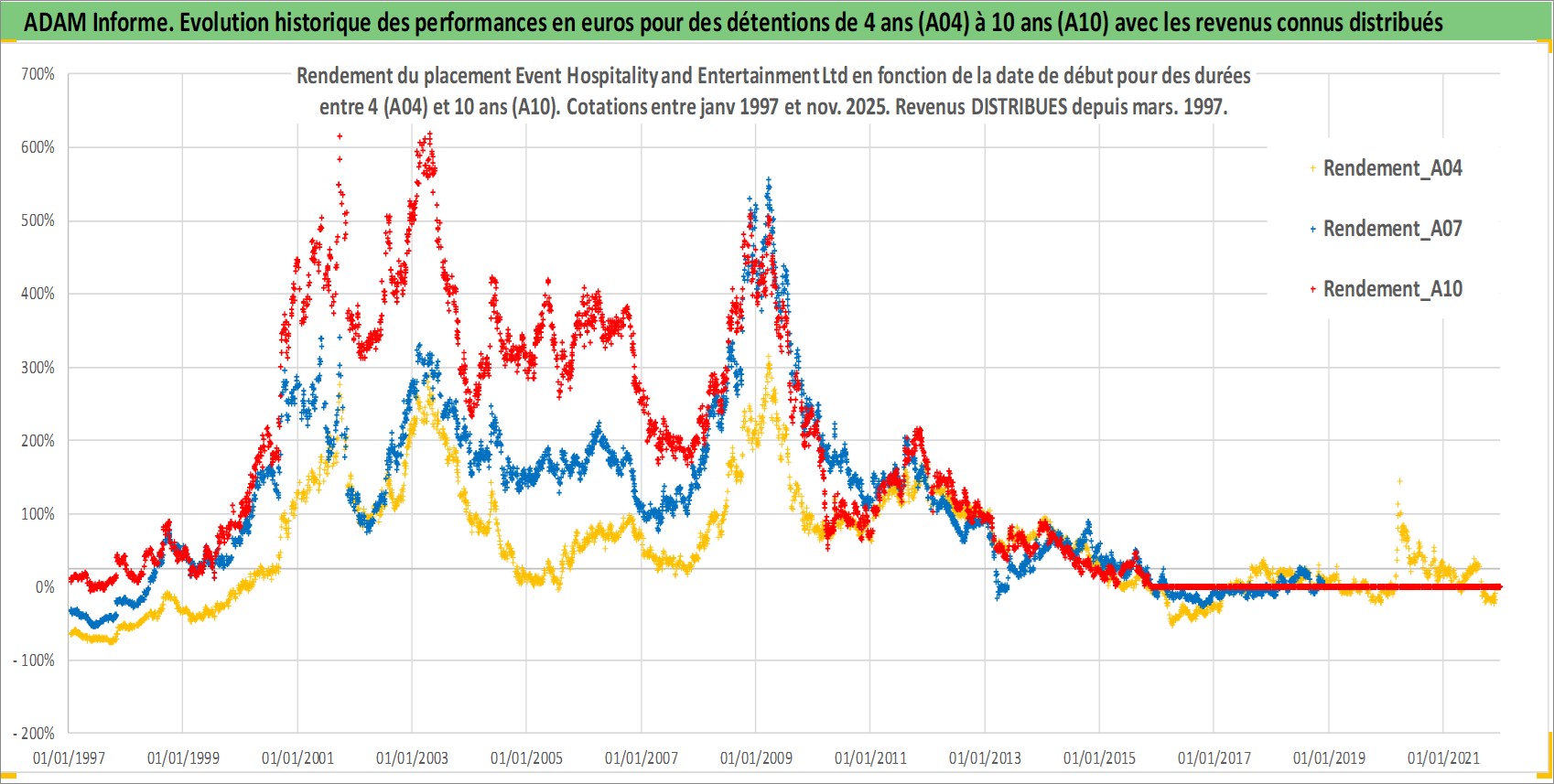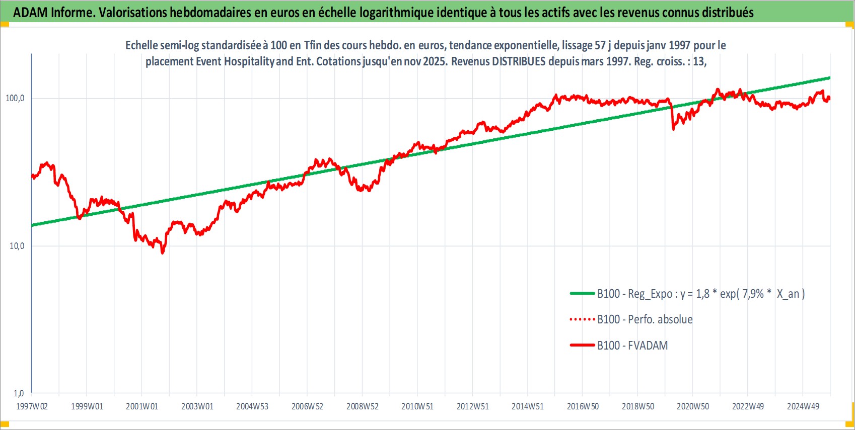 Site dédié aux investisseursPage dédiée sur site financeAnalyse des valorisations hebdomadaires de l'action Event Hospitality and Entertainment Ltd. Cet actif est cote en AUD. Les valorisations sont en contrevaleur EURO et couvrent les semaines 1997W01 a 2025W48. Les revenus de cet actif financier sont pris en compte depuis la semaine 1997W12. La note ESG de cet actif n'est pas connue.