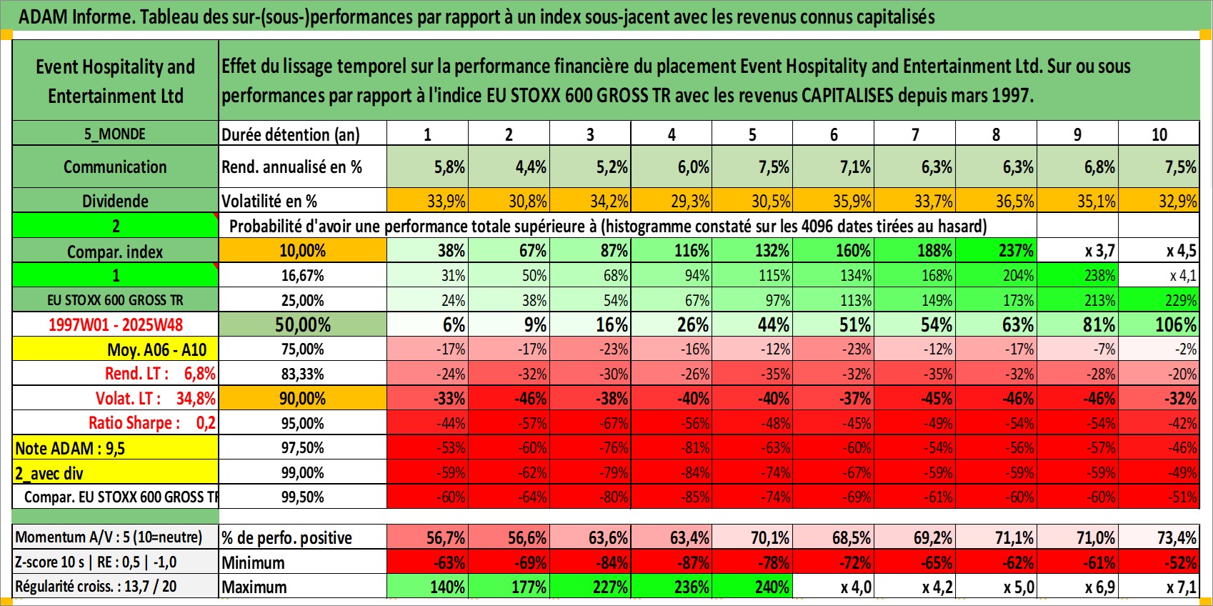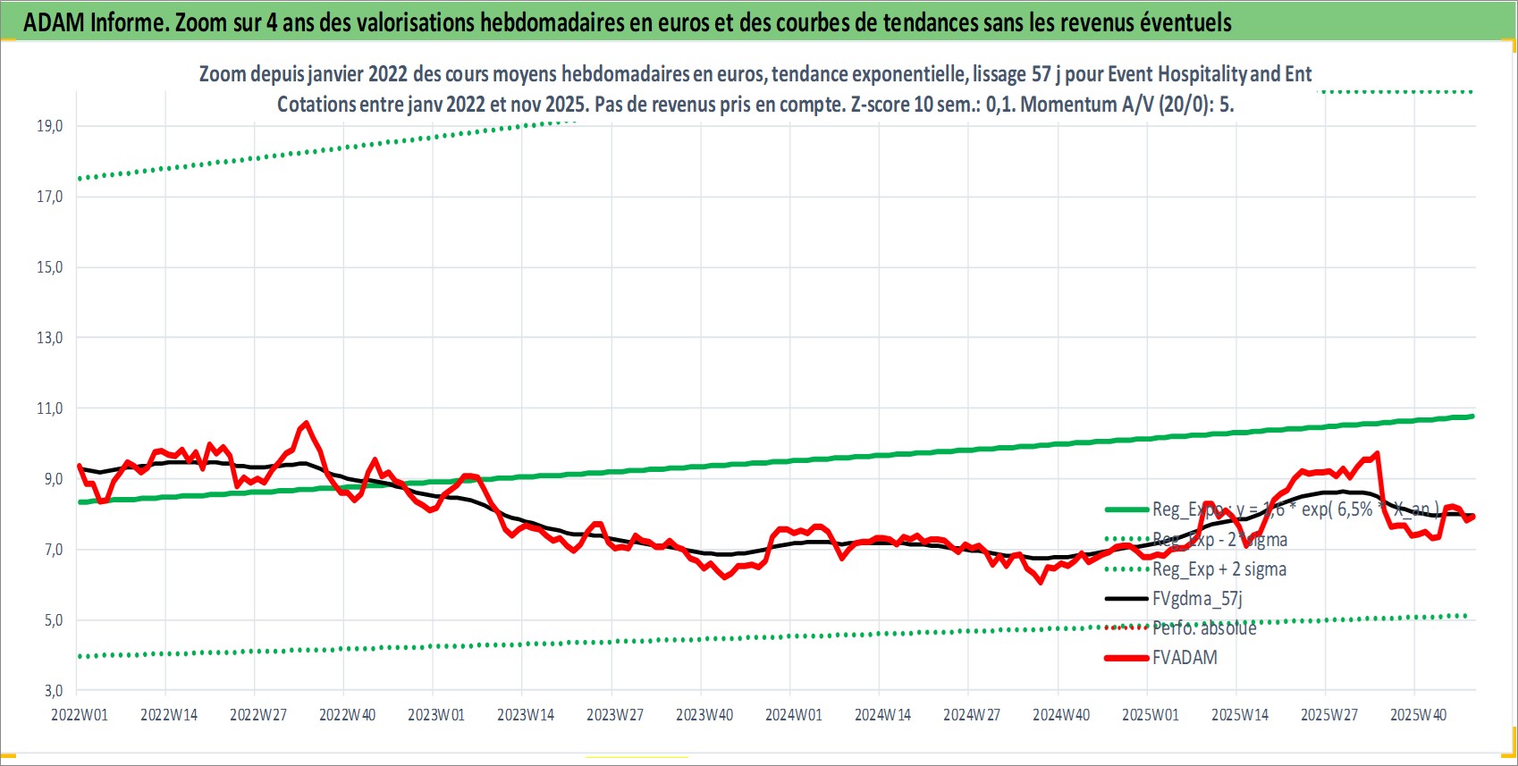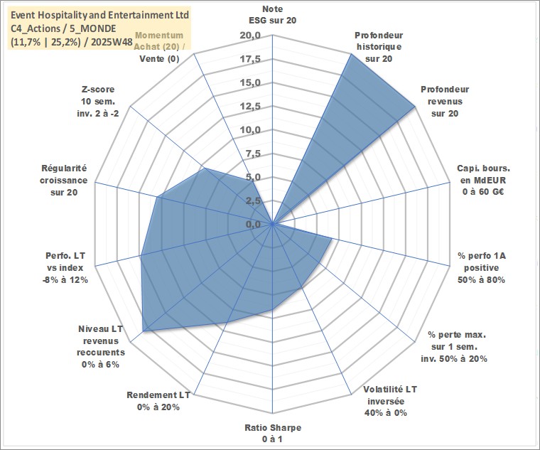 Site dédié aux investisseursPage dédiée sur site financeAnalyse des valorisations hebdomadaires de l'action Event Hospitality and Entertainment Ltd. Cet actif est cote en AUD. Les valorisations sont en contrevaleur EURO et couvrent les semaines 1997W01 a 2025W48. Les revenus de cet actif financier sont pris en compte depuis la semaine 1997W12. La note ESG de cet actif n'est pas connue.