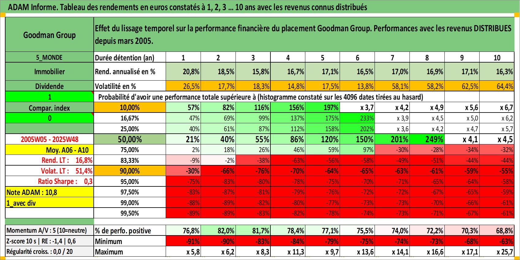 Site dédié aux investisseursPage dédiée sur site financeAnalyse des valorisations hebdomadaires de l'action Goodman Group. Cet actif est cote en AUD. Les valorisations sont en contrevaleur EURO et couvrent les semaines 2005W05 a 2025W48. Les revenus de cet actif financier sont pris en compte depuis la semaine 2005W12. La note globale ESG de cet actif est estimee a 17.0 (apres rebasage entre 0 et 20).