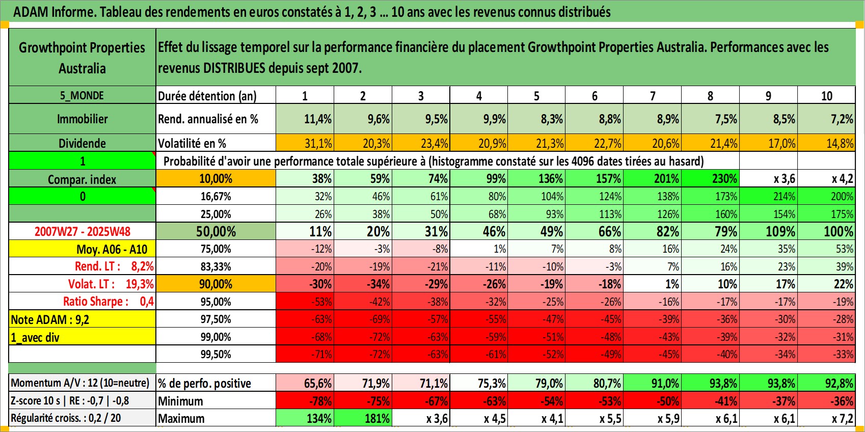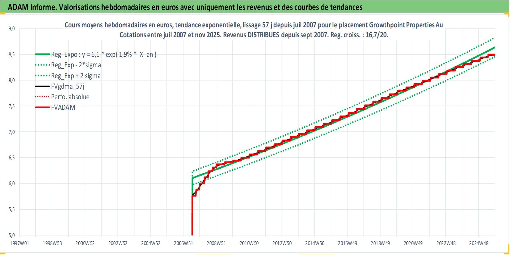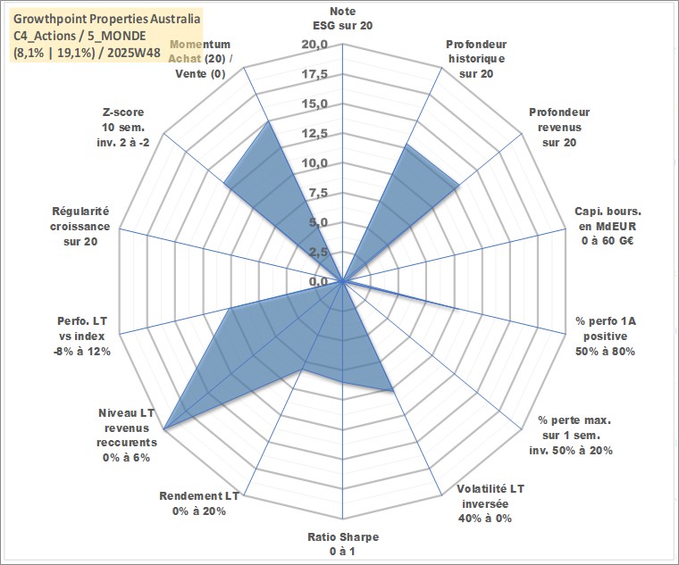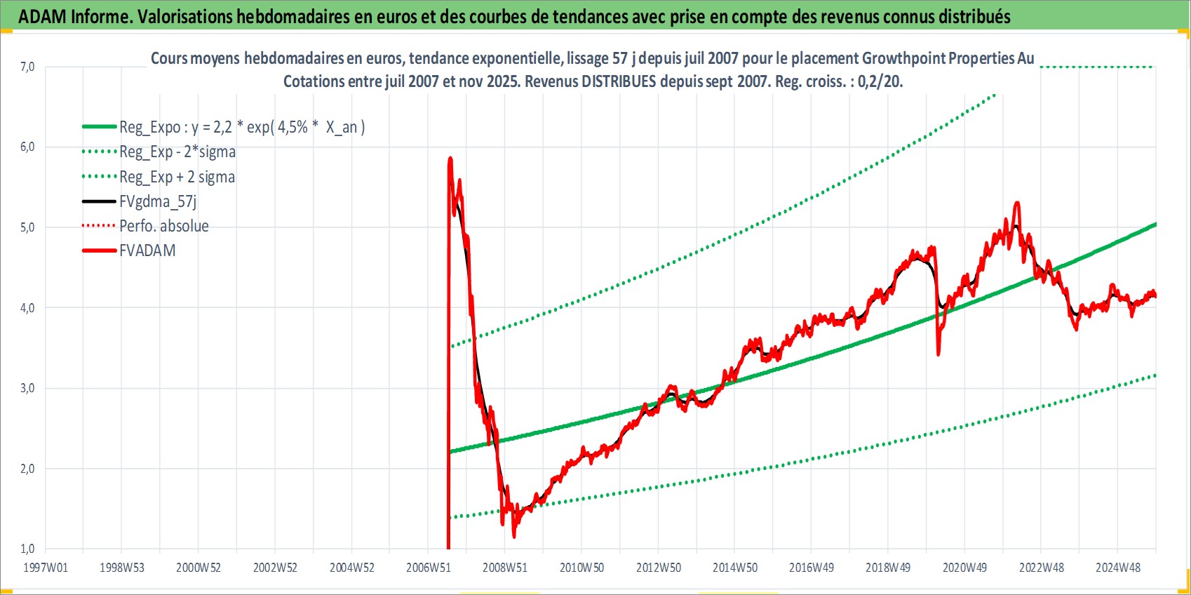 Site dédié aux investisseursPage dédiée sur site financeAnalyse des valorisations hebdomadaires de l'action Growthpoint Properties Australia. Cet actif est cote en AUD. Les valorisations sont en contrevaleur EURO et couvrent les semaines 2007W27 a 2025W48. Les revenus de cet actif financier sont pris en compte depuis la semaine 2007W39. La note ESG de cet actif n'est pas connue.