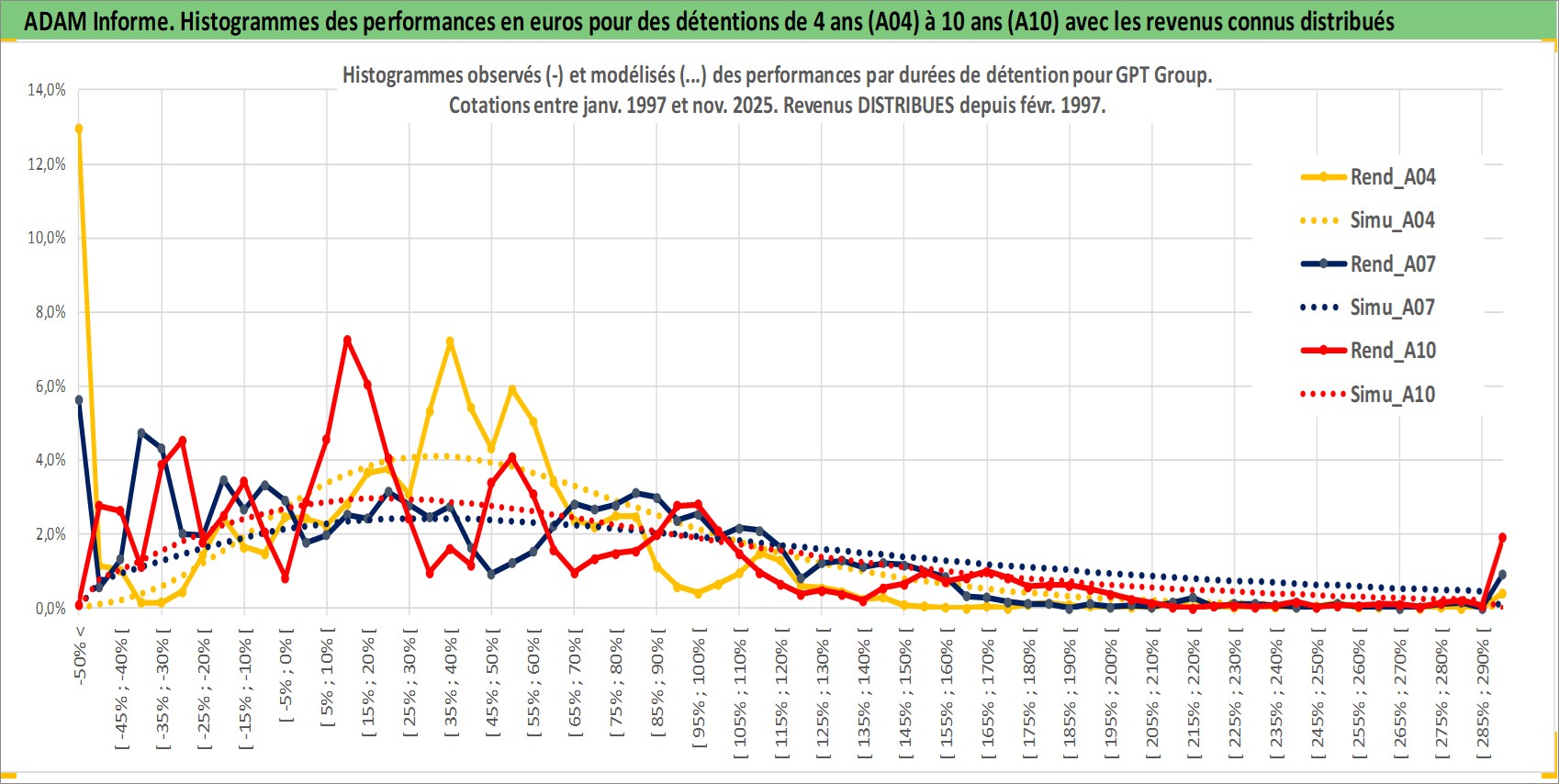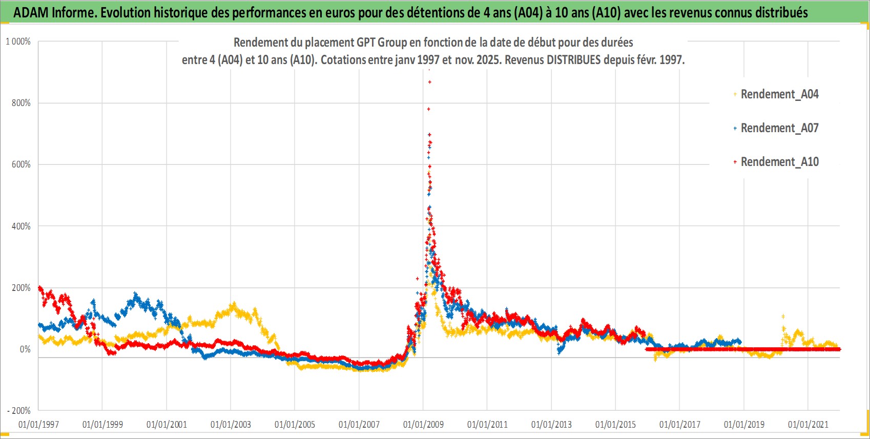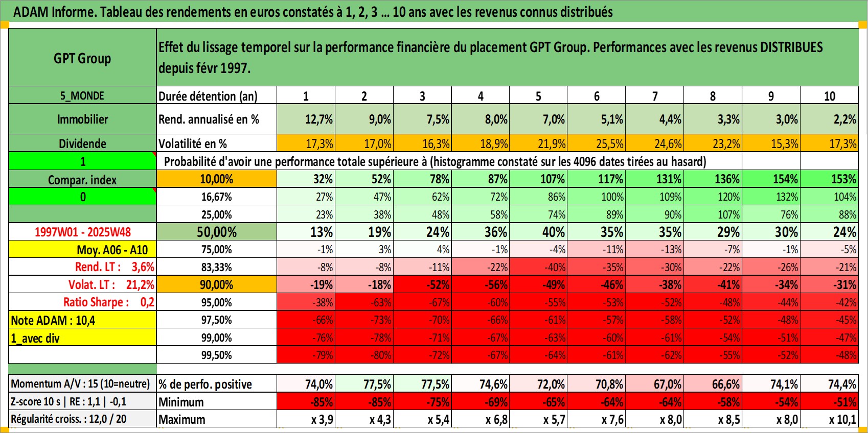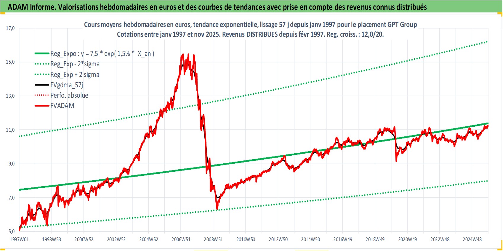 Site dédié aux investisseursPage dédiée sur site financeAnalyse des valorisations hebdomadaires de l'action GPT Group. Cet actif est cote en AUD. Les valorisations sont en contrevaleur EURO et couvrent les semaines 1997W01 a 2025W48. Les revenus de cet actif financier sont pris en compte depuis la semaine 1997W06. La note globale ESG de cet actif est estimee a 17.0 (apres rebasage entre 0 et 20).