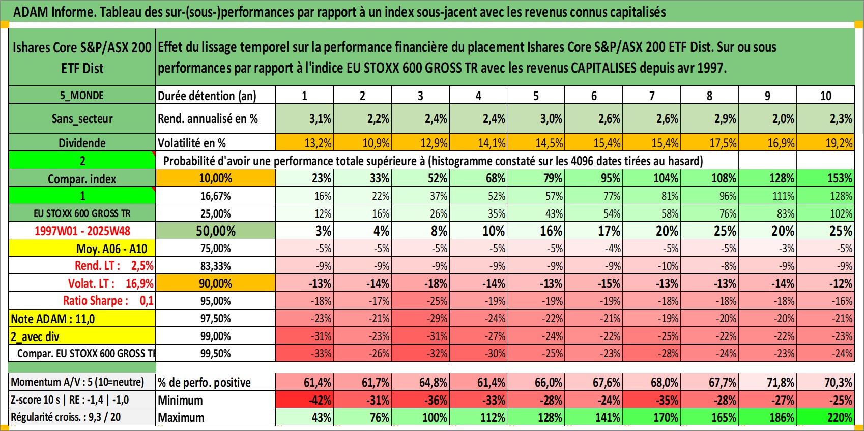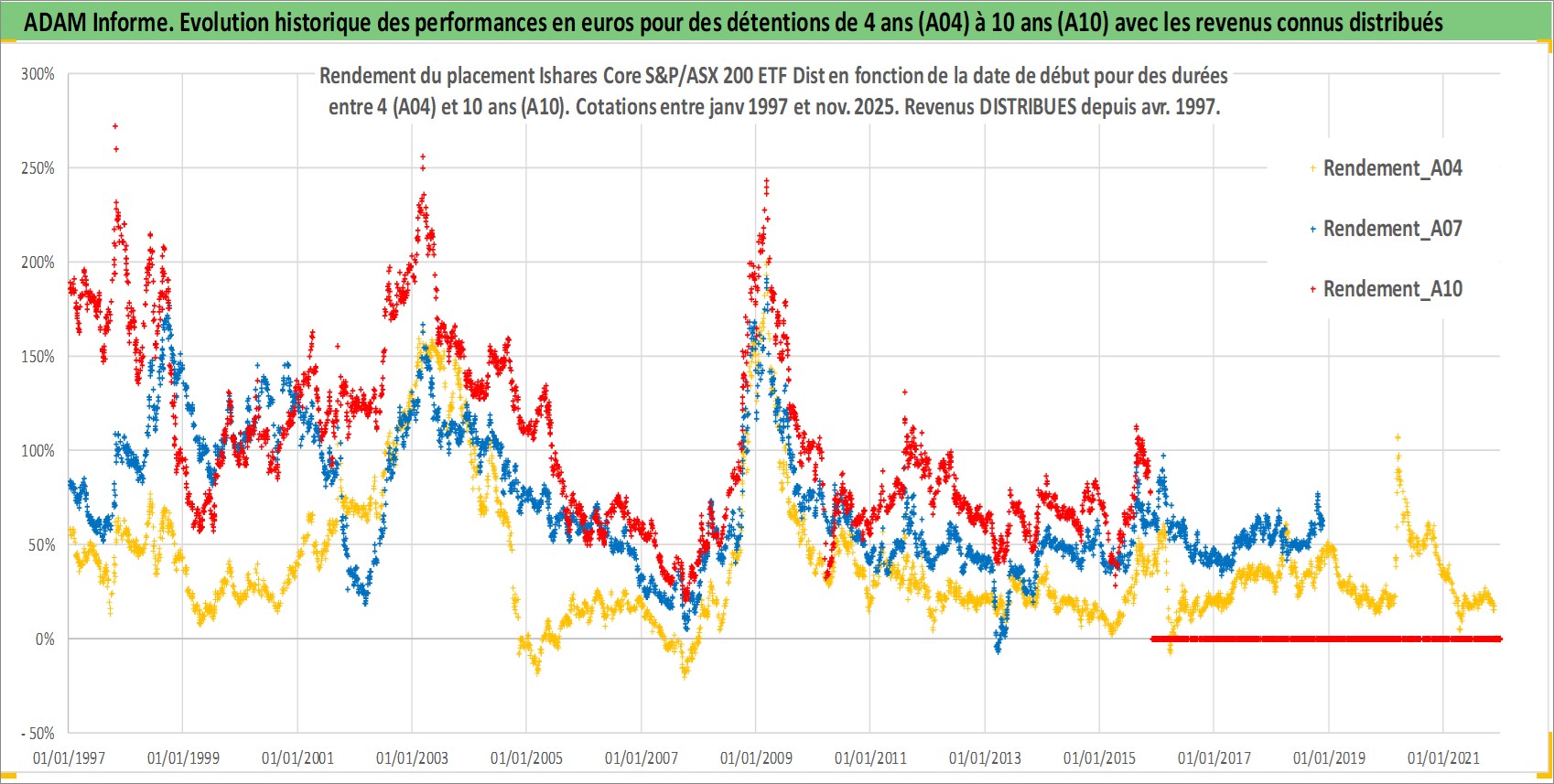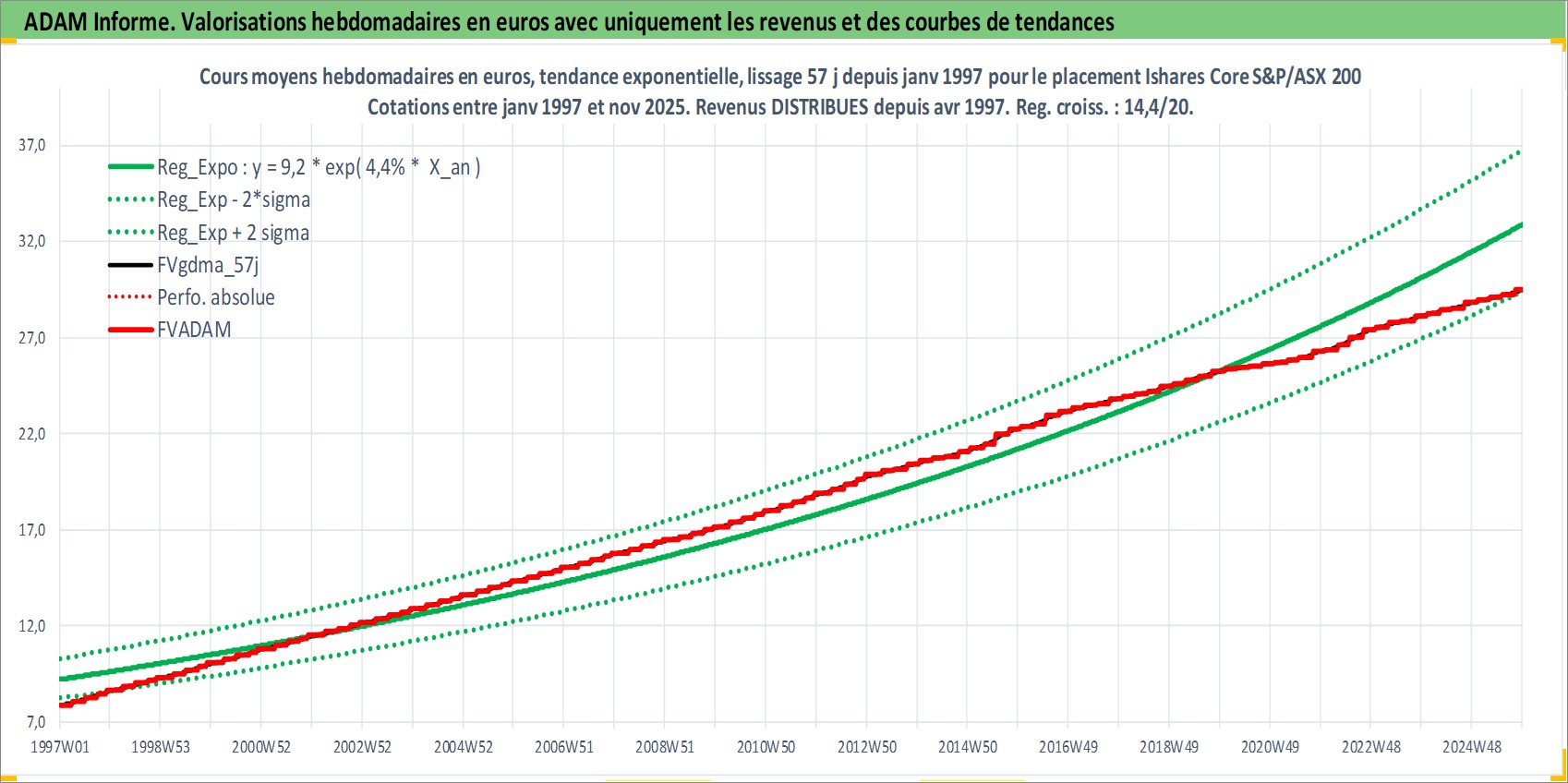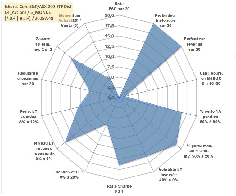 Site dédié aux investisseursPage dédiée sur site financeAnalyse des valorisations hebdomadaires du fonds Ishares Core S&P/ASX 200 ETF Dist. Cet actif est cote en AUD. Les valorisations sont en contrevaleur EURO et couvrent les semaines 1997W01 a 2025W48. Les revenus de cet actif financier sont pris en compte depuis la semaine 1997W14. La note ESG de cet actif n'est pas connue.